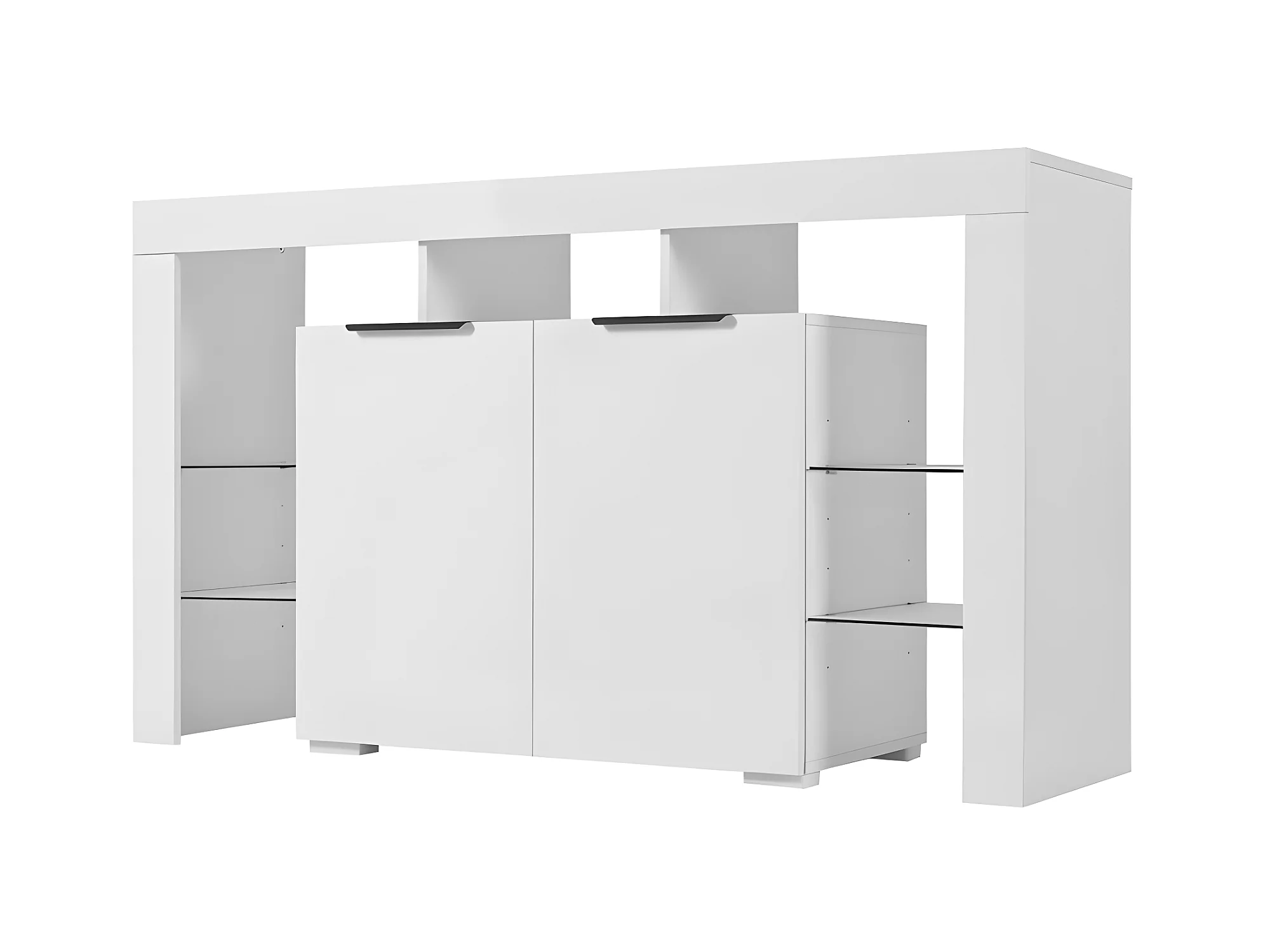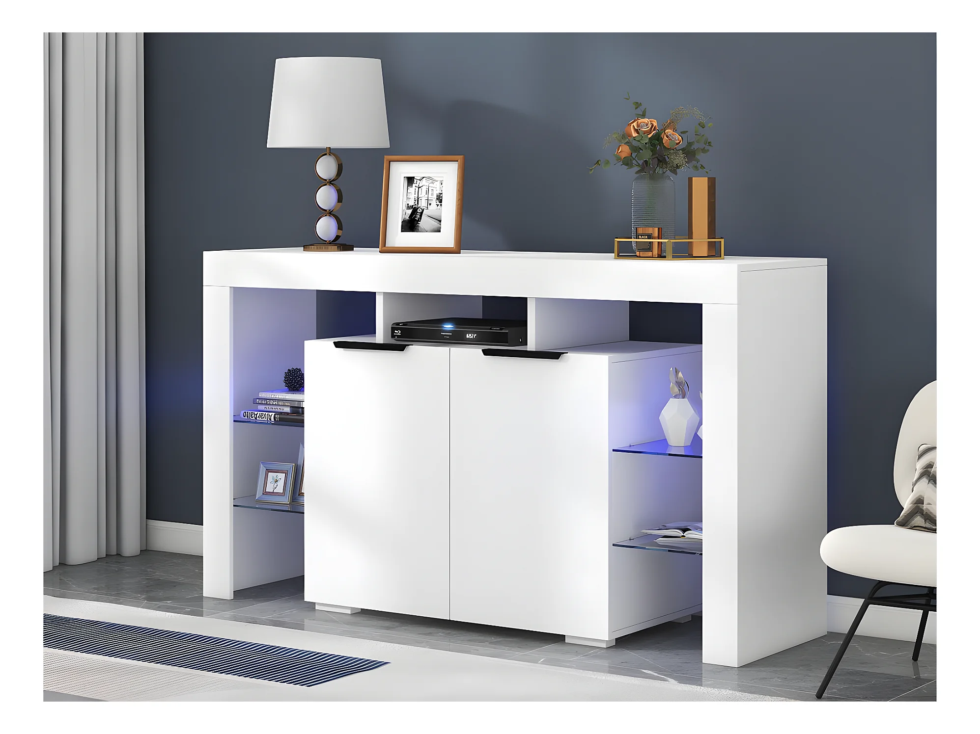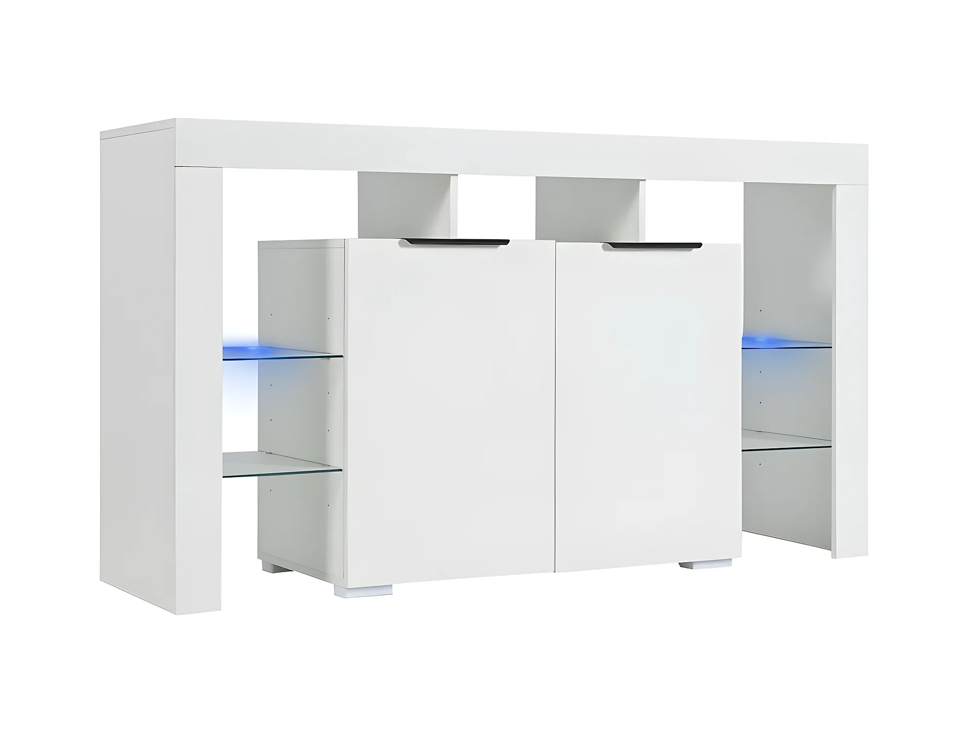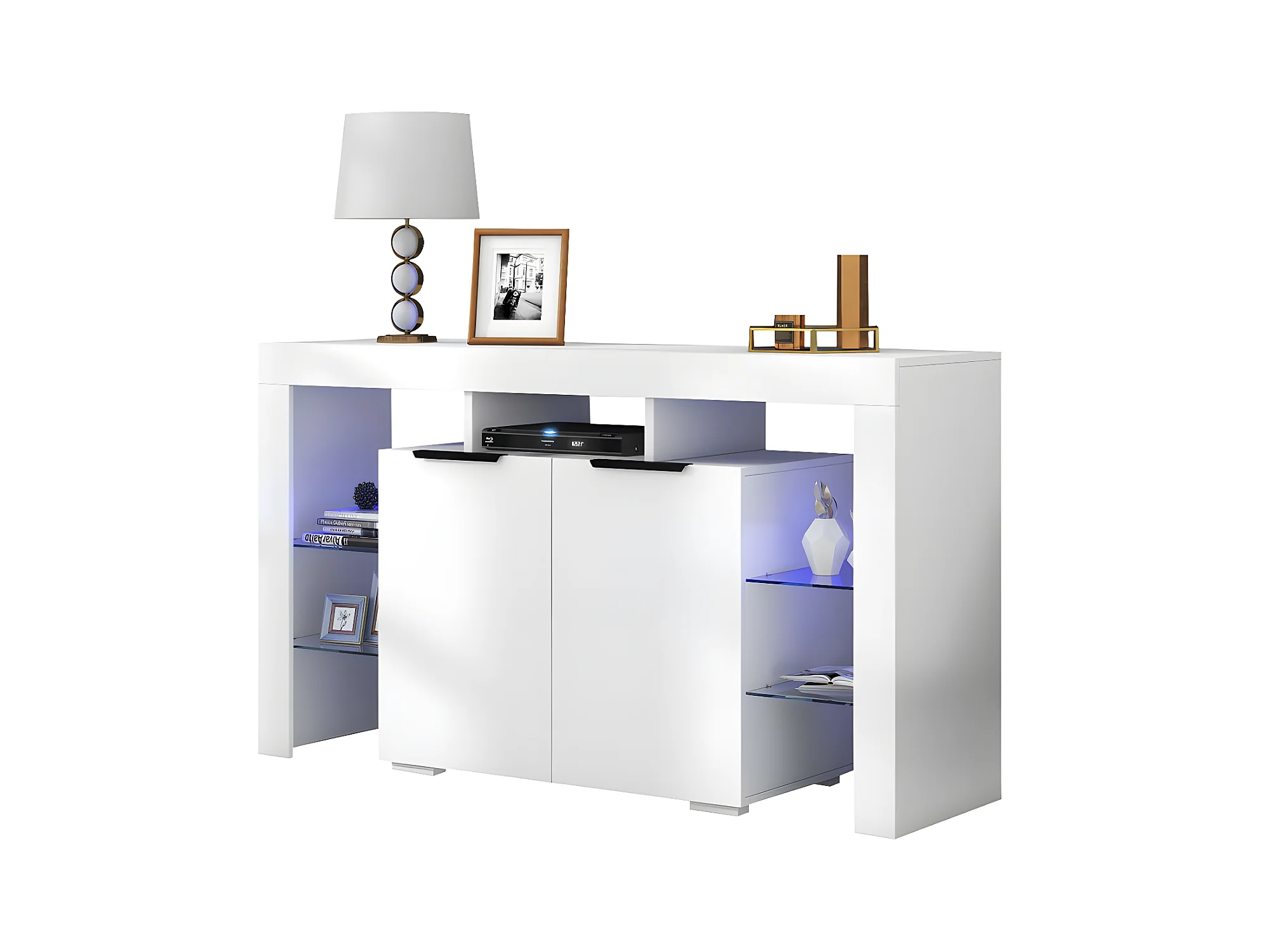 Niedriges Sideboard mit LED-Beleuchtung – 4 Glasböden und 2 Türen – Weiß
