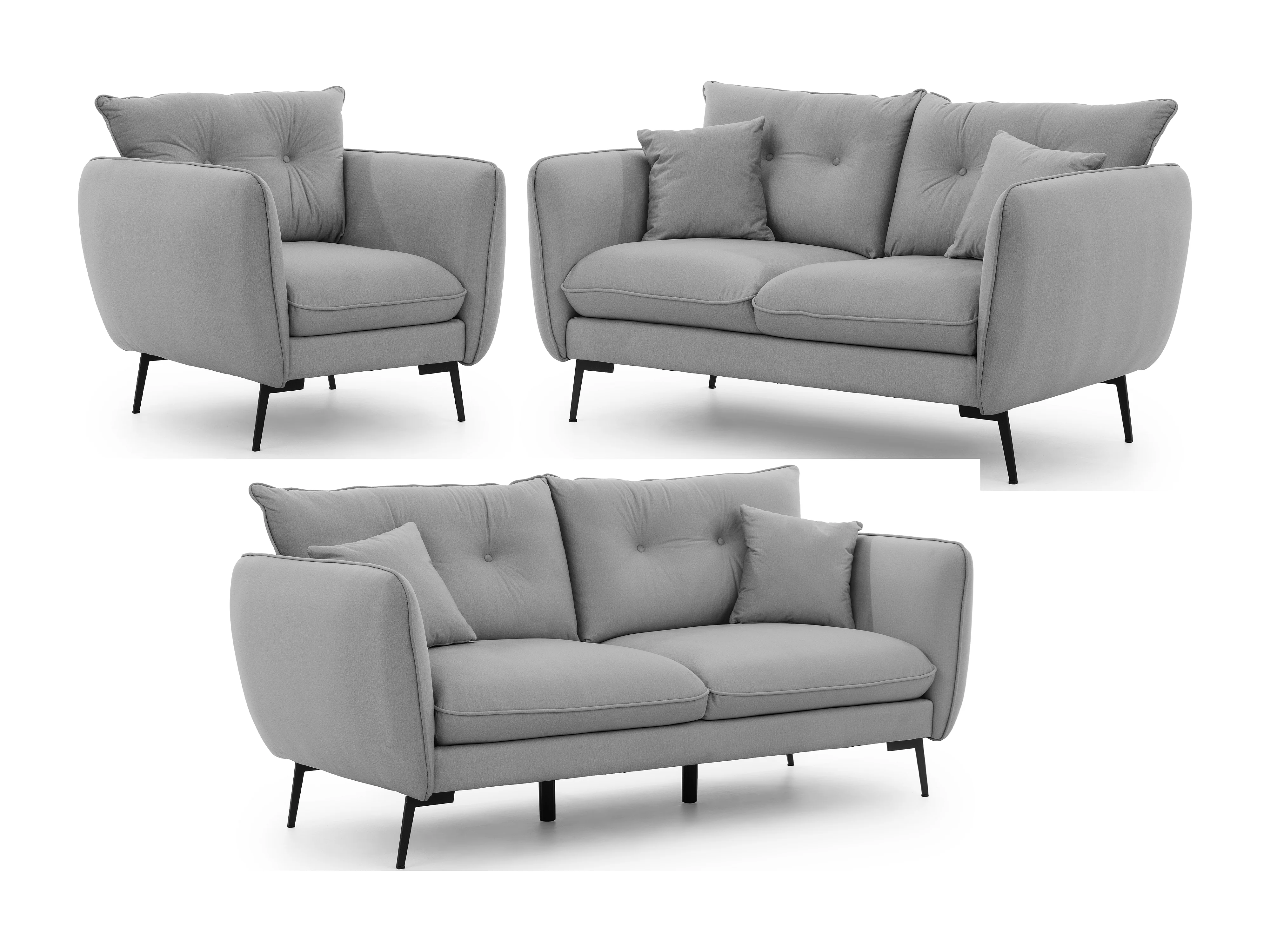 Nordloft - Modernes Polstergarnitur 3+2+1 aus Hellgrau Samt-Stoff mit Hohen Schwarzen Metallfüßen und schöner Sitzkomfort