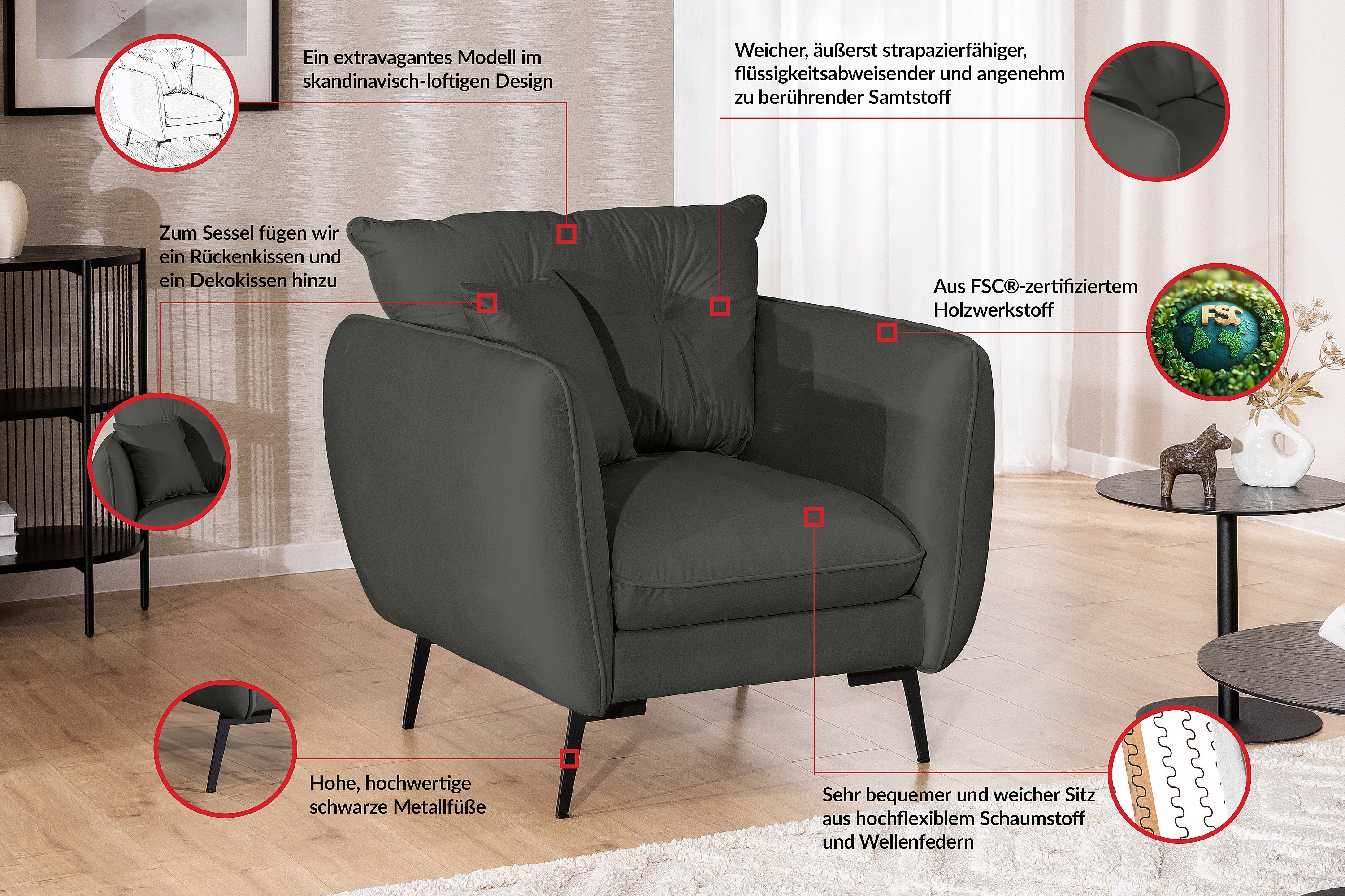 Nordloft - Modernes Sessel aus Dunkelgrau Samt-Stoff mit Hohen Schwarzen Metallfüßen und schöner Sitzkomfort