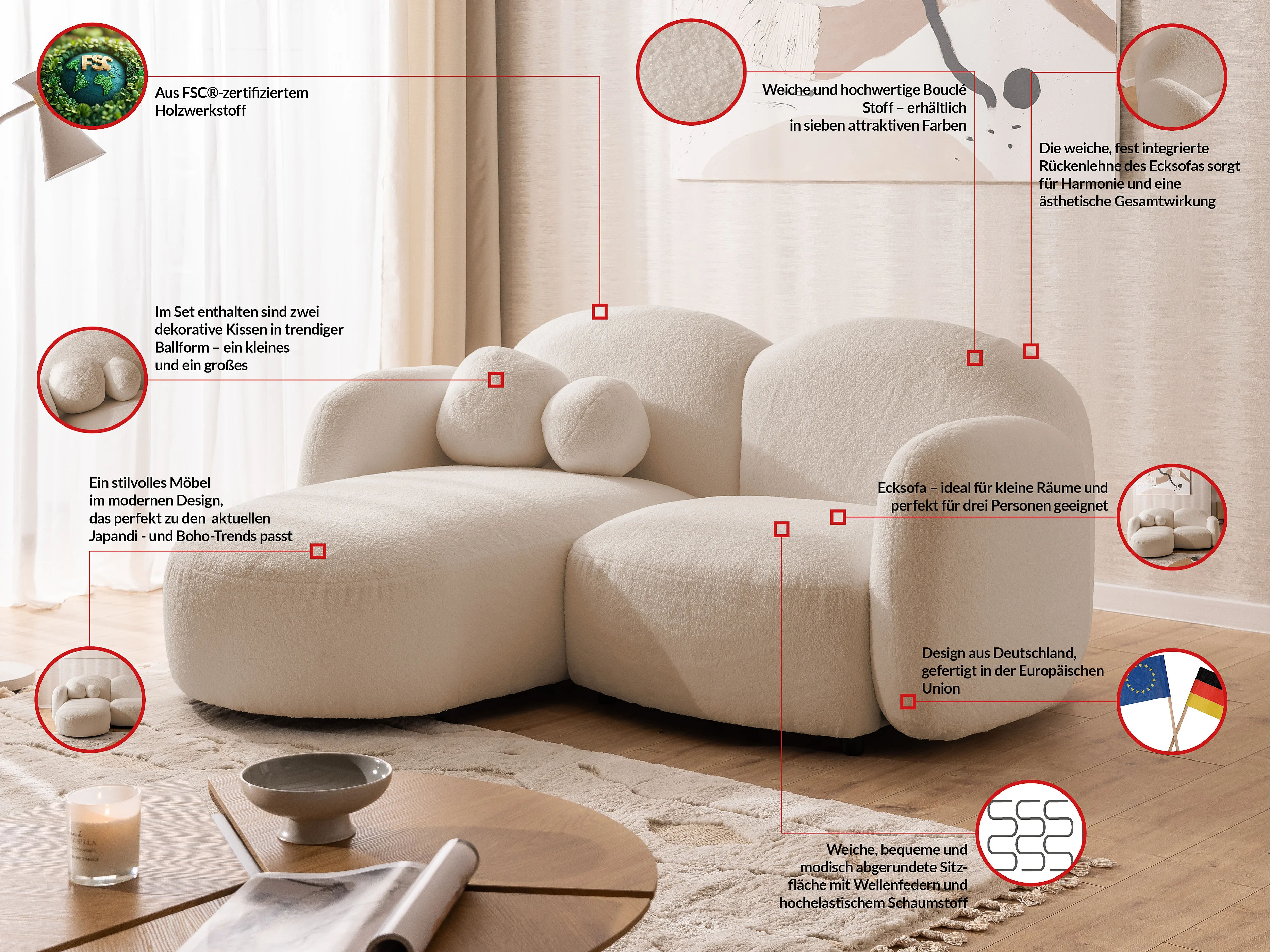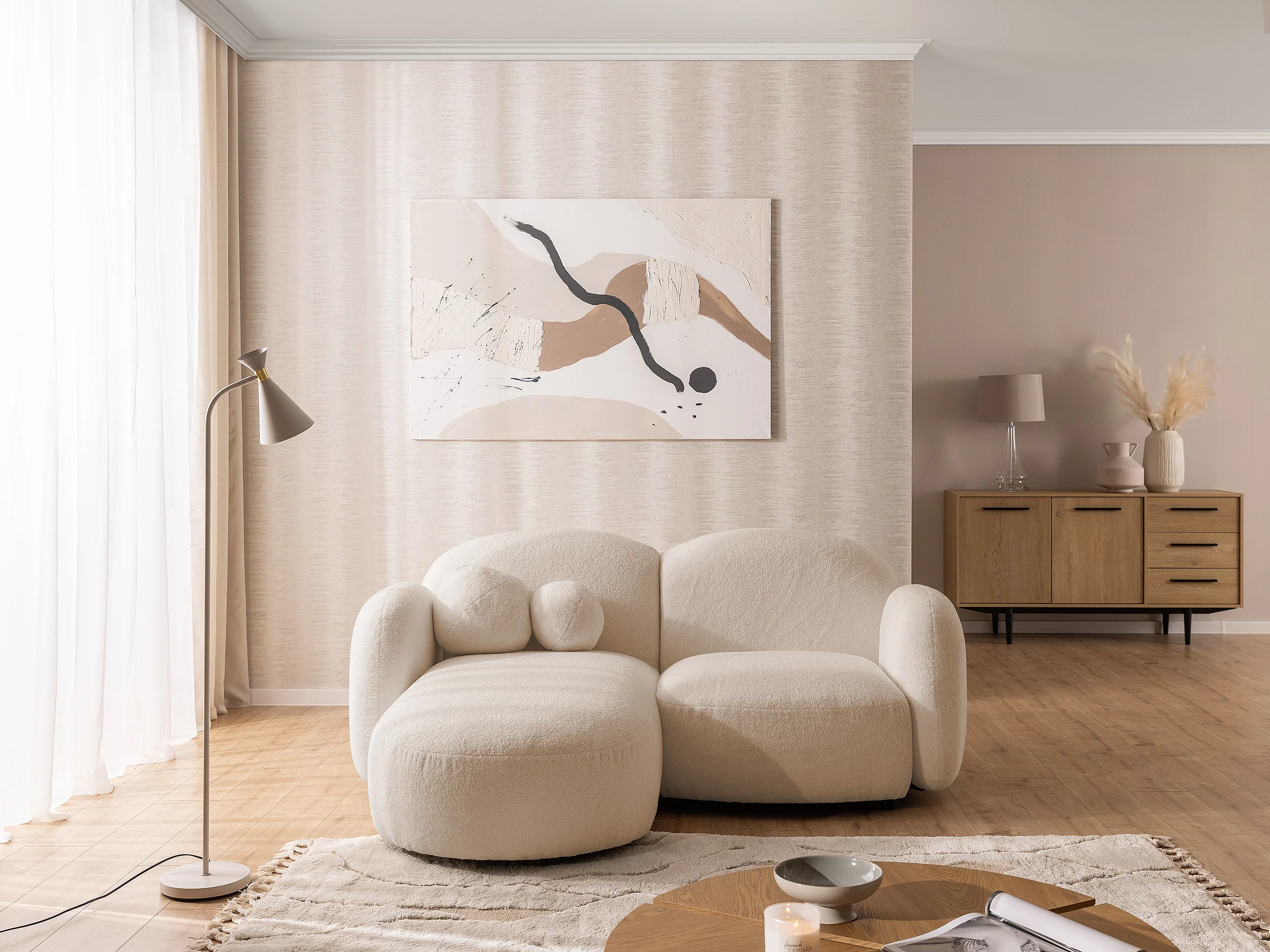 Nuvola - Moderne Ecksofa L-Form aus Hellbeige Bouclé-Stoff mit abgerundetem Design und hohem Sitzkomfort