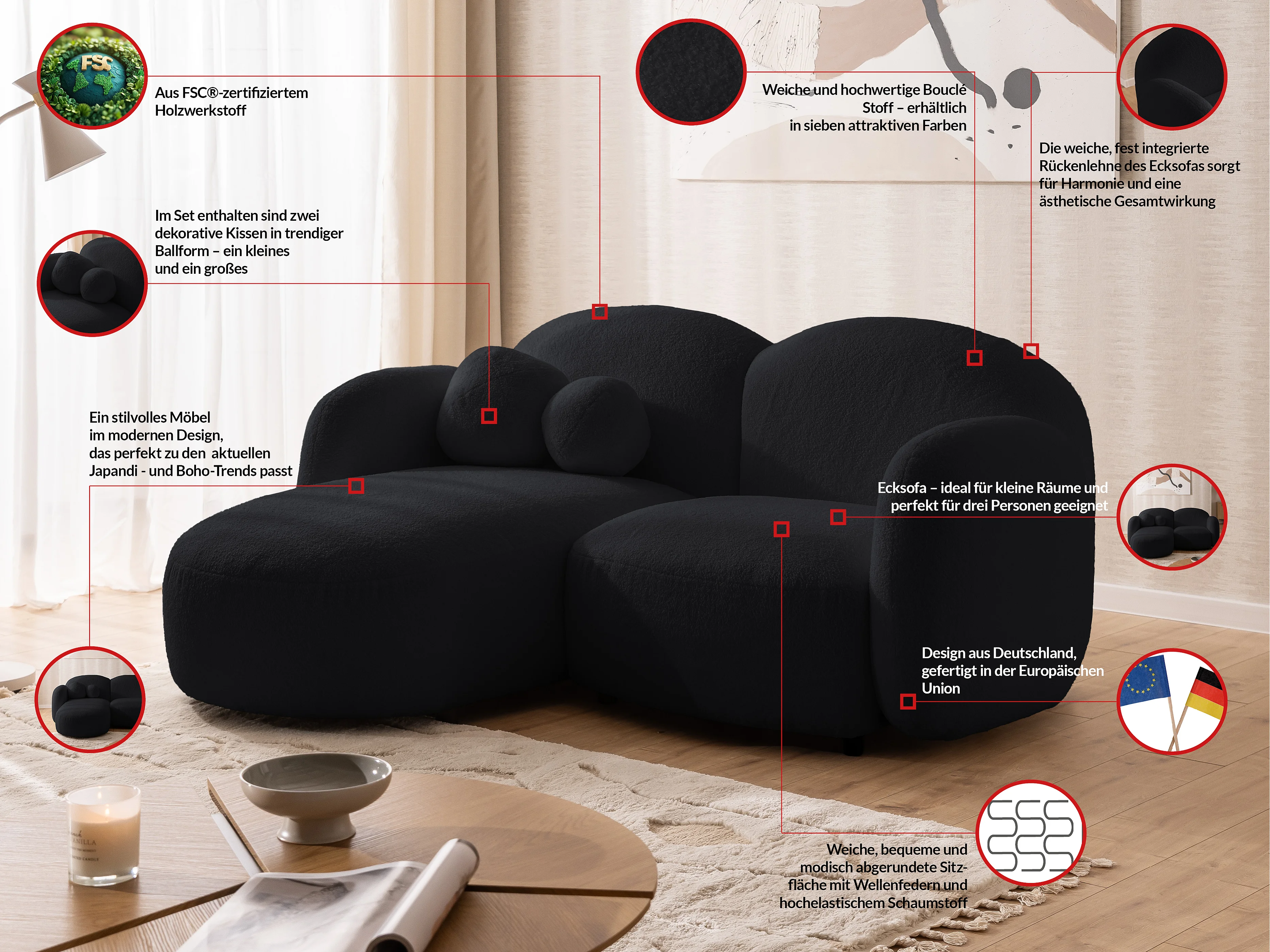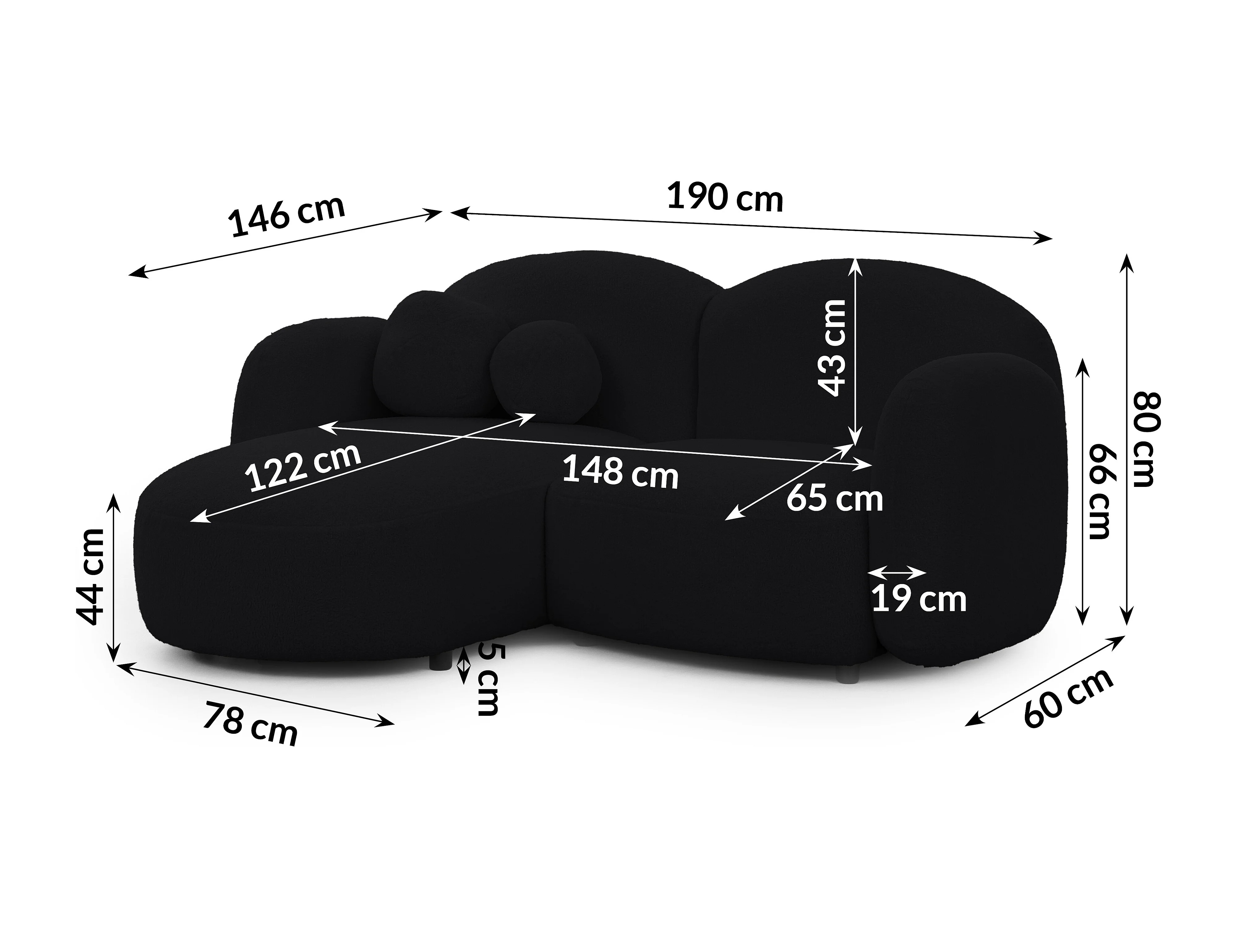 Nuvola - Moderne Ecksofa L-Form aus Schwarz Bouclé-Stoff mit abgerundetem Design und hohem Sitzkomfort