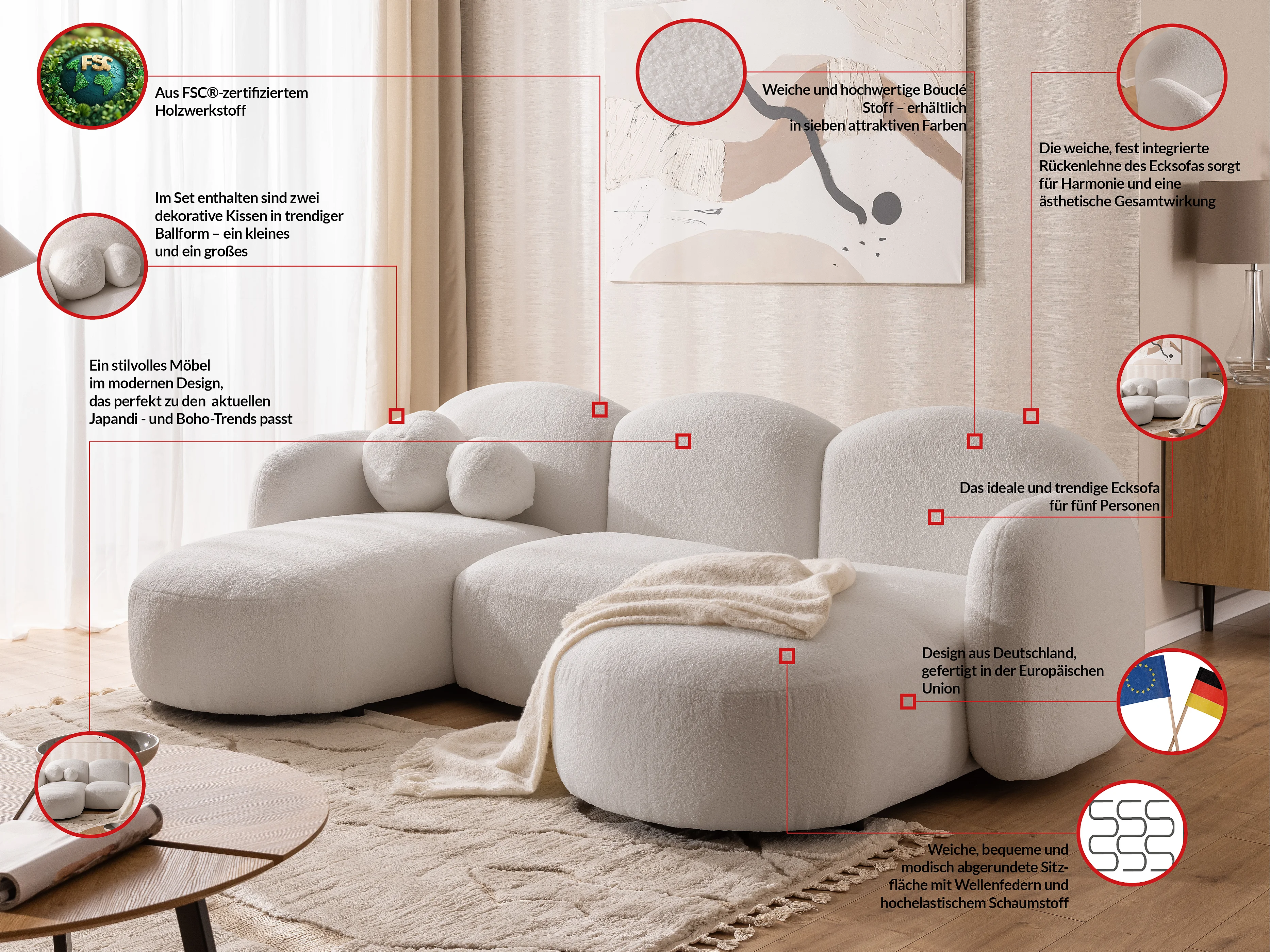 Nuvola - Moderne Wohnlandschaft aus Weiß Bouclé mit abgerundetem Design und hohem Sitzkomfort