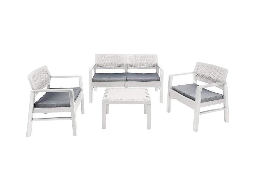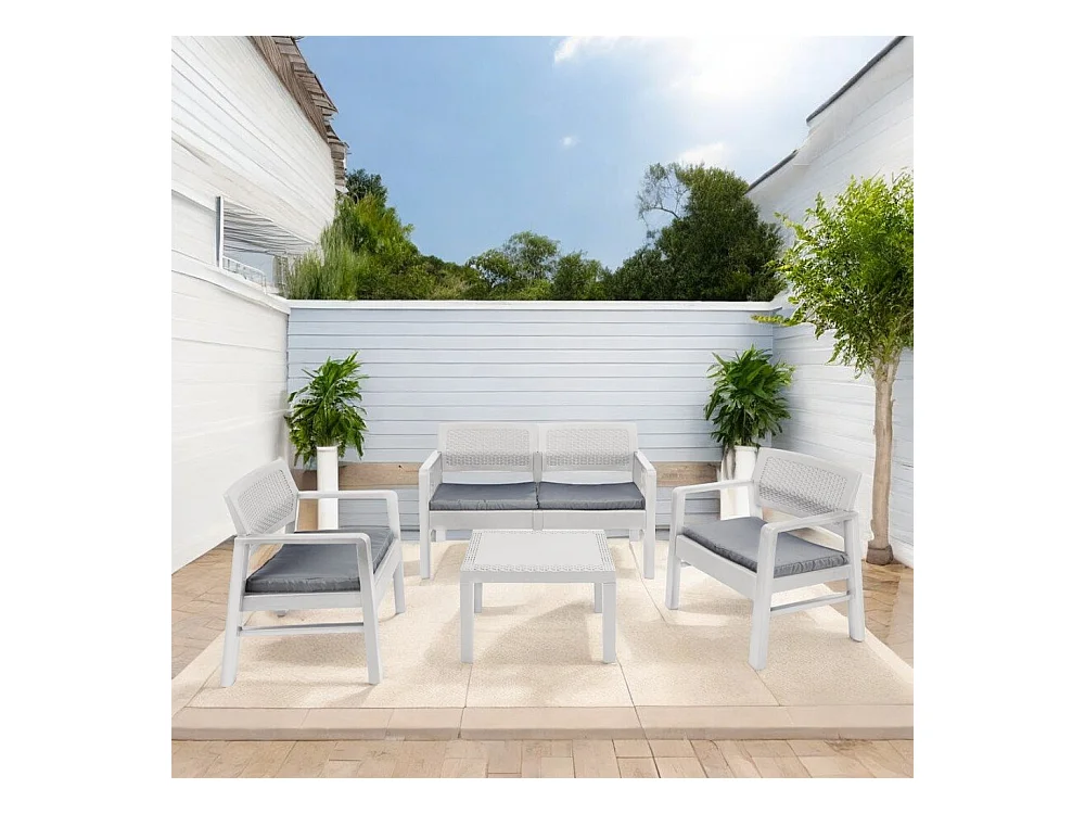 Outdoor-Lounge-Set Carpi, Gartengarnitur mit 2 Sesseln, 1 Sofa und 1 Couchtisch, Sitzecke in Rattan-Optik mit Kissen, 100 % Made in Italy, Weiß