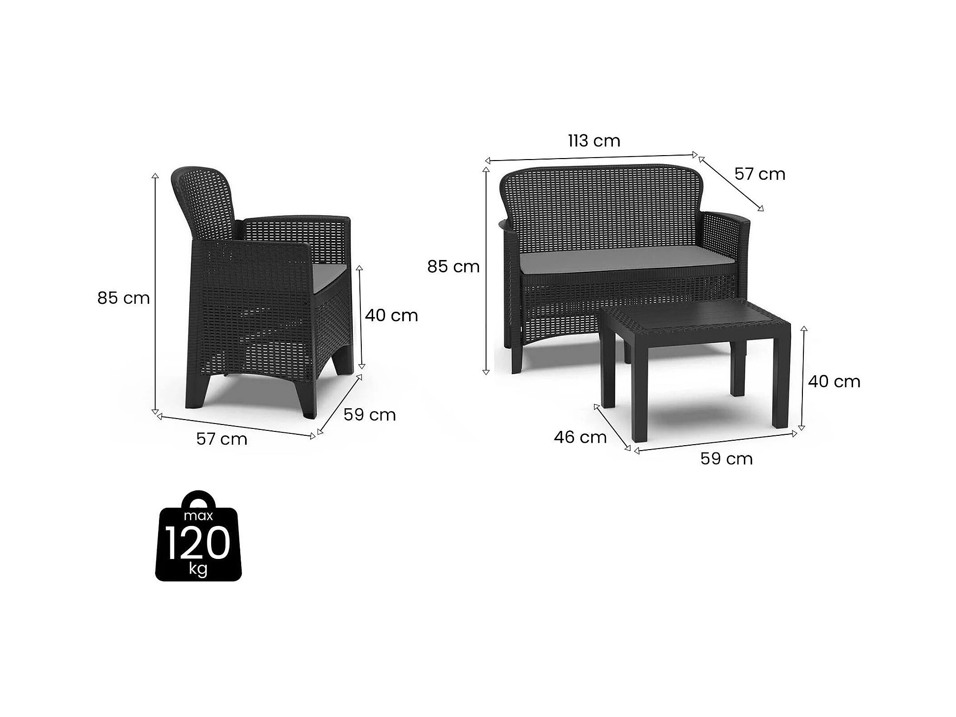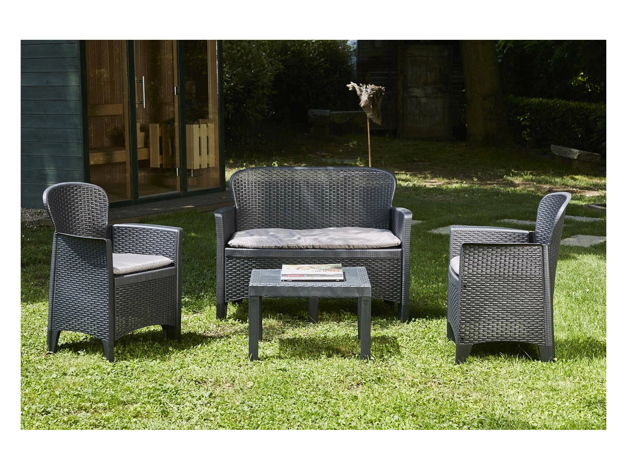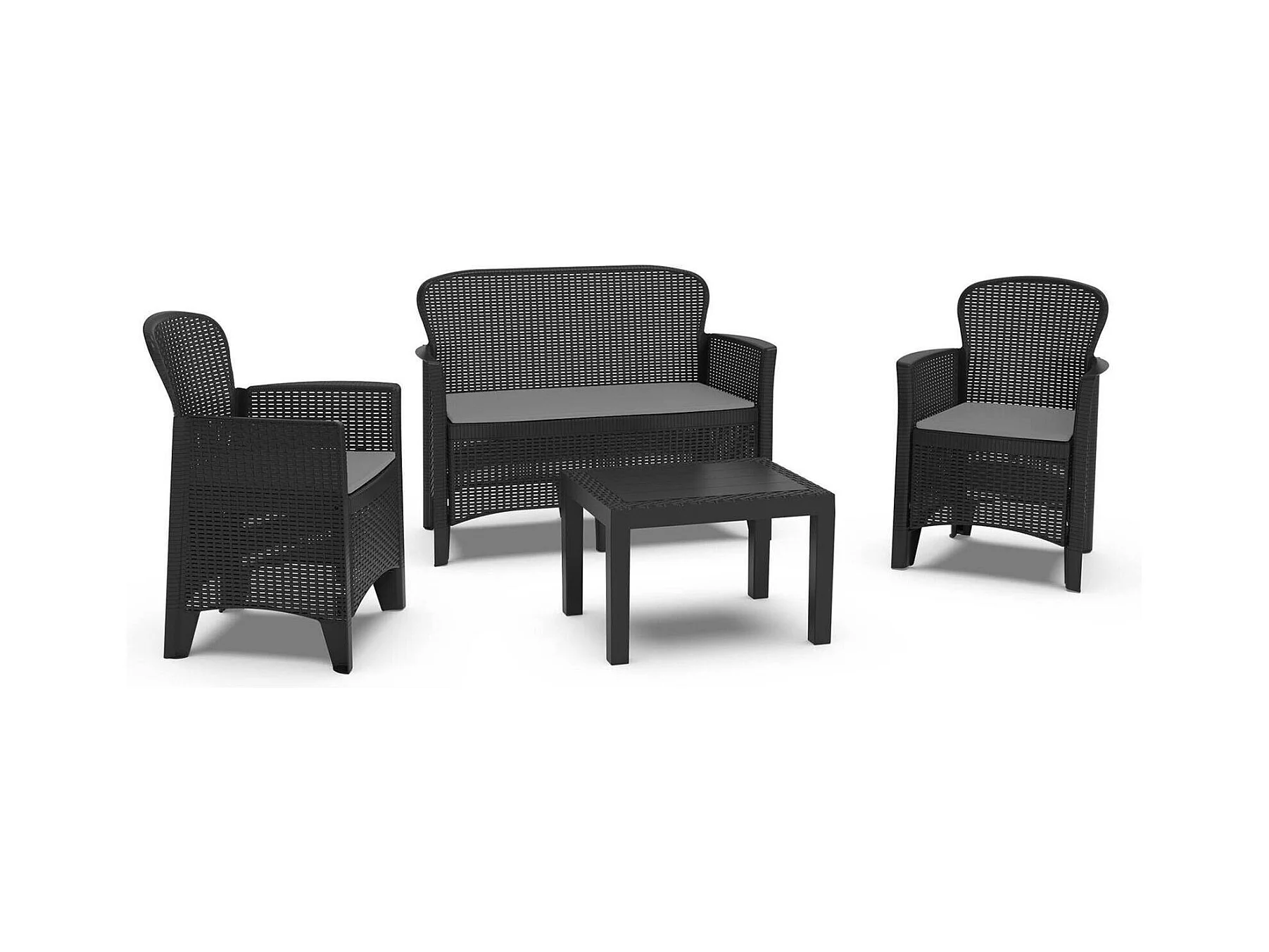 Outdoor-Lounge-Set Debois, Gartengarnitur mit 2 Sesseln, 1 Sofa und 1 Couchtisch, Sitzecke in Rattan-Optik mit Kissen, 100 % Made in Italy, Anthrazit