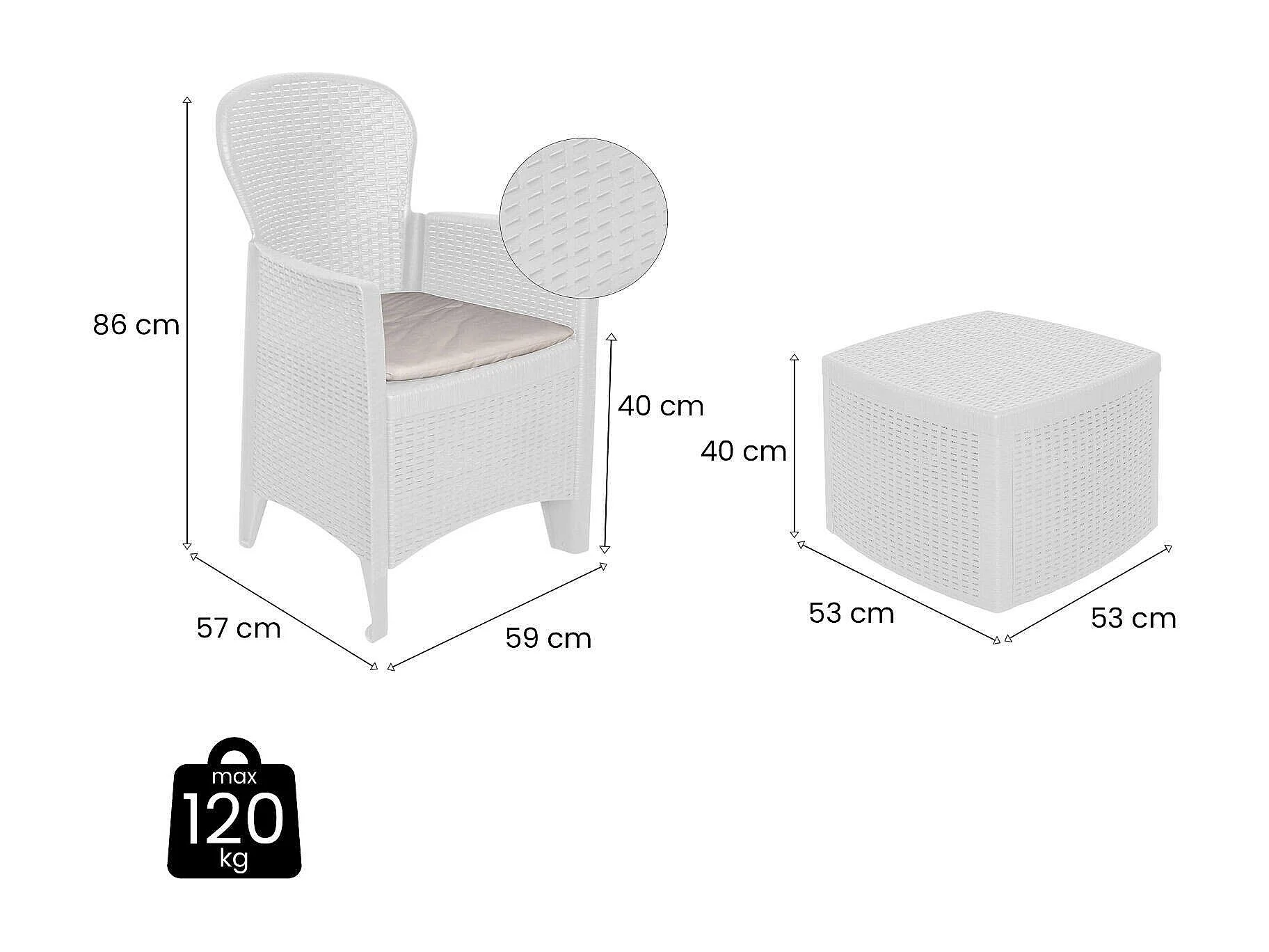 Outdoor-Lounge-Set Napoli, Gartengarnitur mit 2 Sesseln und 1 Containertisch, Sitzecke in Rattan-Optik, 100 % Made in Italy, Weiß