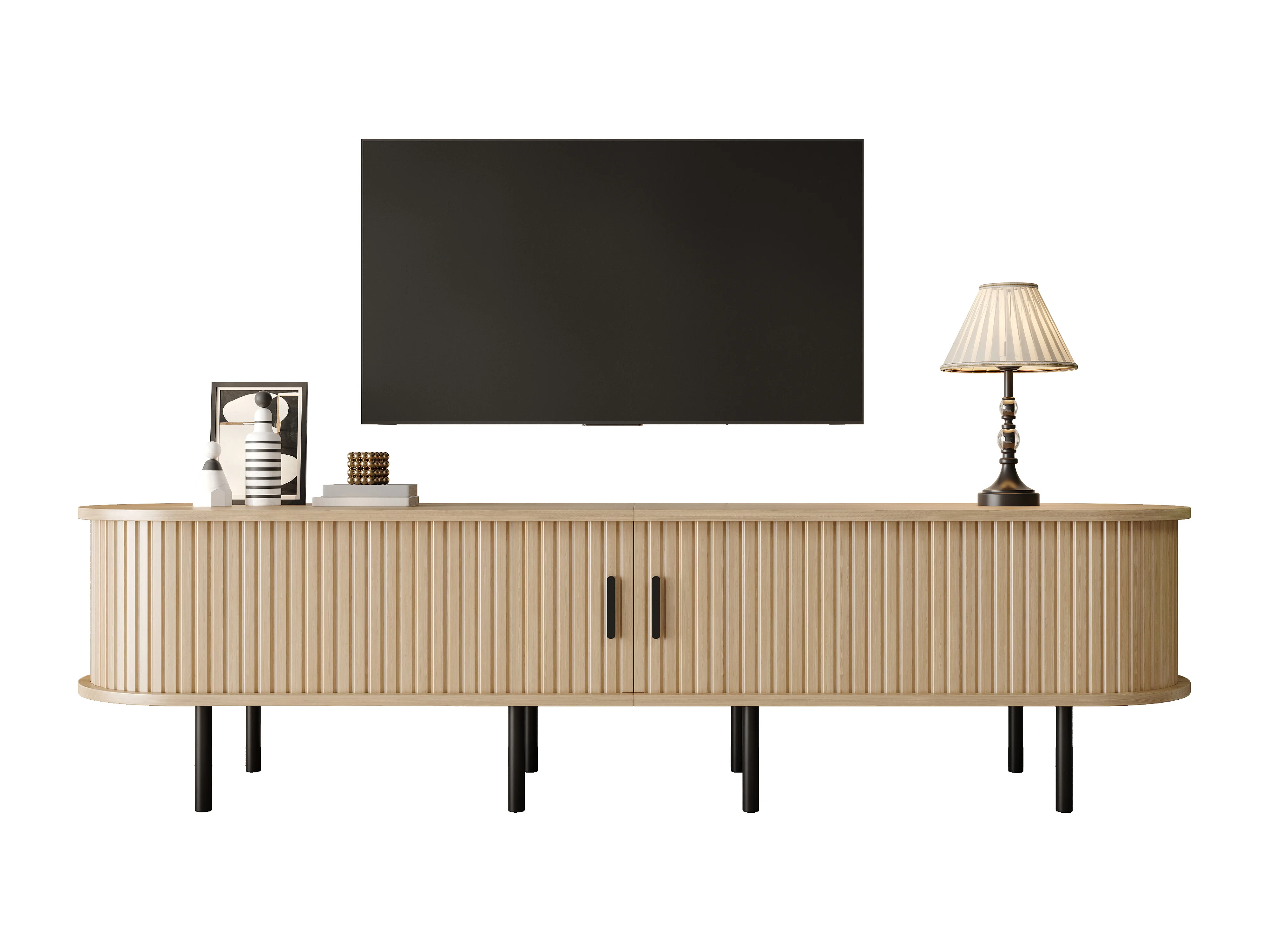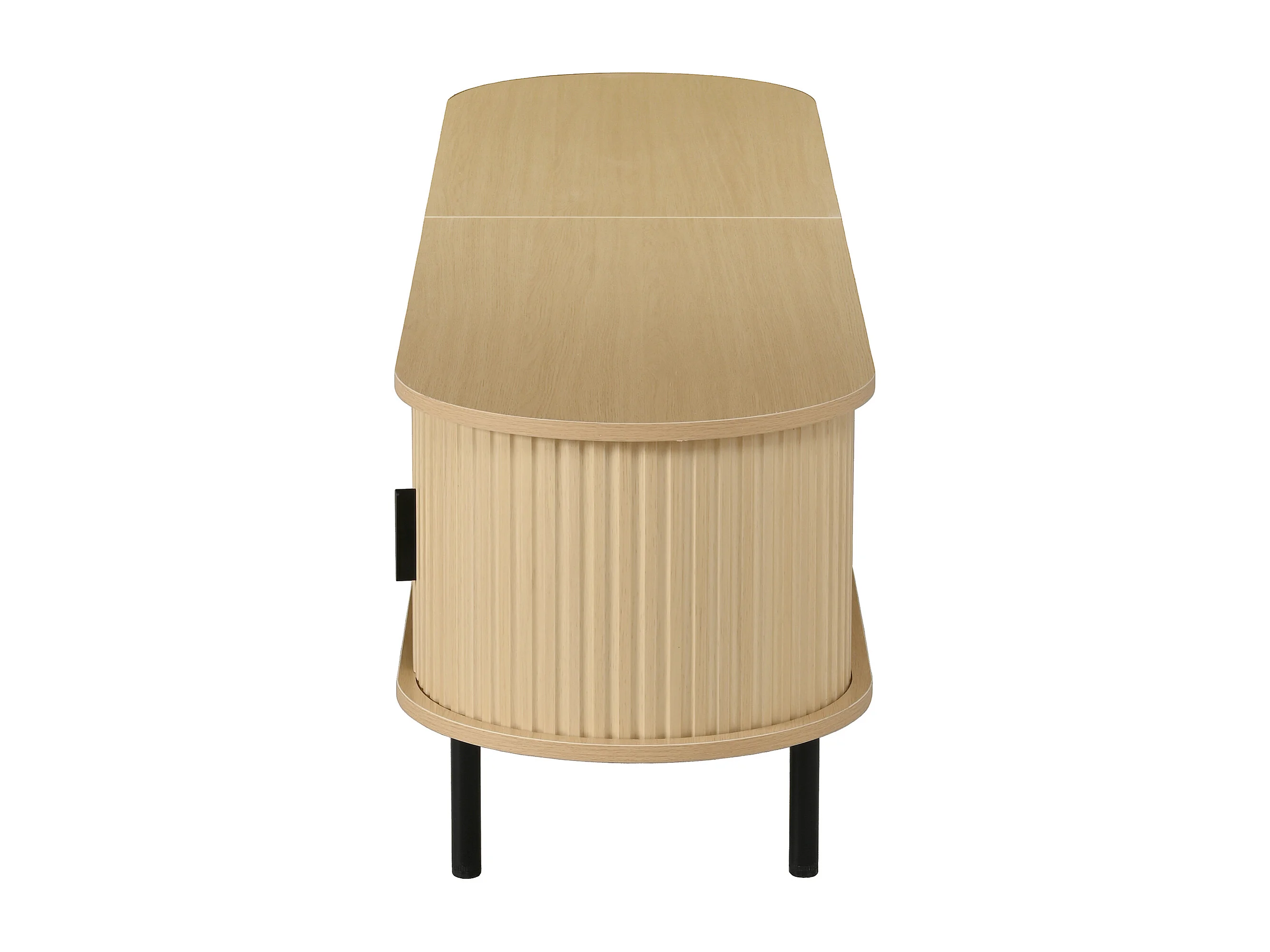 Ovaler TV-Schrank 170x40x46 cm - 2 Schiebetüren und 2 offene Regale - Metallfüße - MDF - Natur