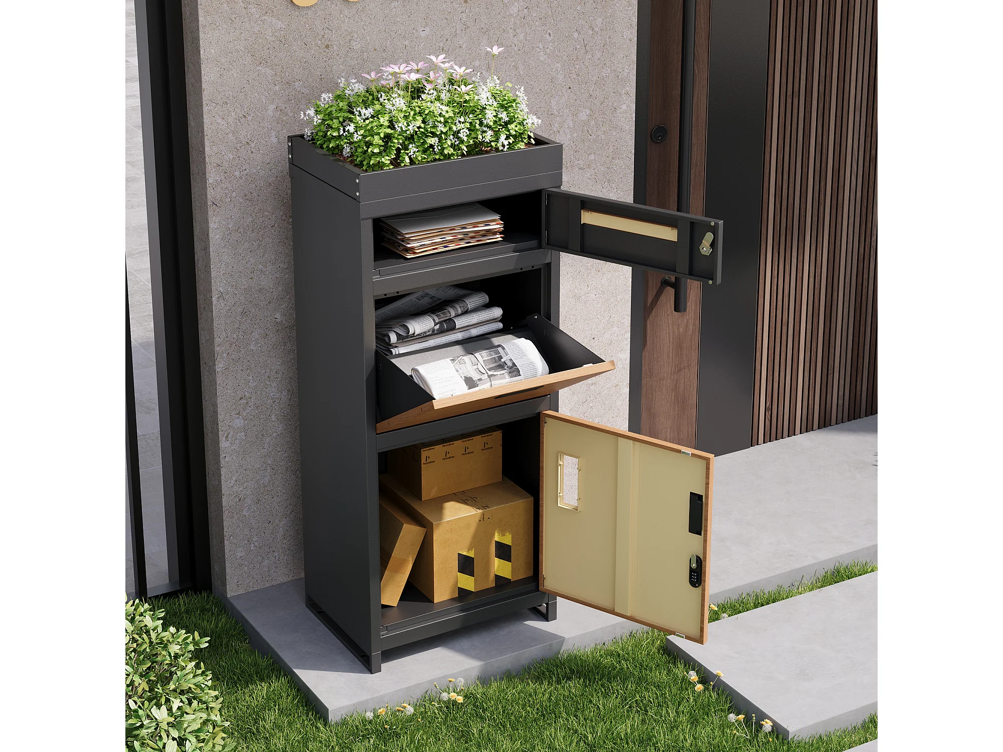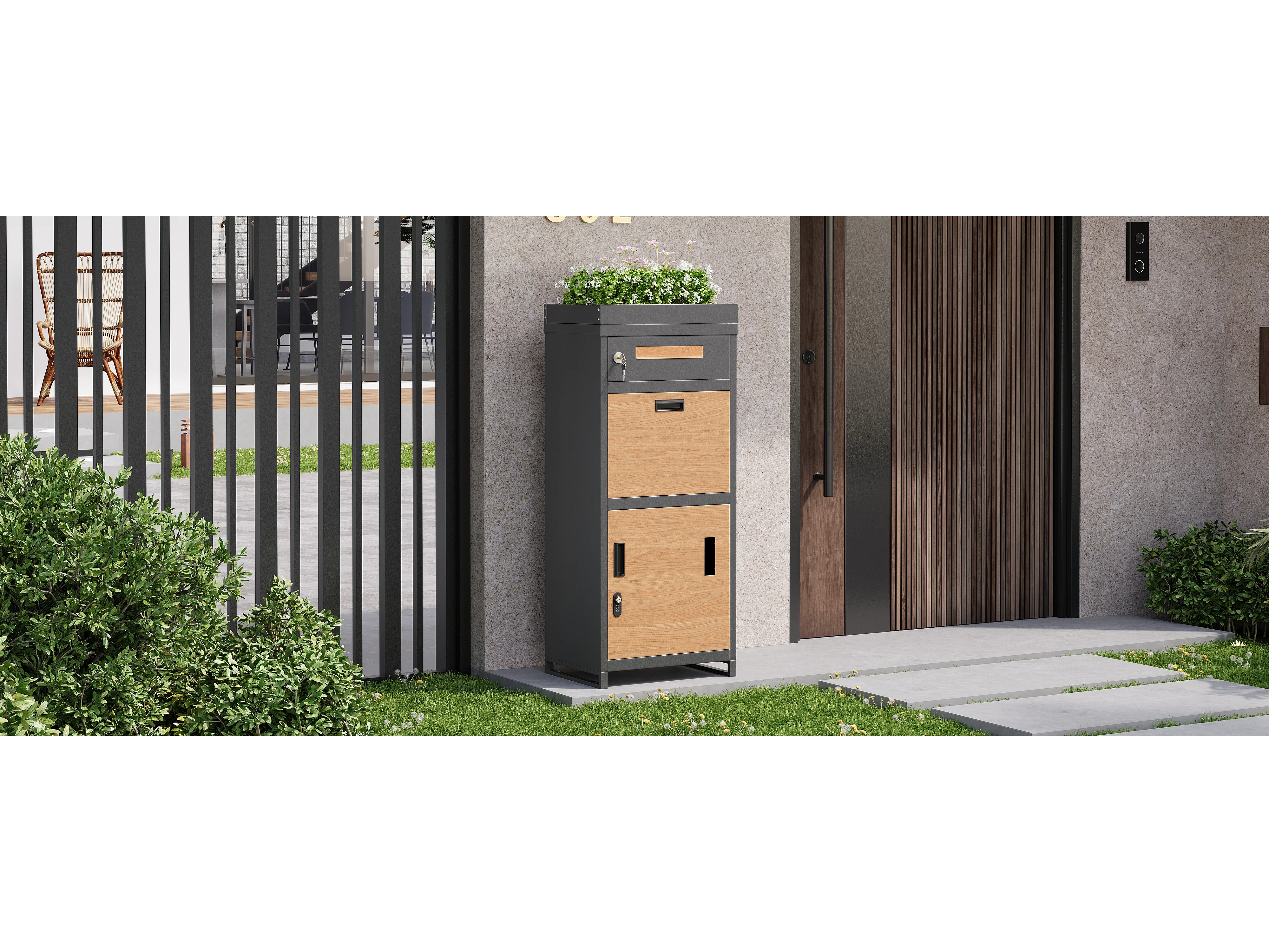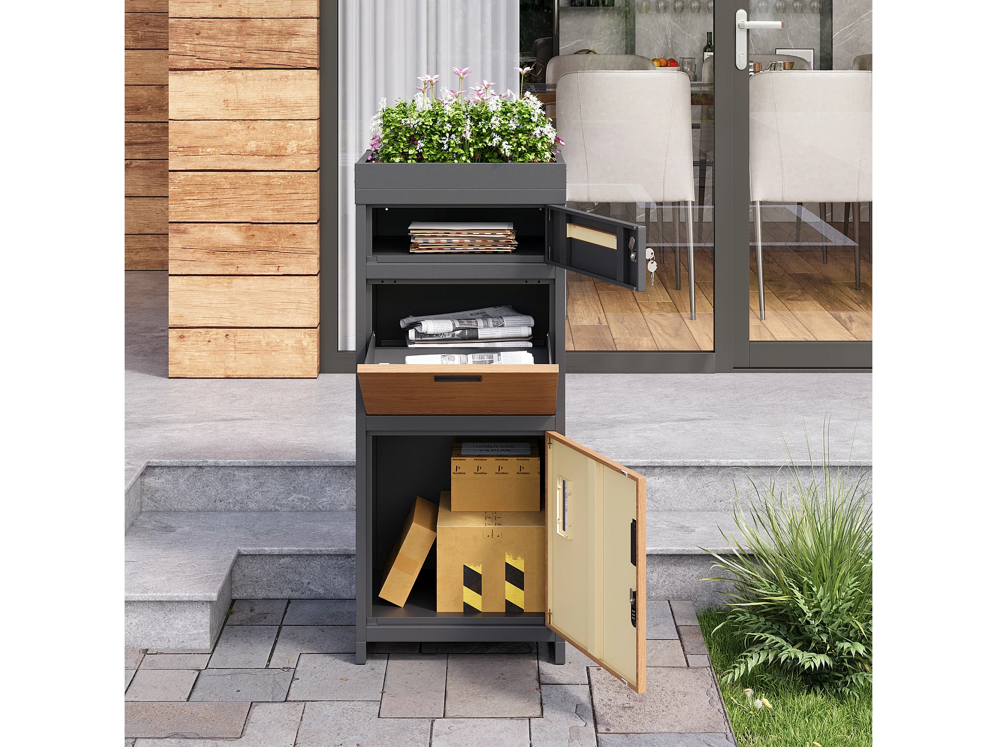 Paket- und Briefaufbewahrungsschrank mit Zahlenschloss und Blumenbeet – 50 x 37 x 118,5 cm – Metall – grau + natur