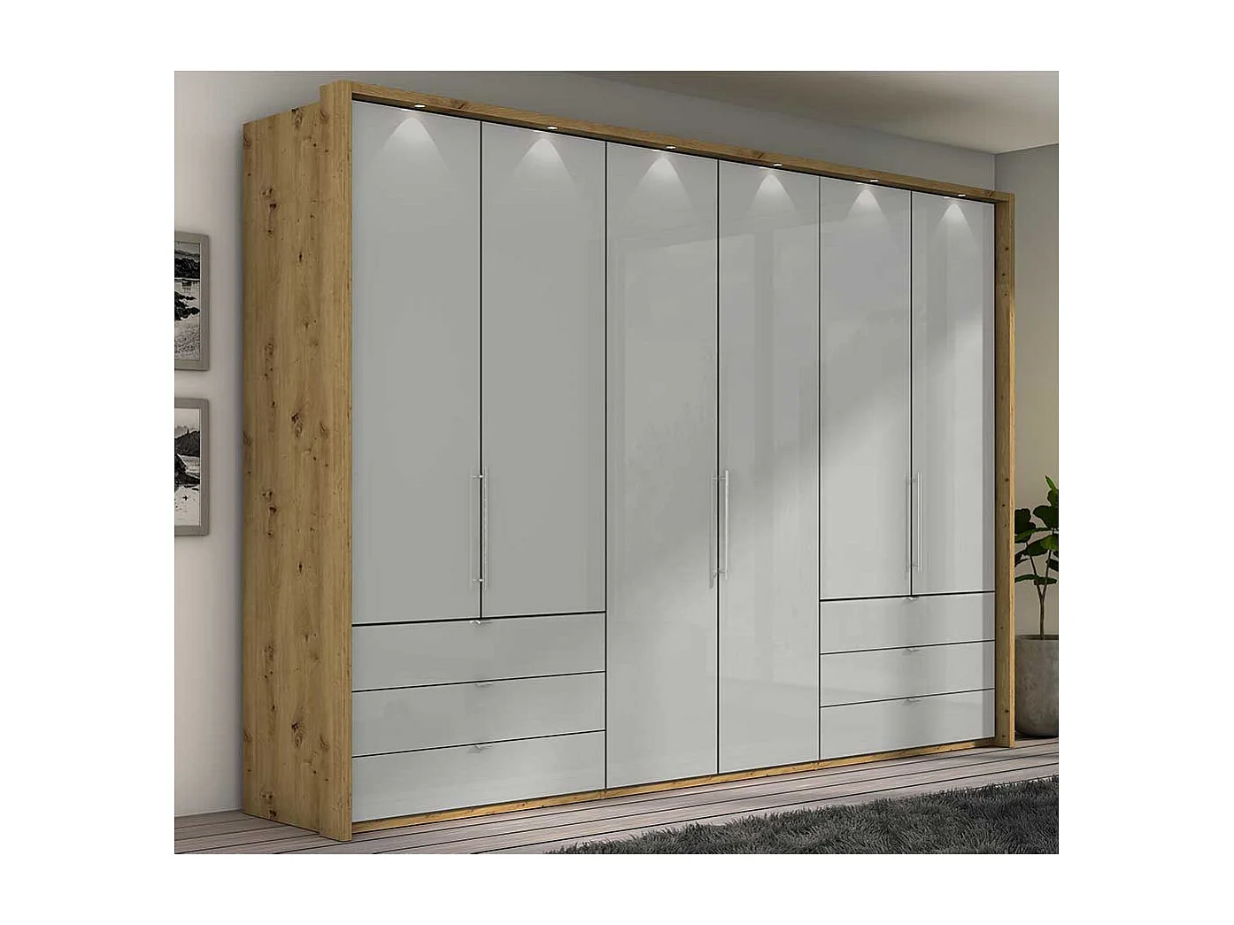 Panorama Kleiderschrank in Hellgrau und Eiche Bianco Falttüren