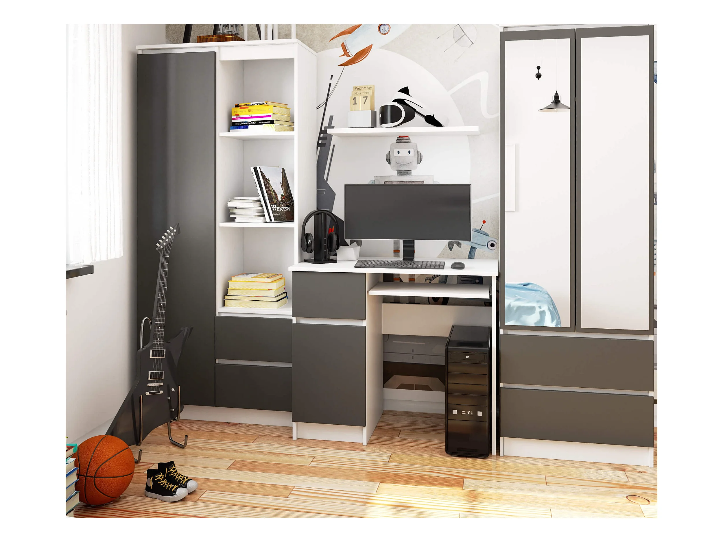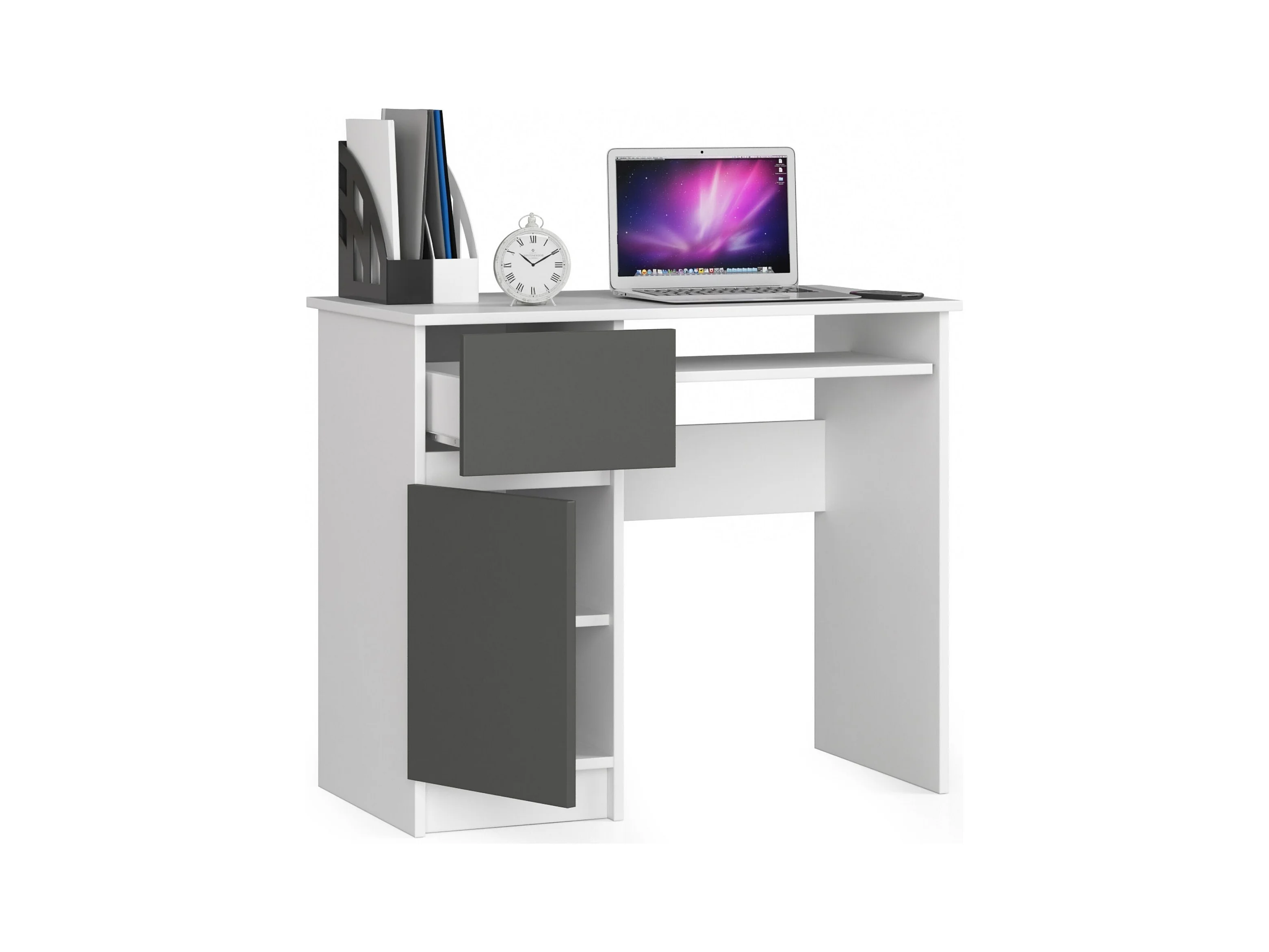 PC-Schreibtisch AKORD PIKSEL links in der Farbe Weiß Schublade Front Graphitgrau und 3 Ablagen B90 x H77 x T50 cm