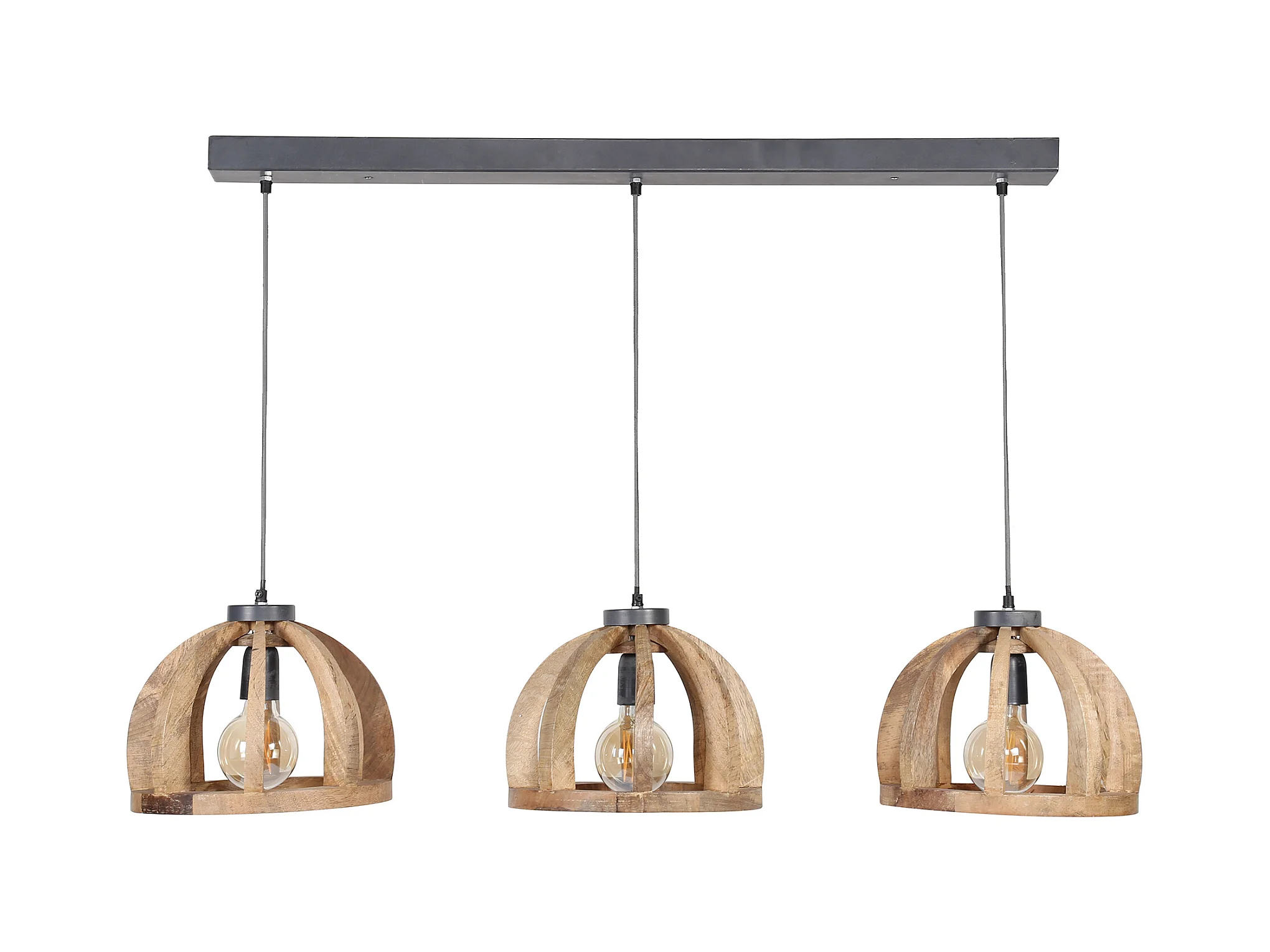 Pendelleuchte aus natürlichem Mangoholz - 3 Lampen - Gebogene Holzstäbe Ø30