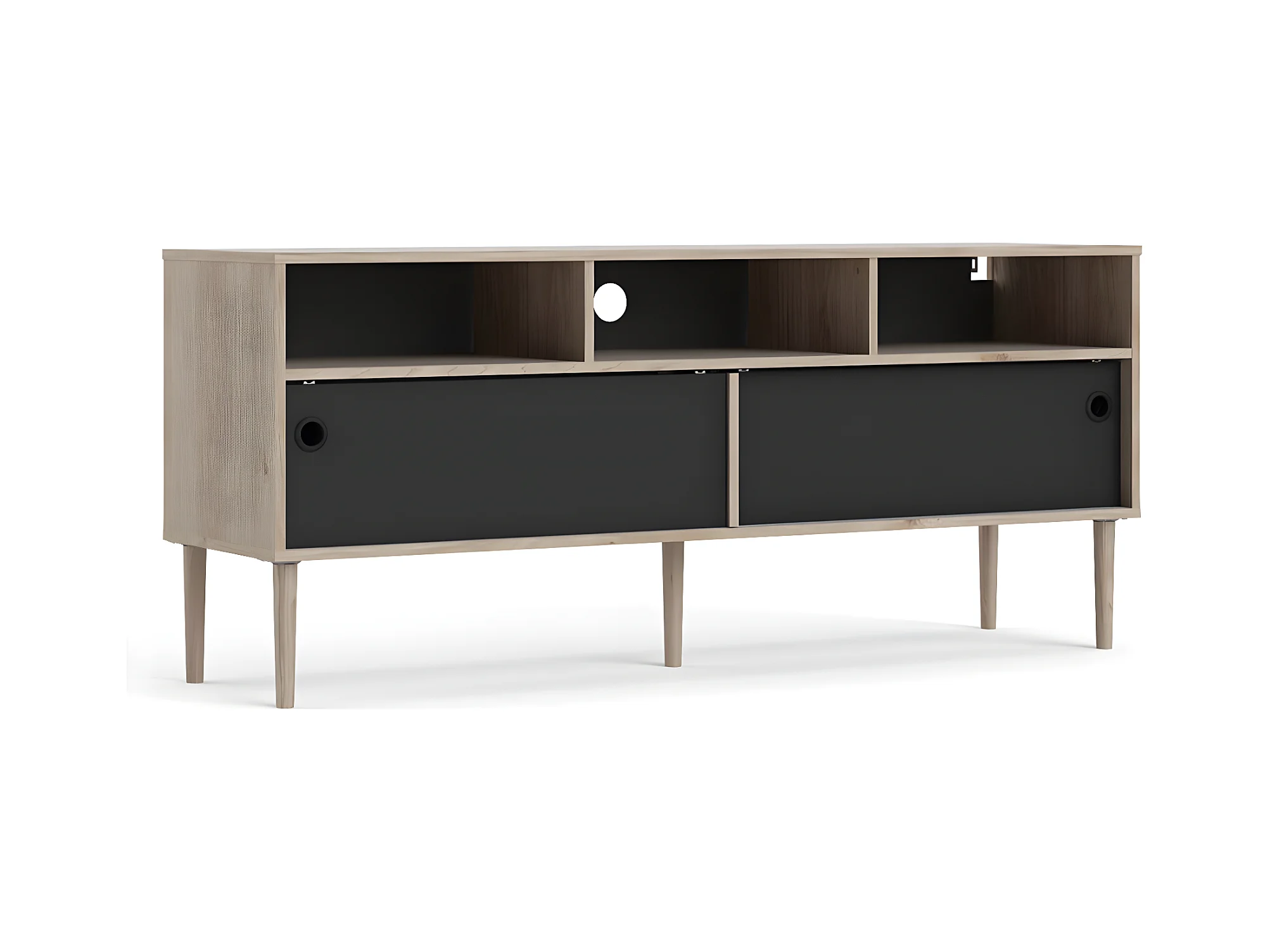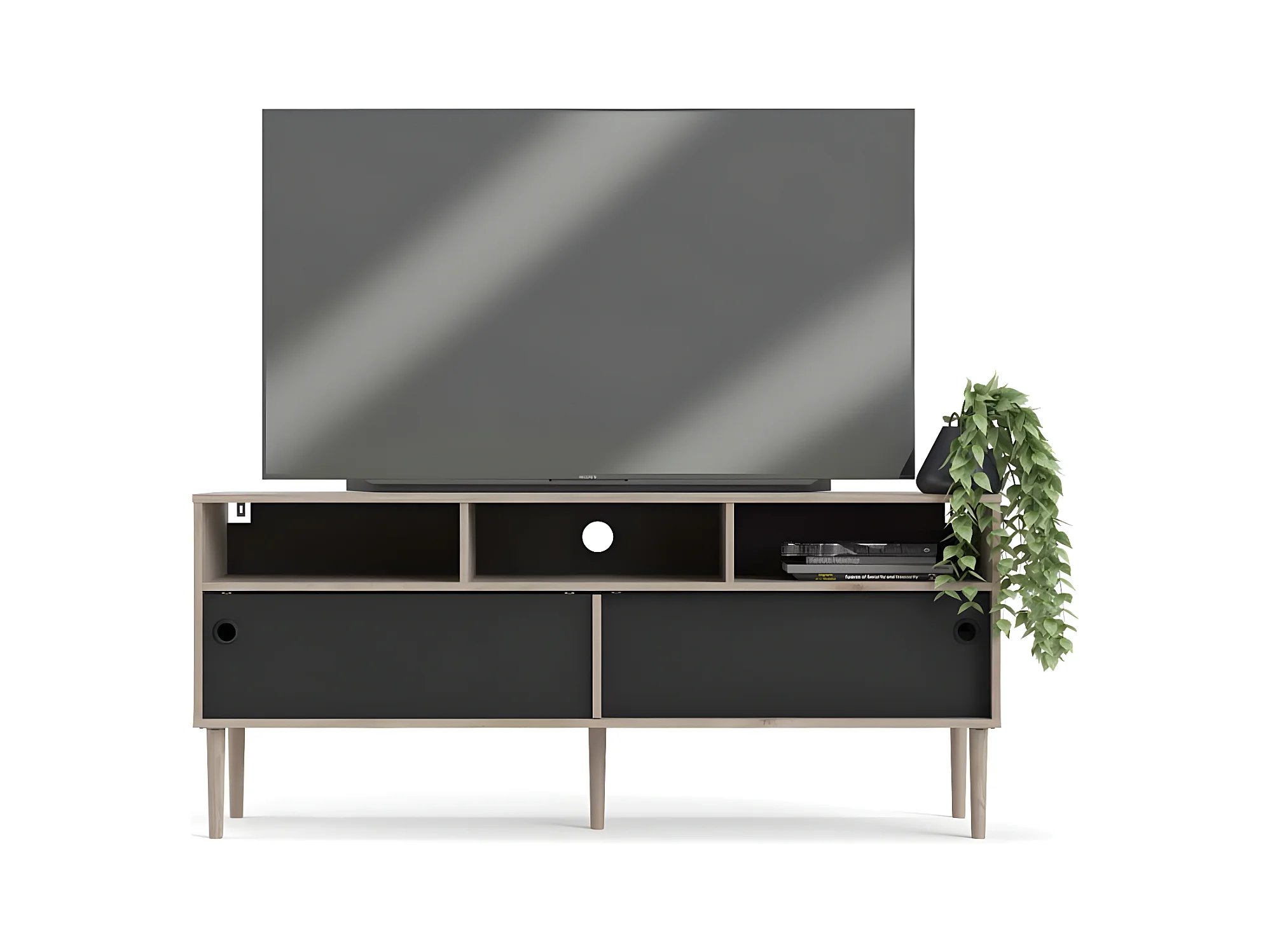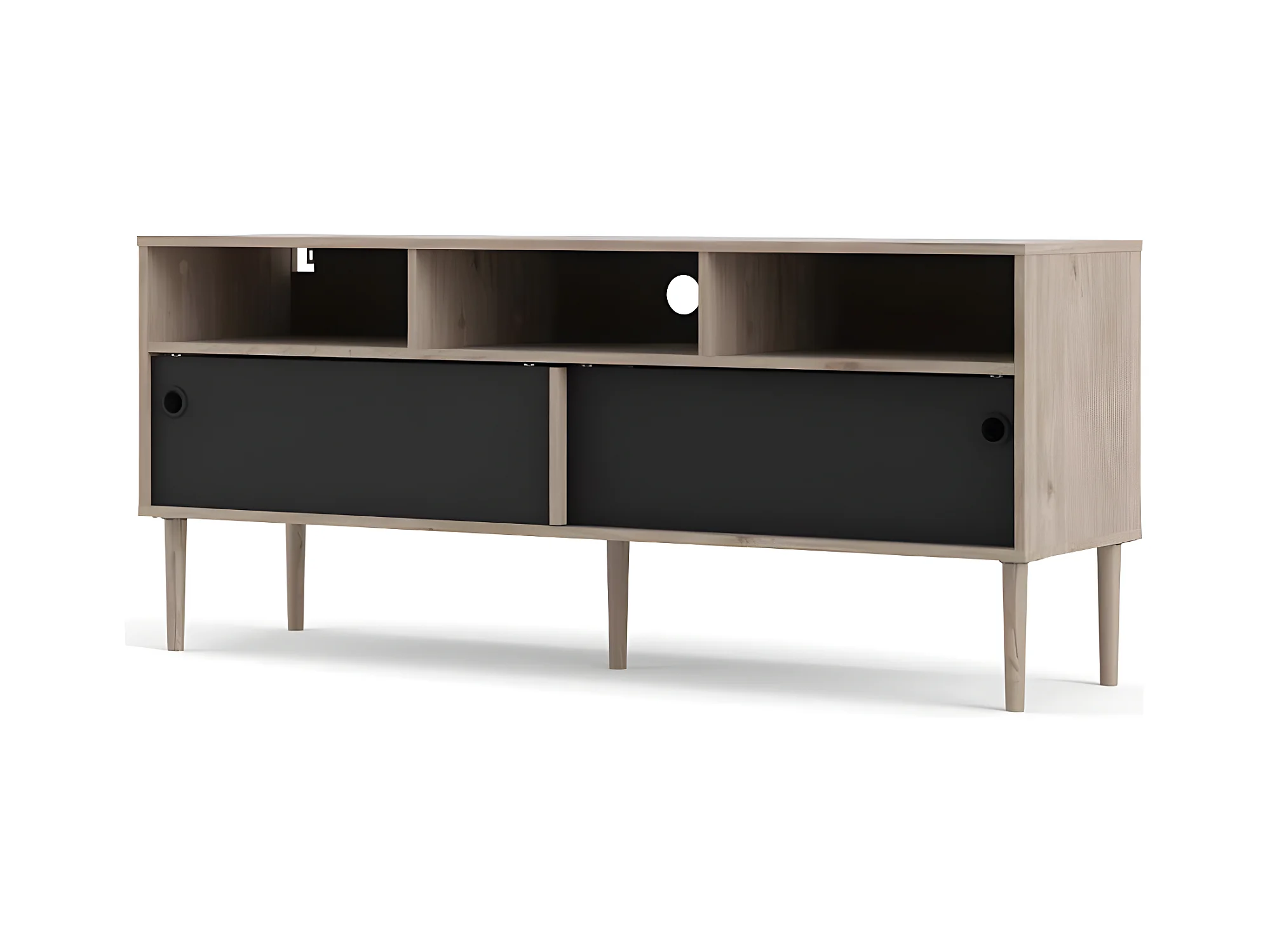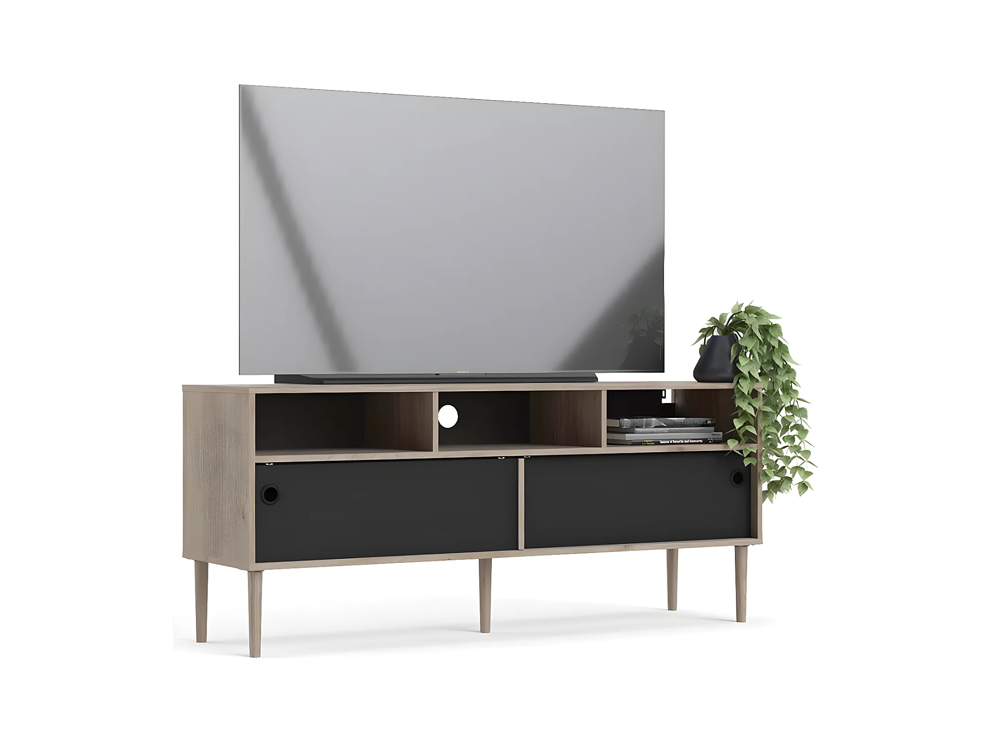 Penny TV Tisch 2 Schiebetüren und 3 Fächer Hickory-Dekor und matt schwarz.