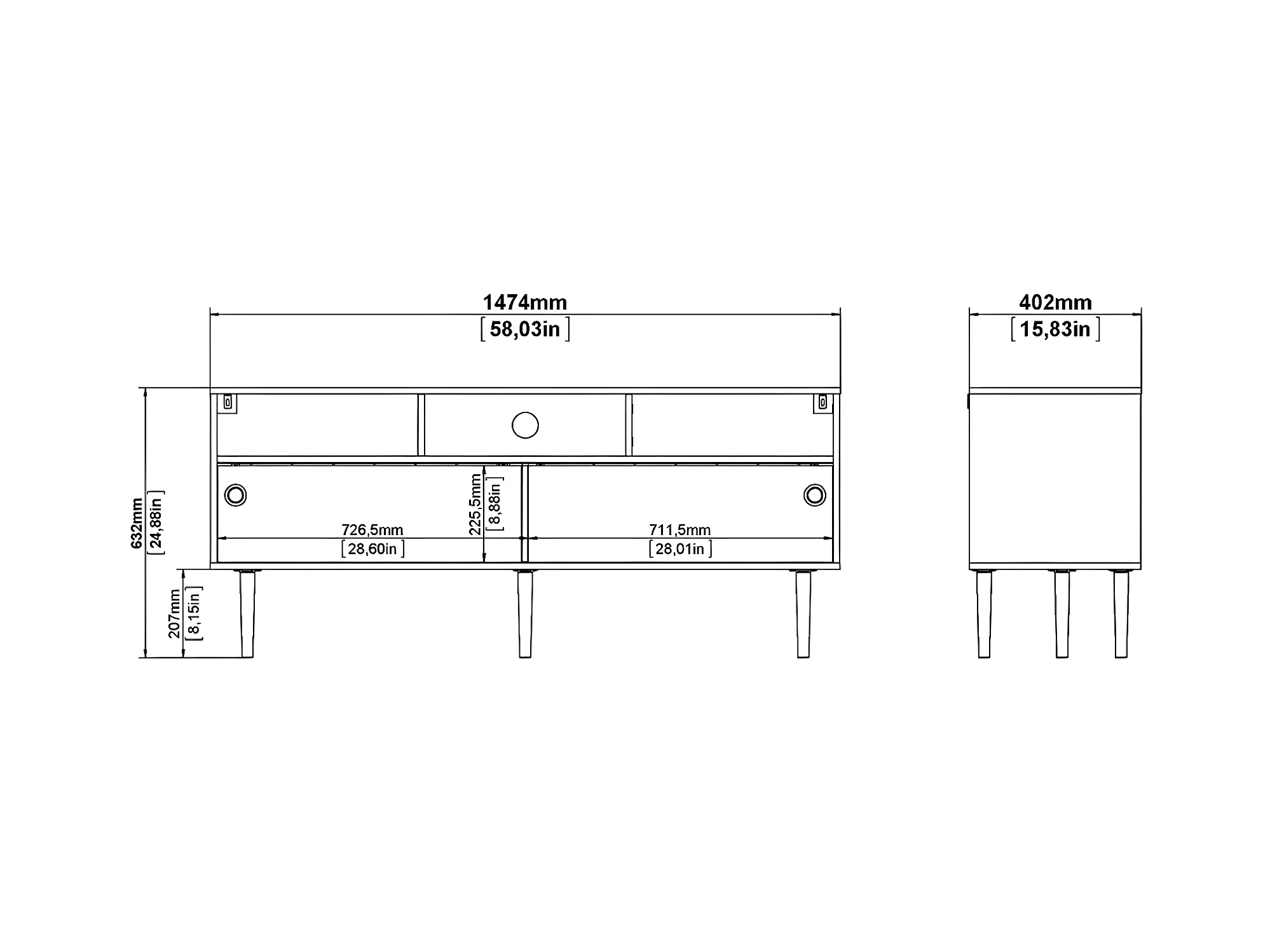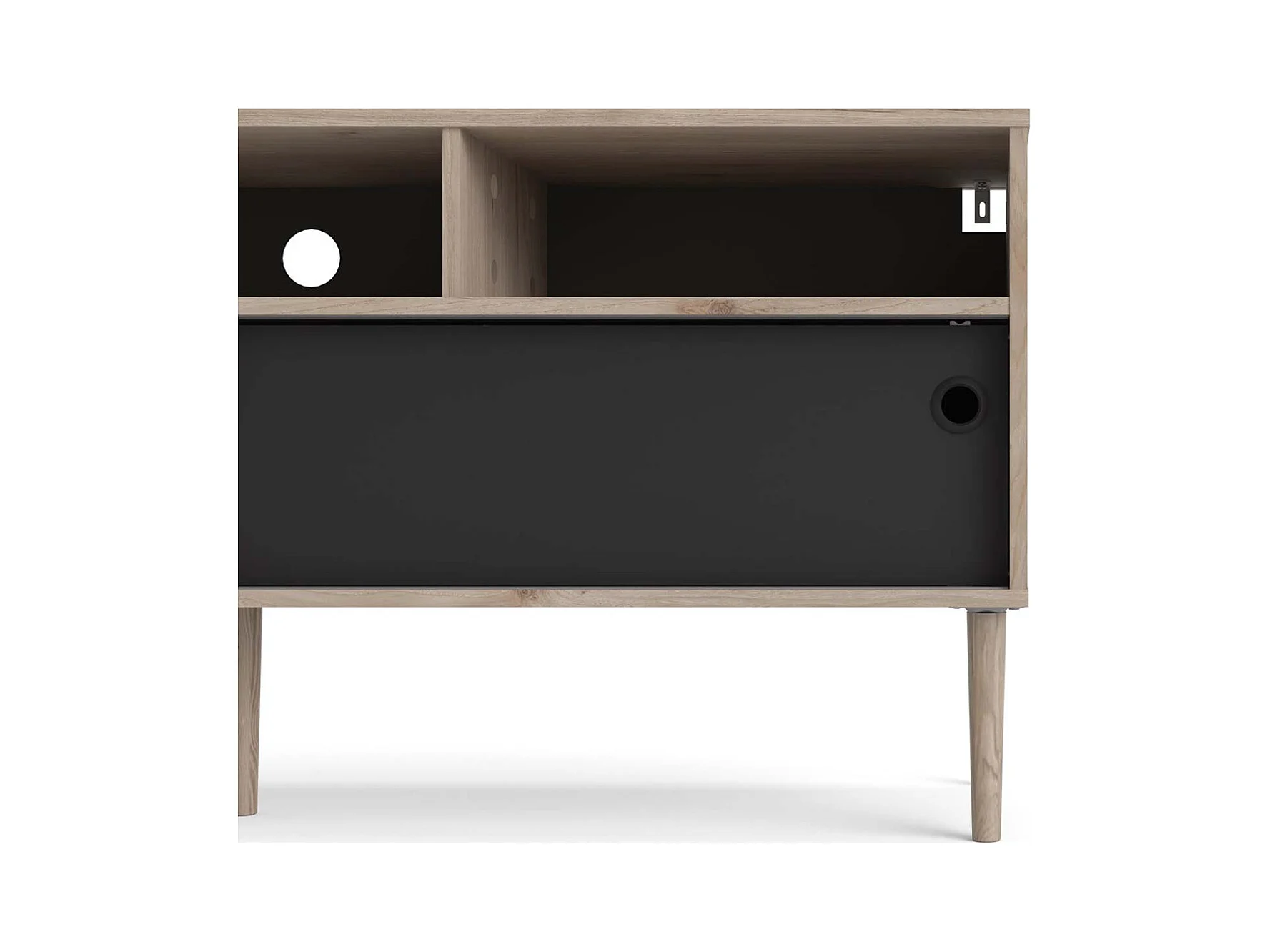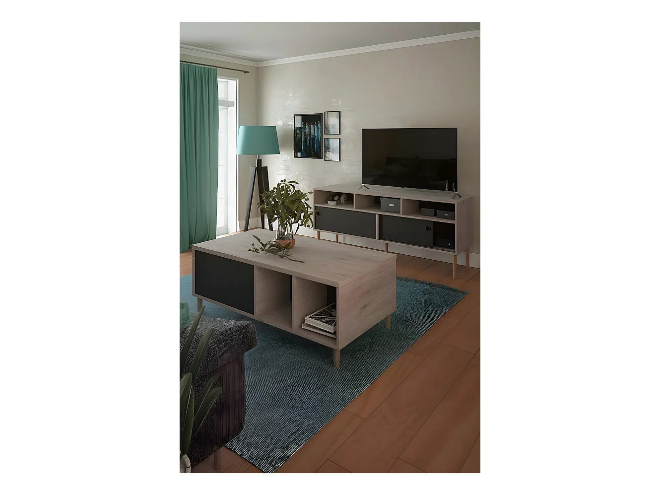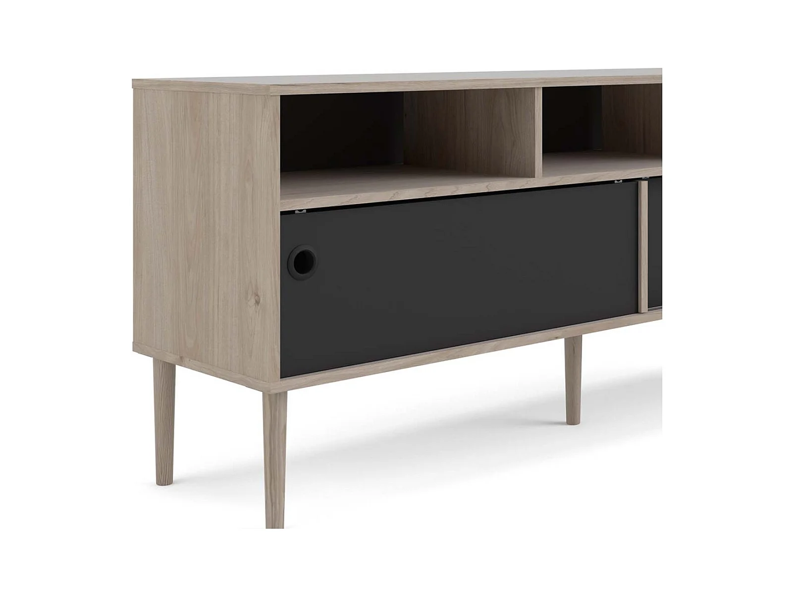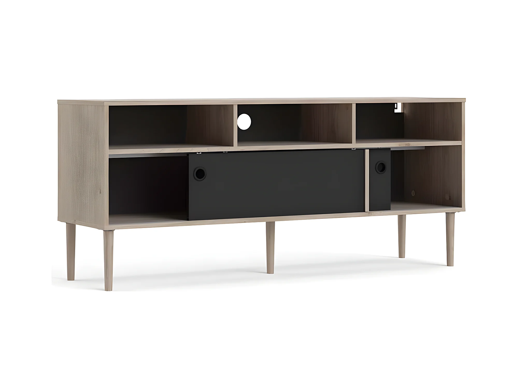Penny TV Tisch 2 Schiebetüren und 3 Fächer Hickory-Dekor und matt schwarz.
