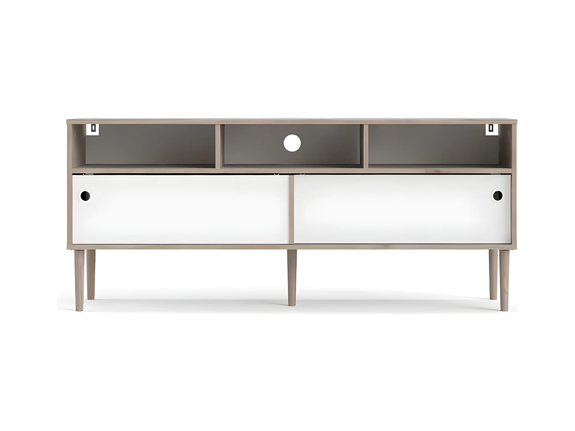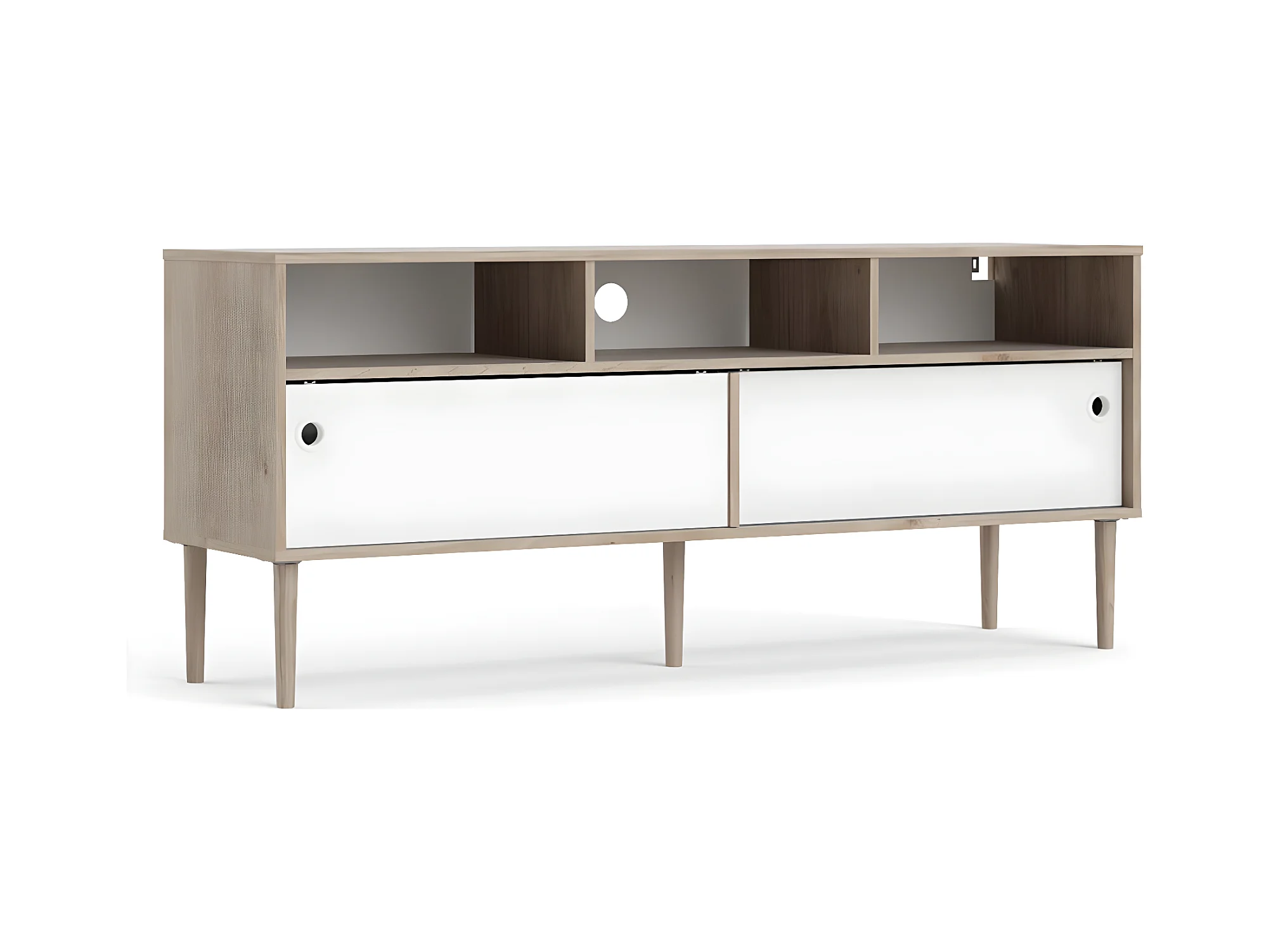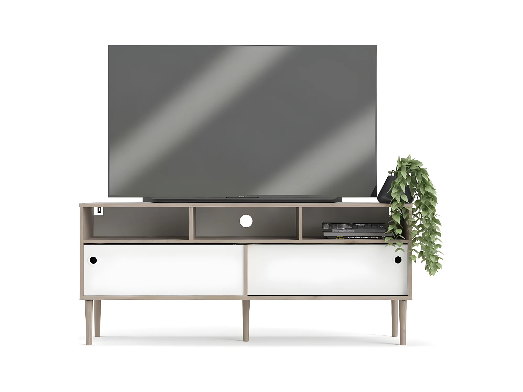 Penny TV Tisch 2 Schiebetüren und 3 Fächer Hickory-Dekor und Mattweiß.