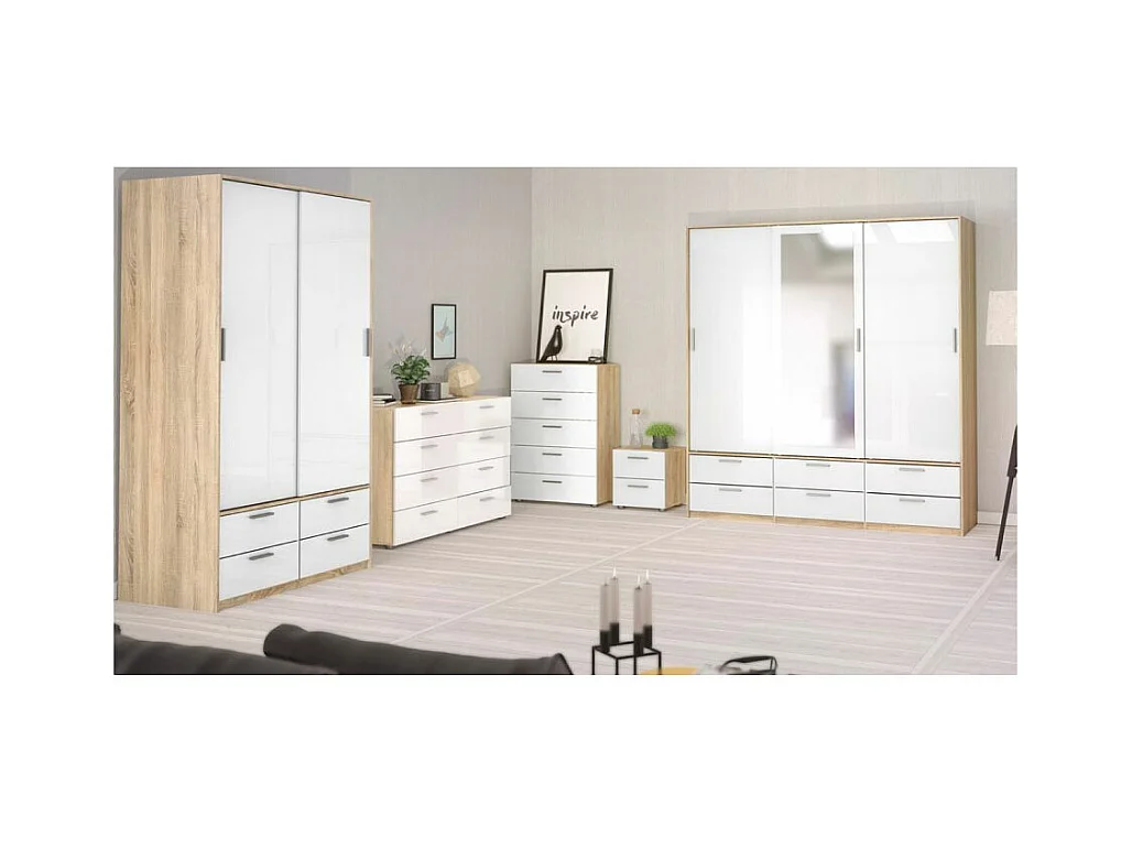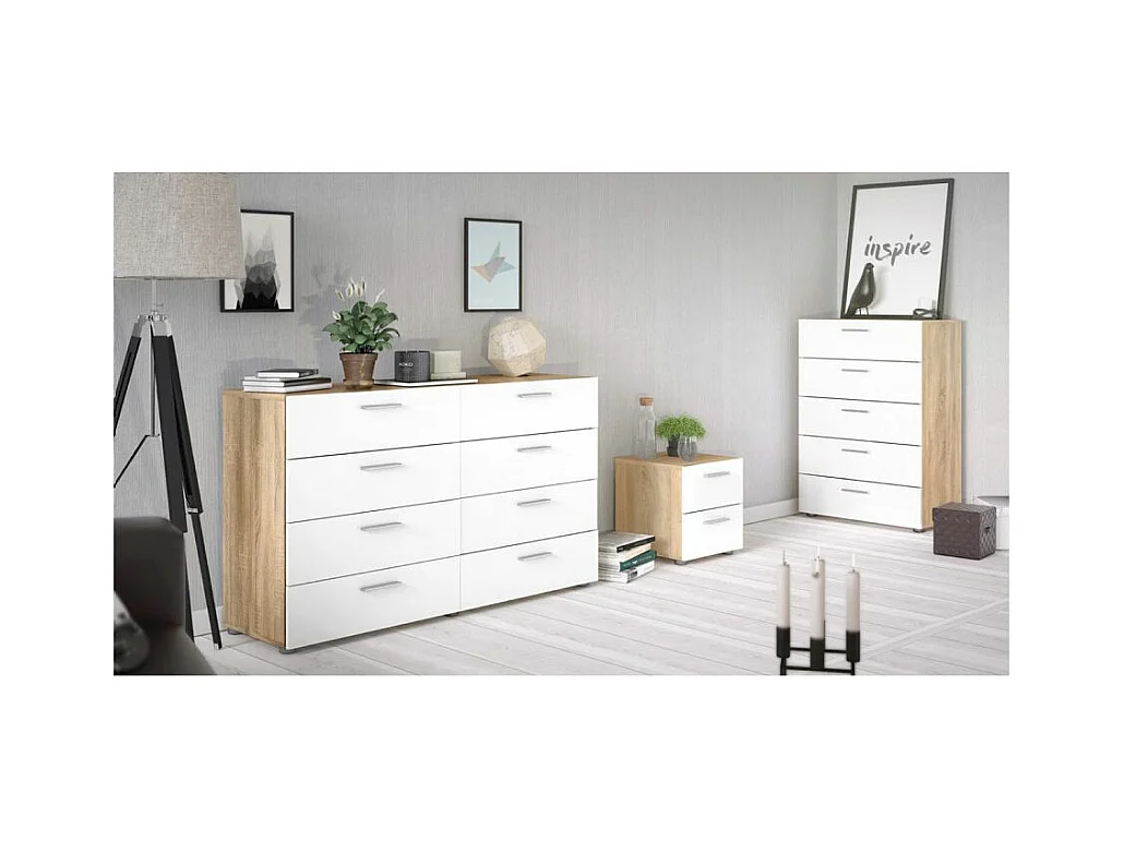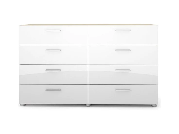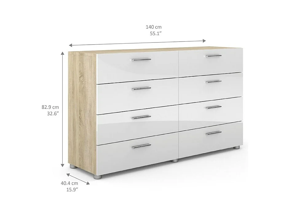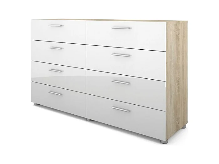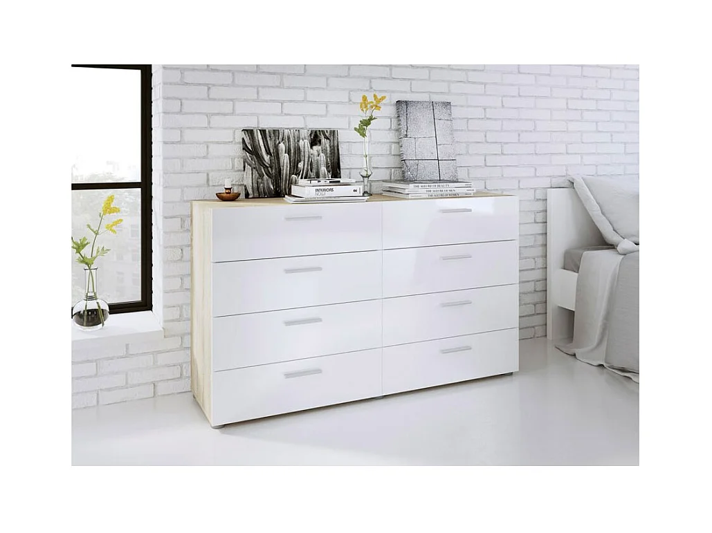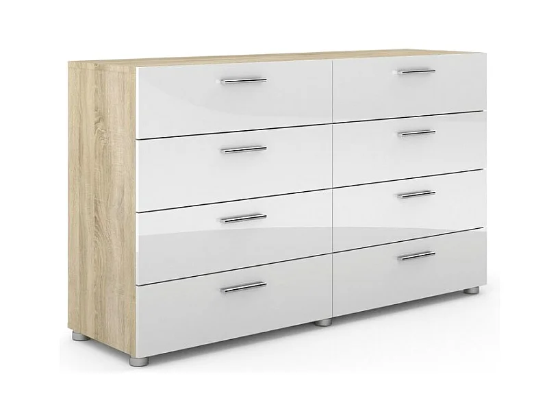 Petra Kommode 8 Schubladen Eiche Struktur Dekor und weiss Hochglanz.