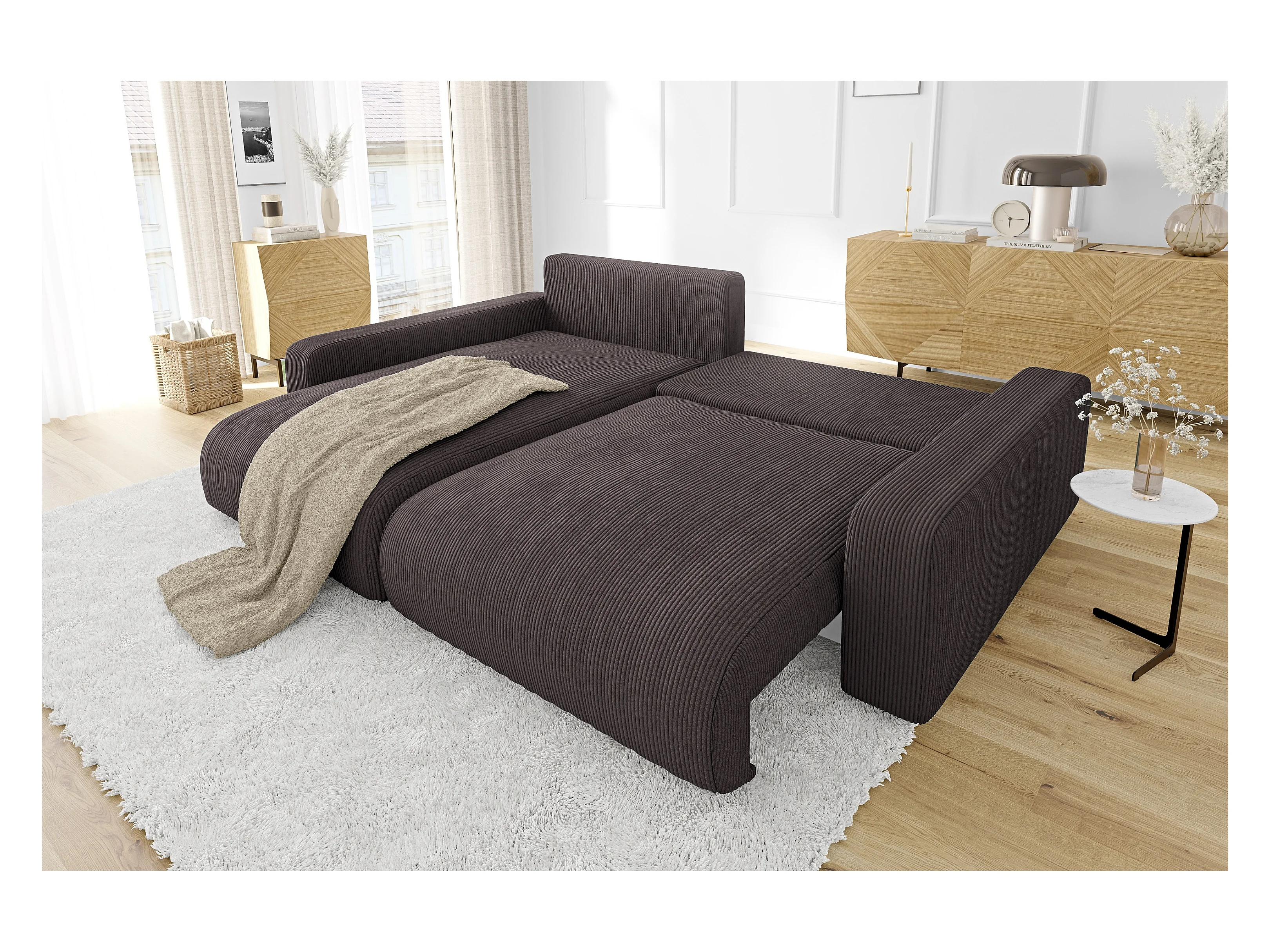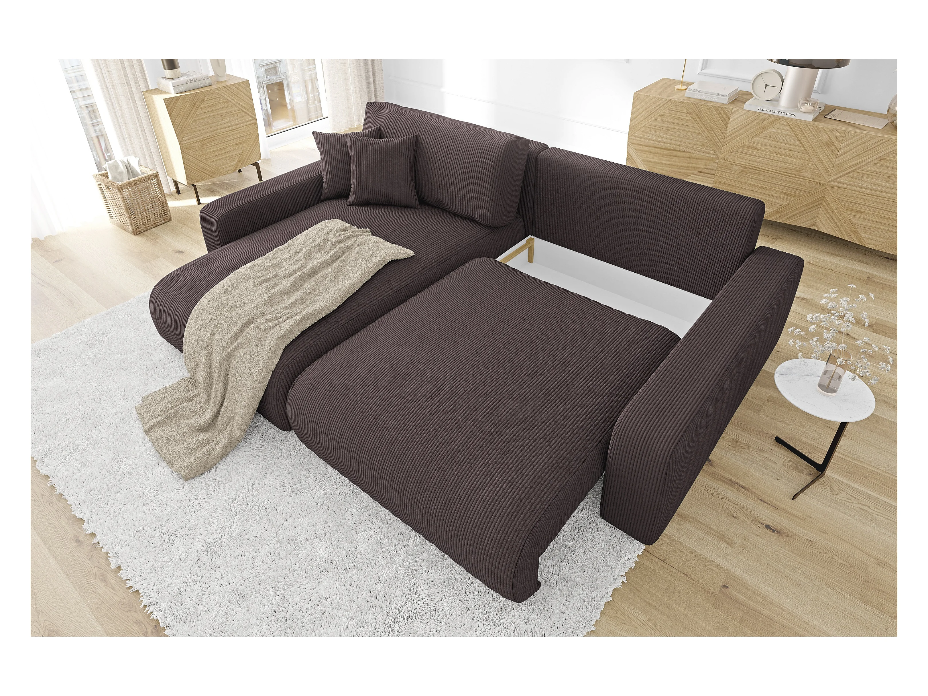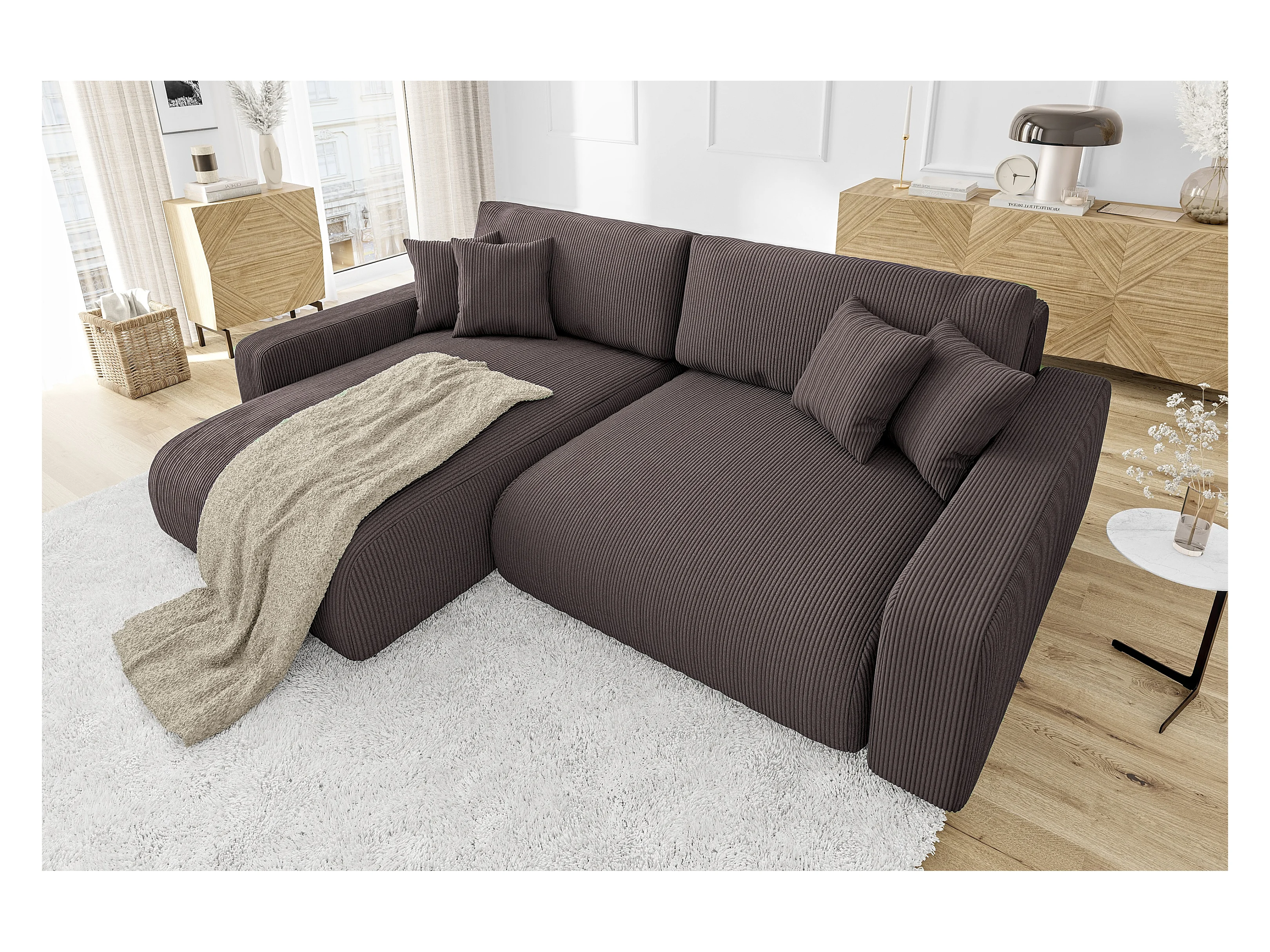Emma- Ecksofa mit Bettfunktion und Bettkasten in Cord-Stoff schöner Sitzkomfort