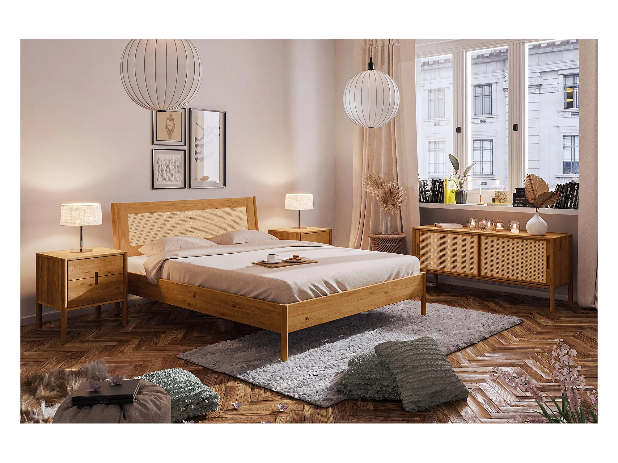 POLA - Bett mit Rattankopfteil 160 x 200 aus Wildeiche naturgeölt