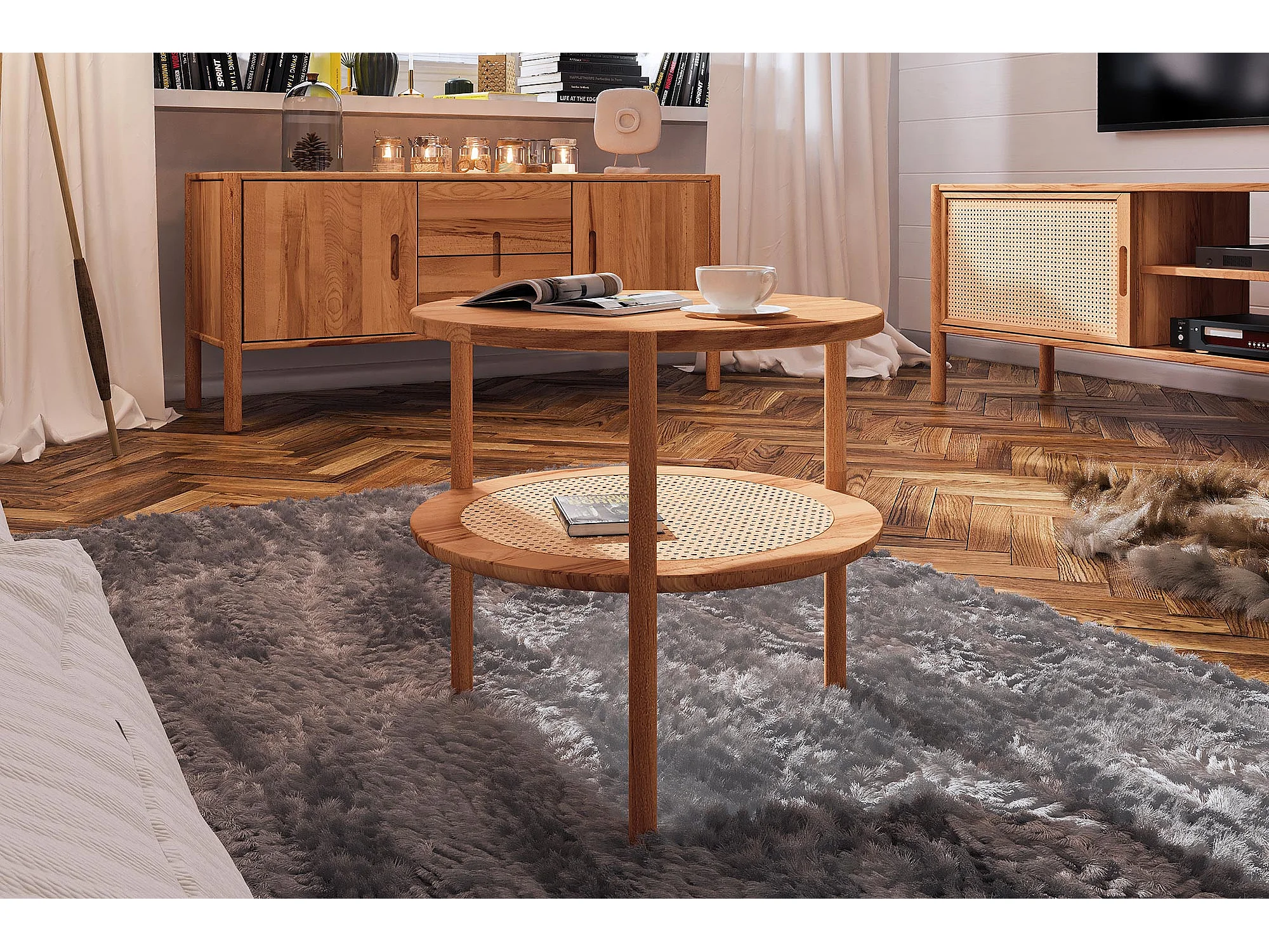 POLA - Hoher Couchtisch mit Rattan aus Kernbuche, naturgeölt Φ70