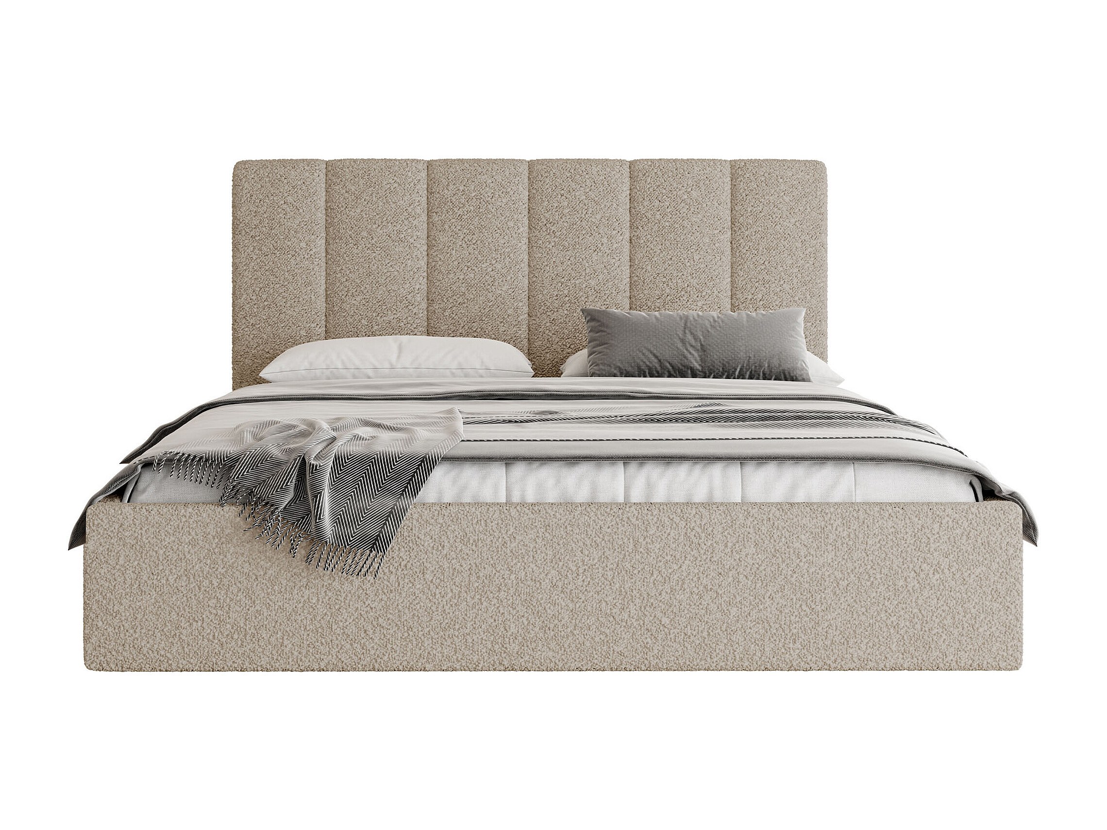 Polsterbett 120x200 mit Bettkasten, Lattenrost – hohe Kopfteil, Boucle Stoff – Modernes Doppelbett mit Stauraum – Bettgestell, ohne Matratze – Amira Slim – Beige