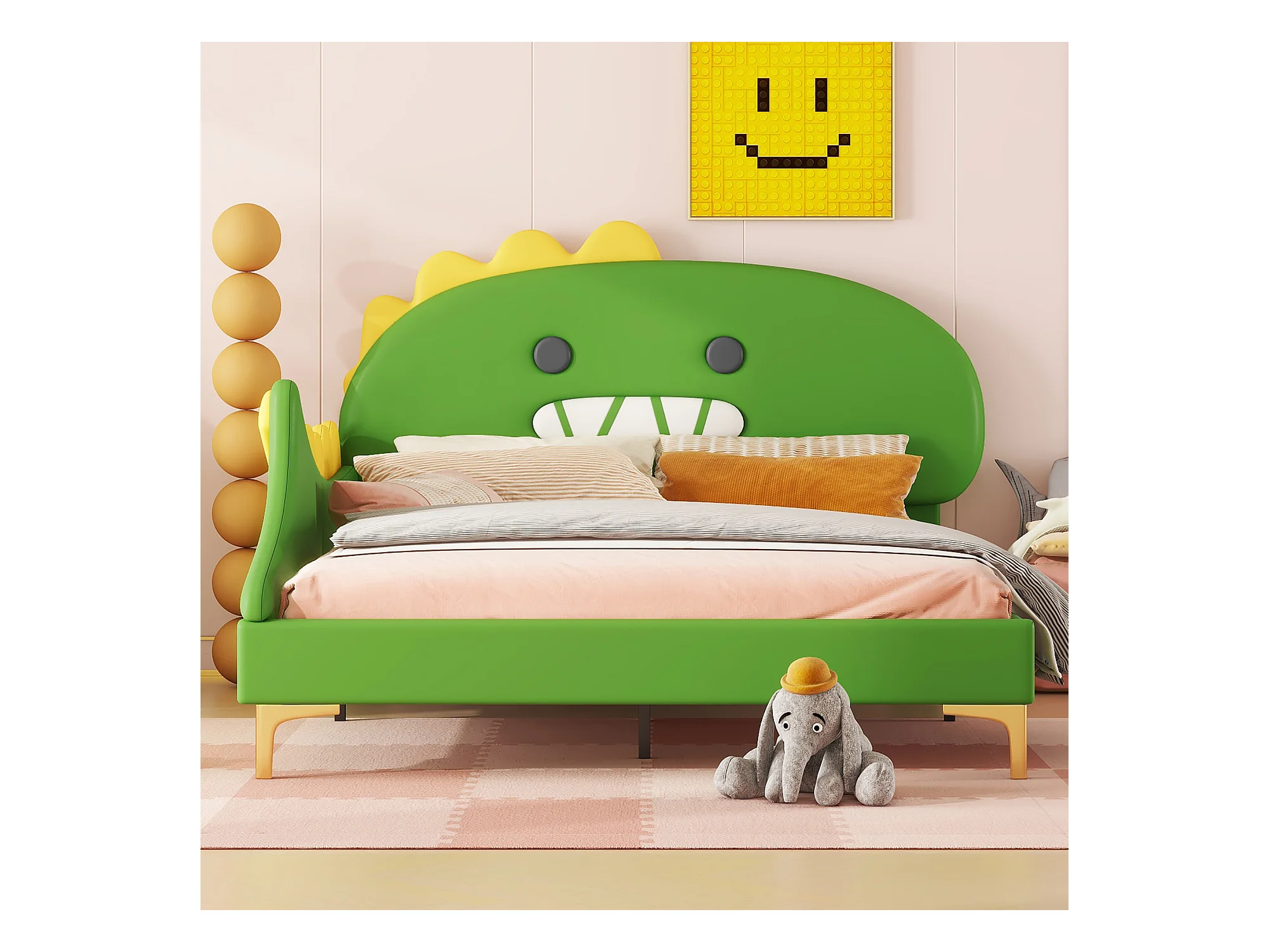 Polsterbett 140 x 200 cm mit Kopfteil in Dinosaurierform, PU-Leder, Lattenrost, Grün