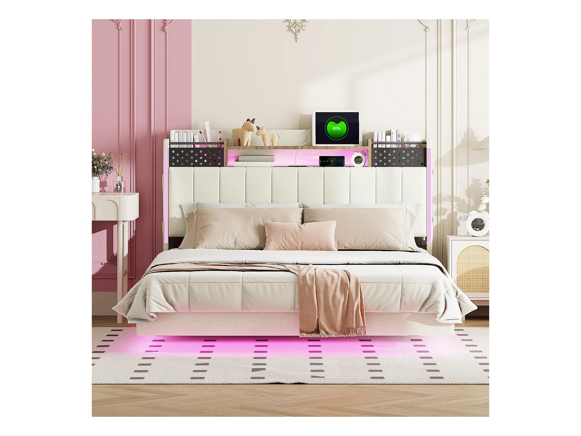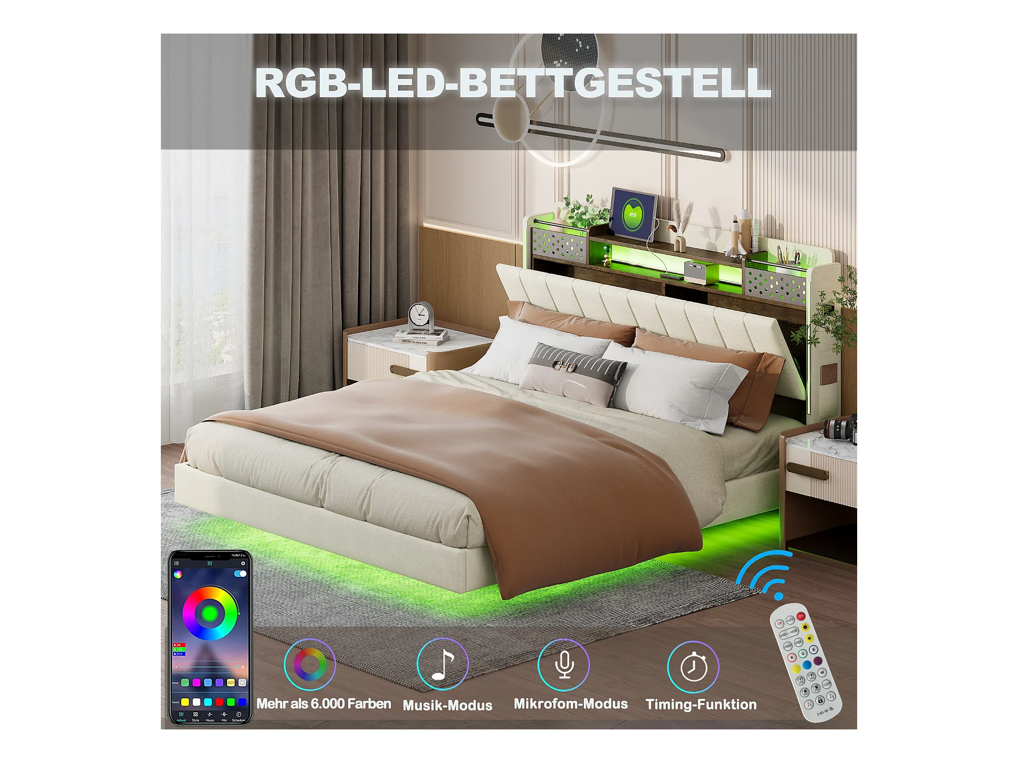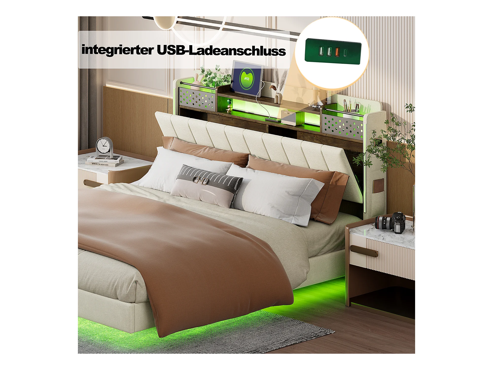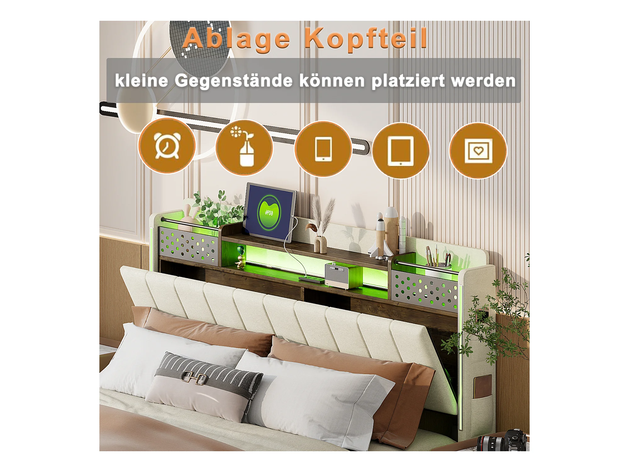Polsterbett 140 x 200 cm mit Stauraum-Kopfteil – LED-Beleuchtung und USB-Buchse – Leinenstoff – Beige
