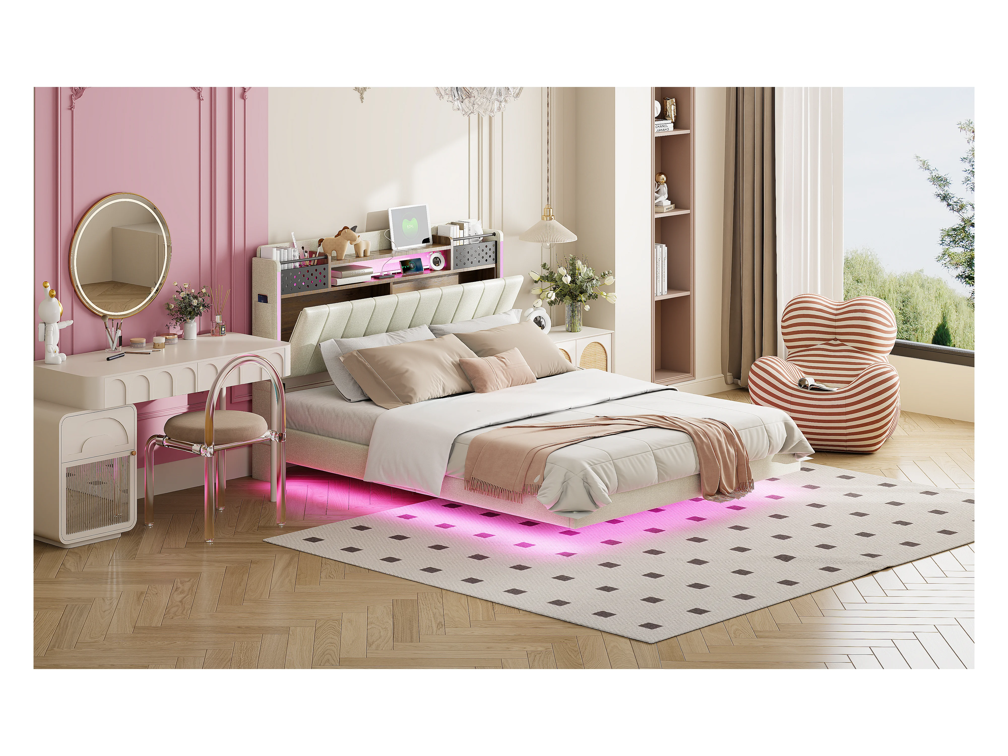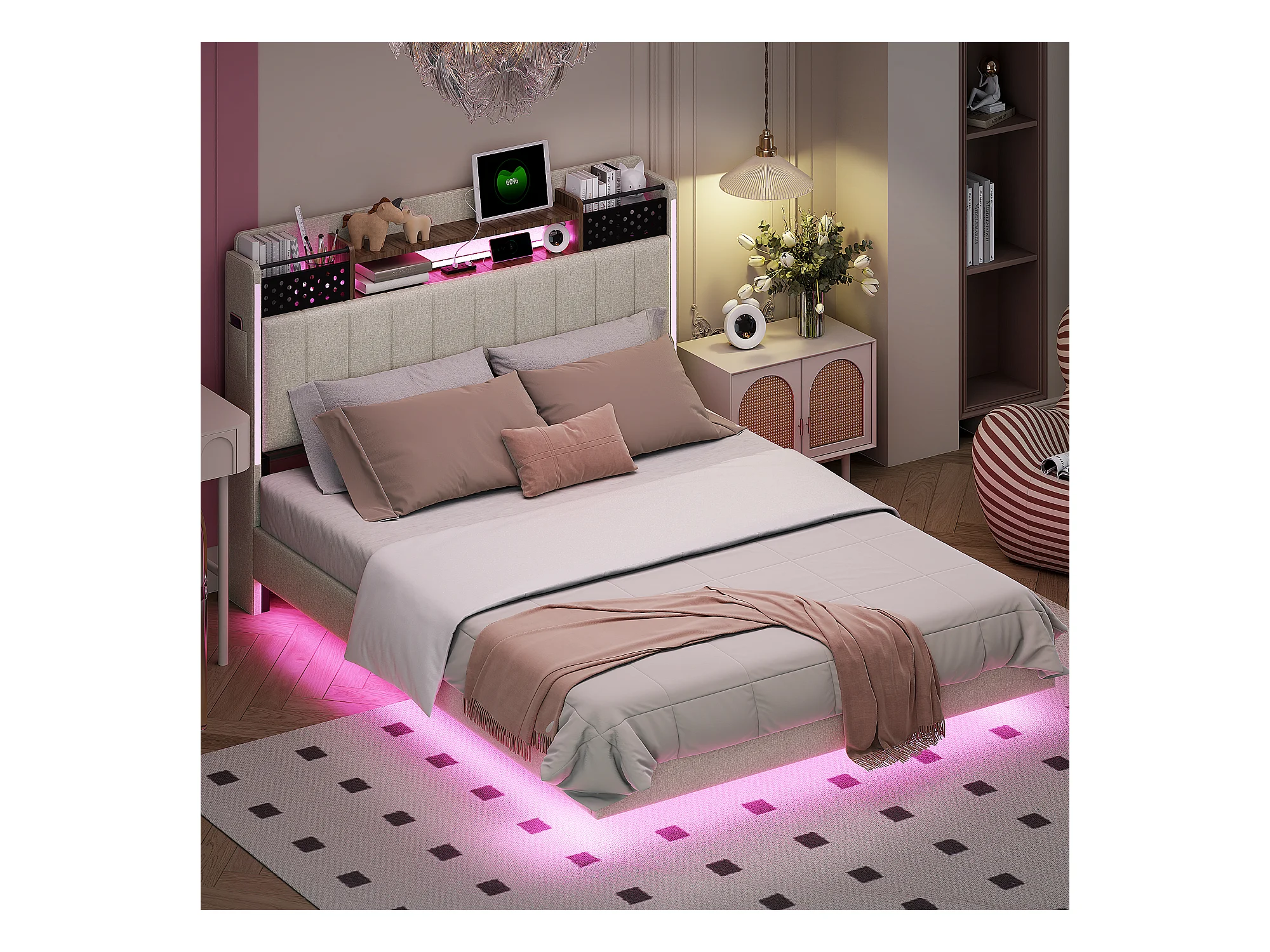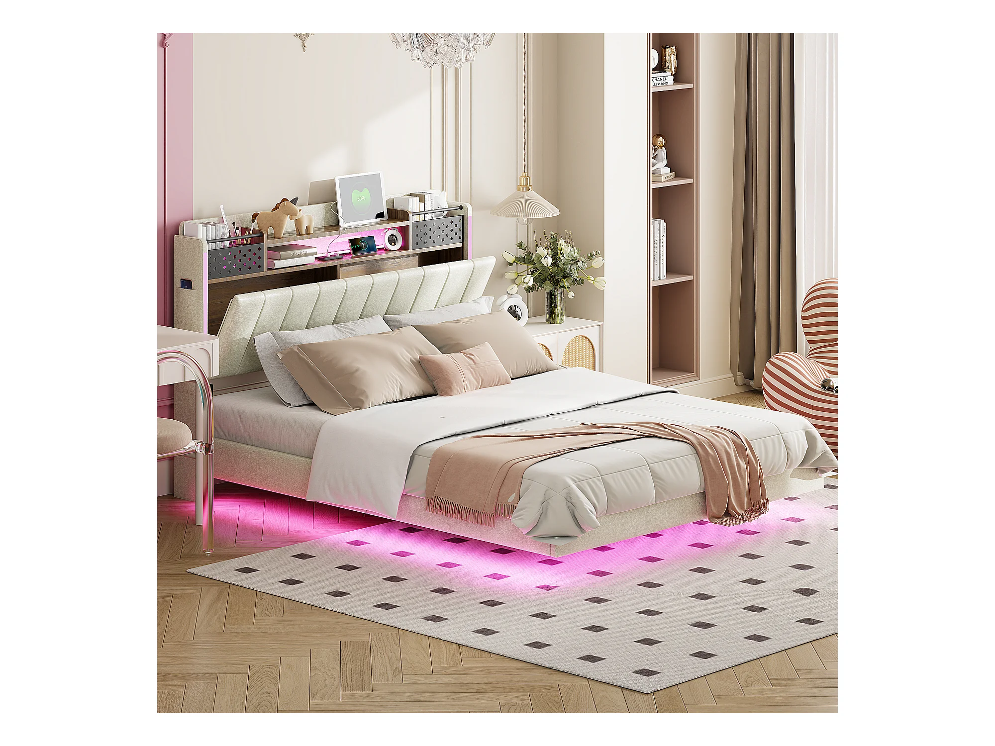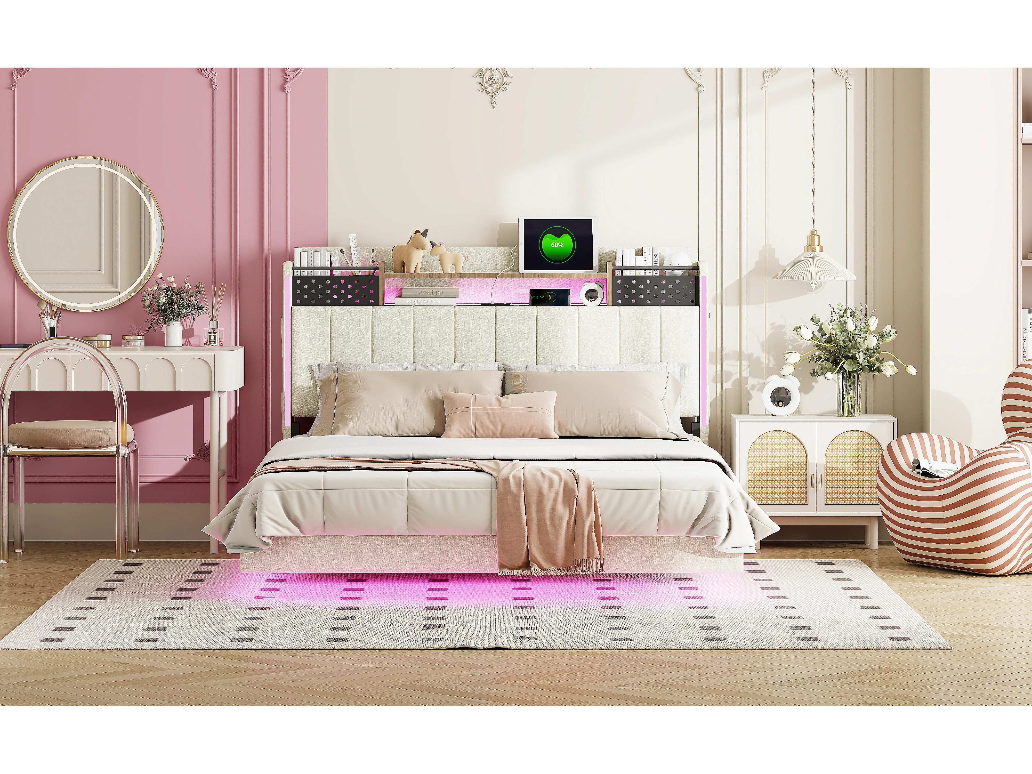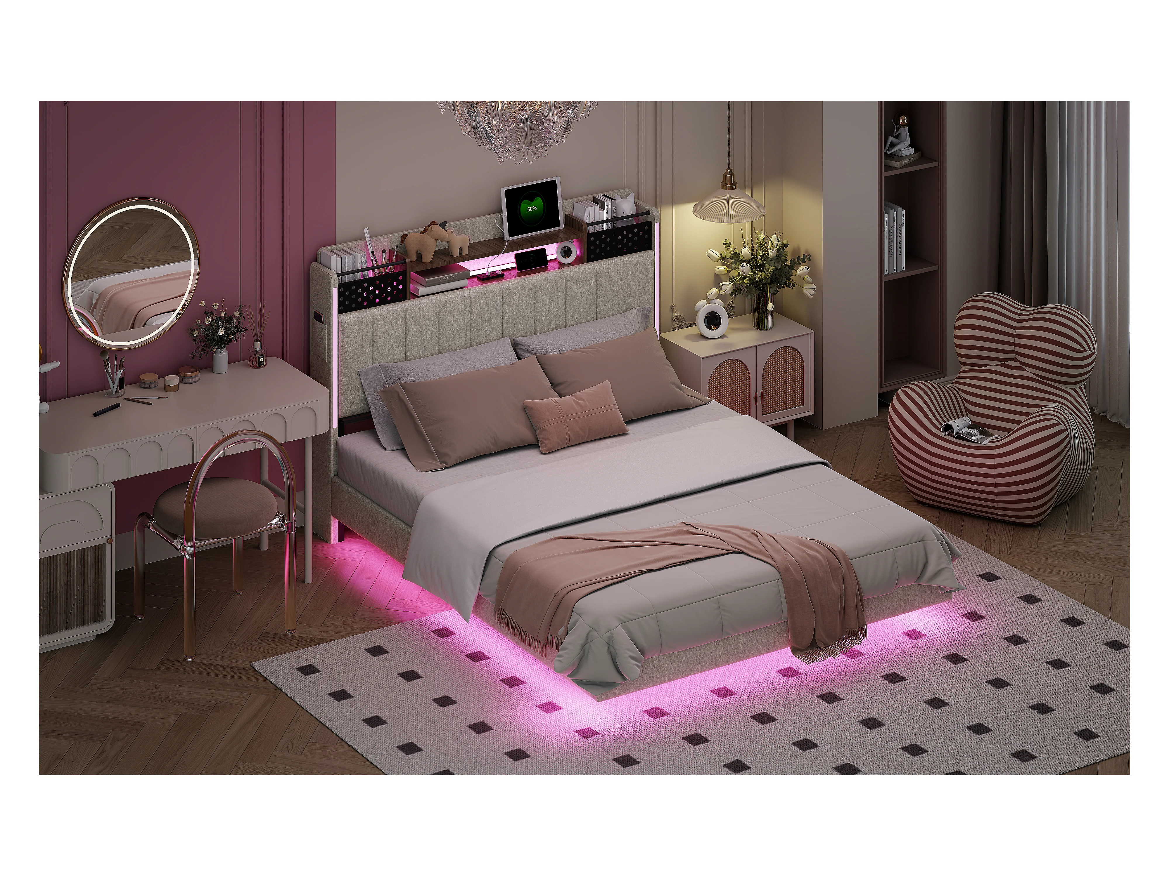 Polsterbett 140 x 200 cm mit Stauraum-Kopfteil – LED-Beleuchtung und USB-Buchse – Leinenstoff – Beige