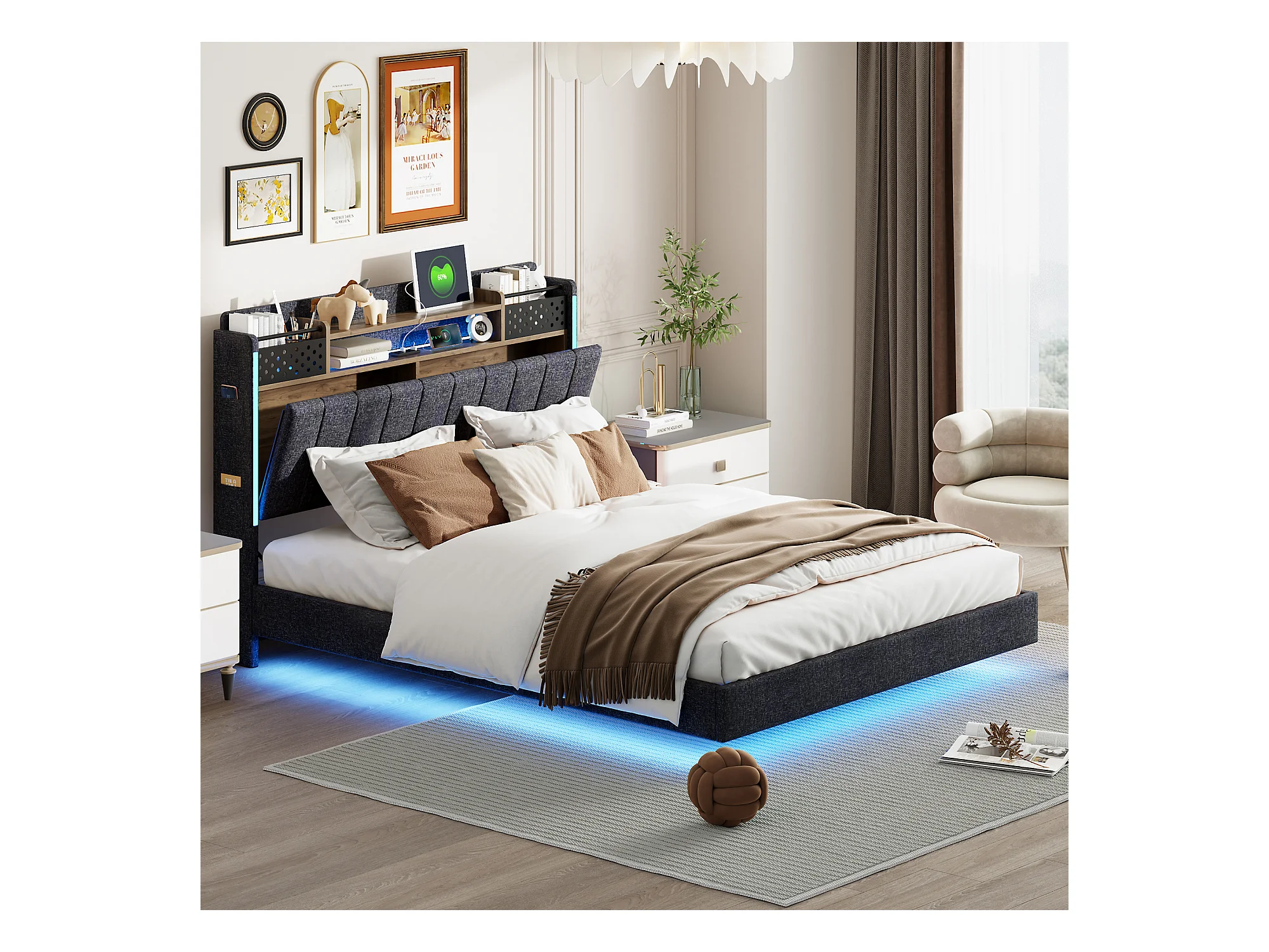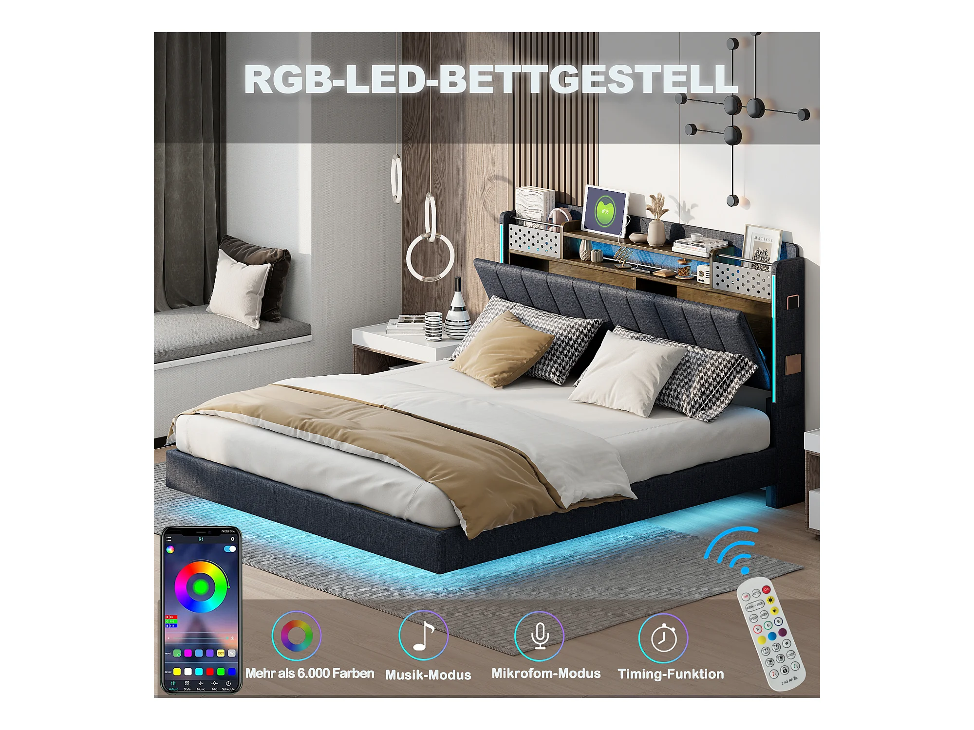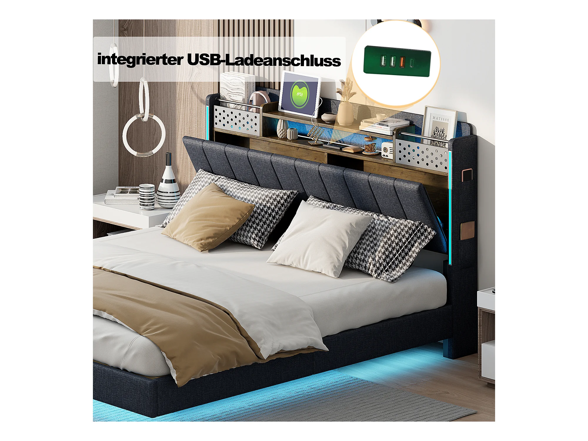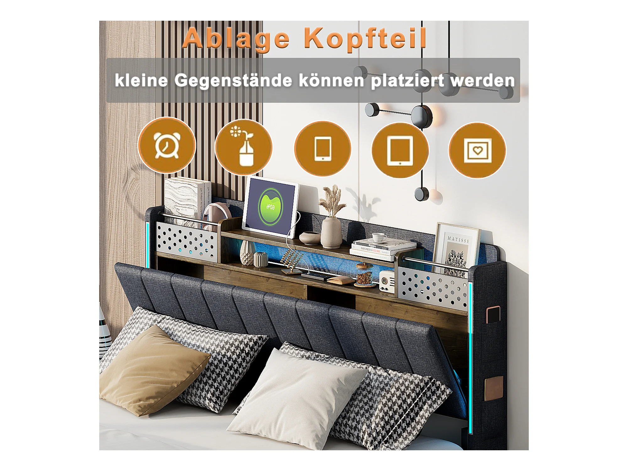 Polsterbett 140 x 200 cm mit Stauraum-Kopfteil – LED-Beleuchtung und USB-Buchse – Leinenstoff – Grau