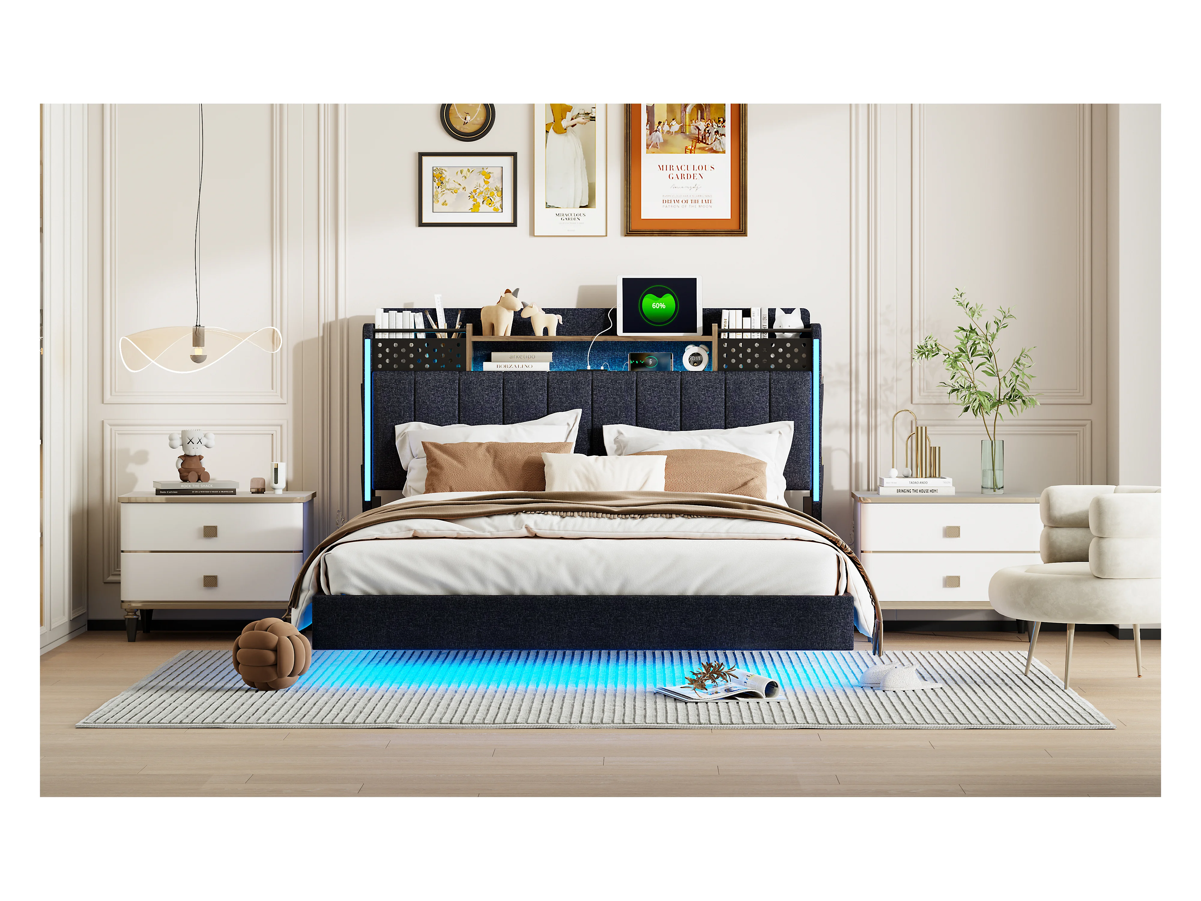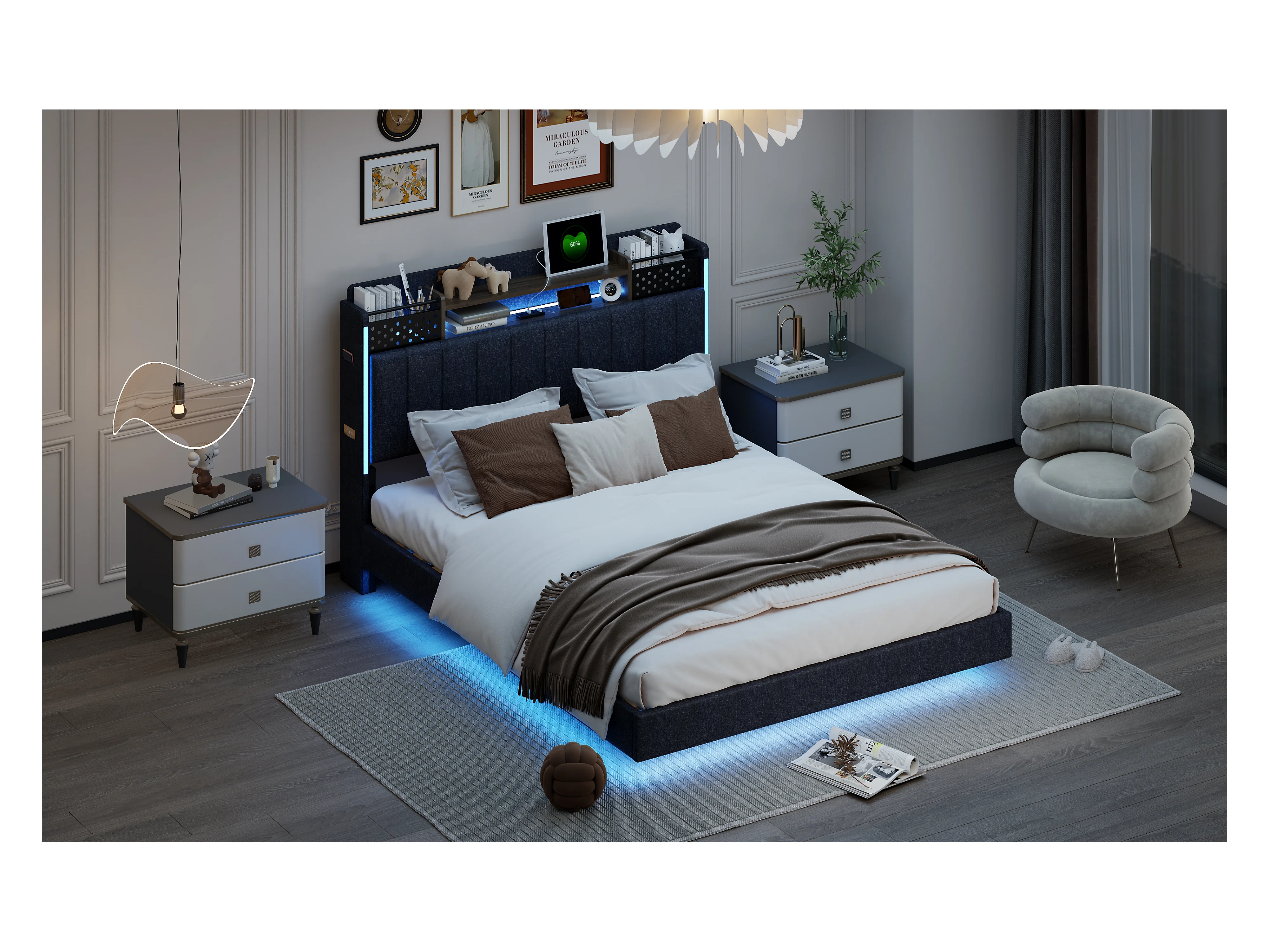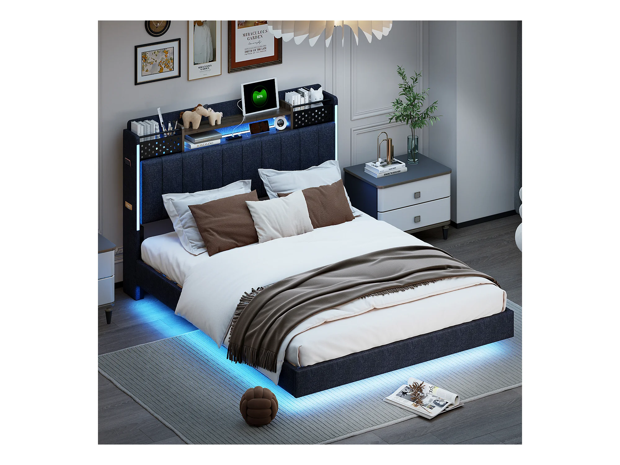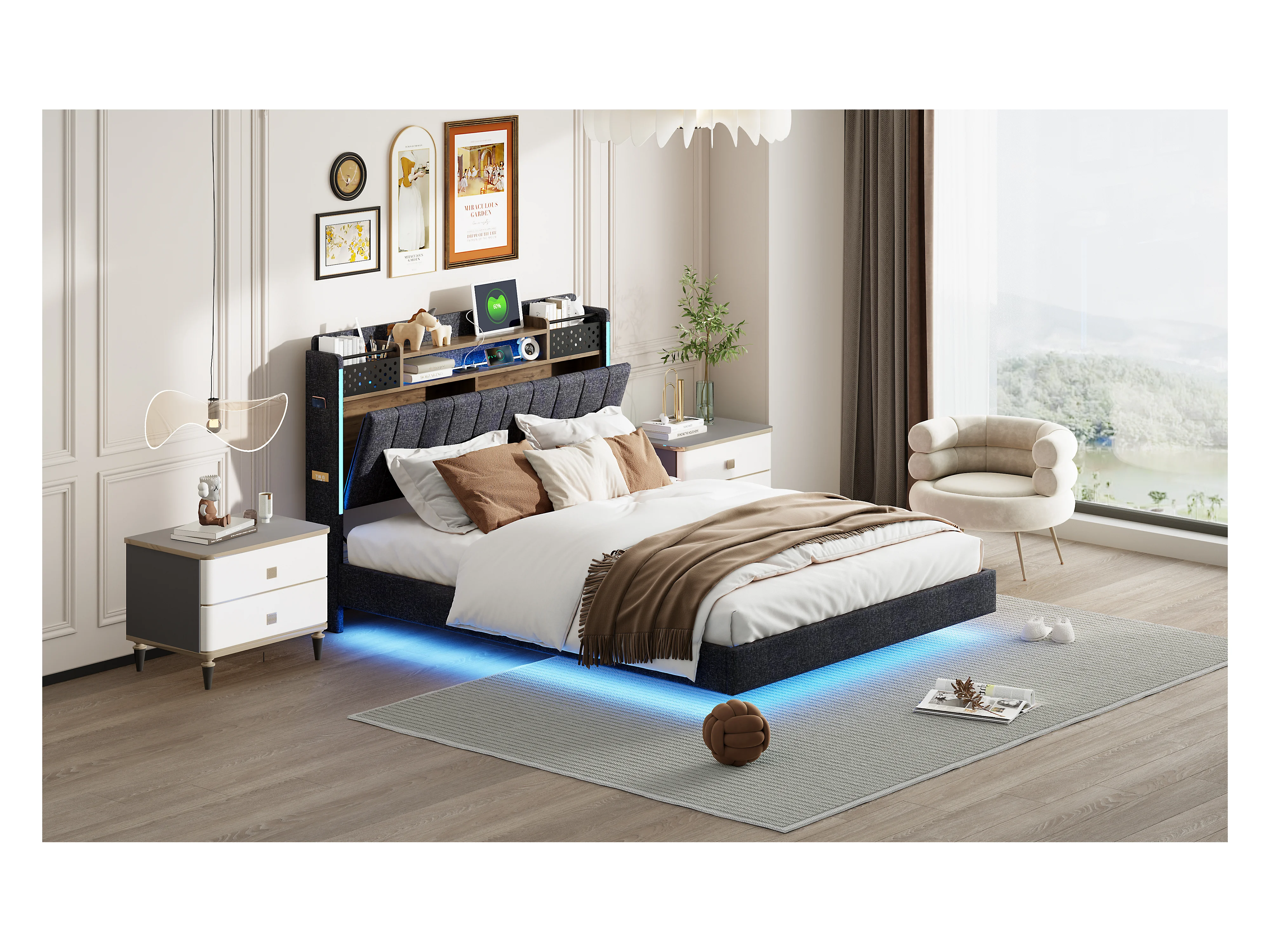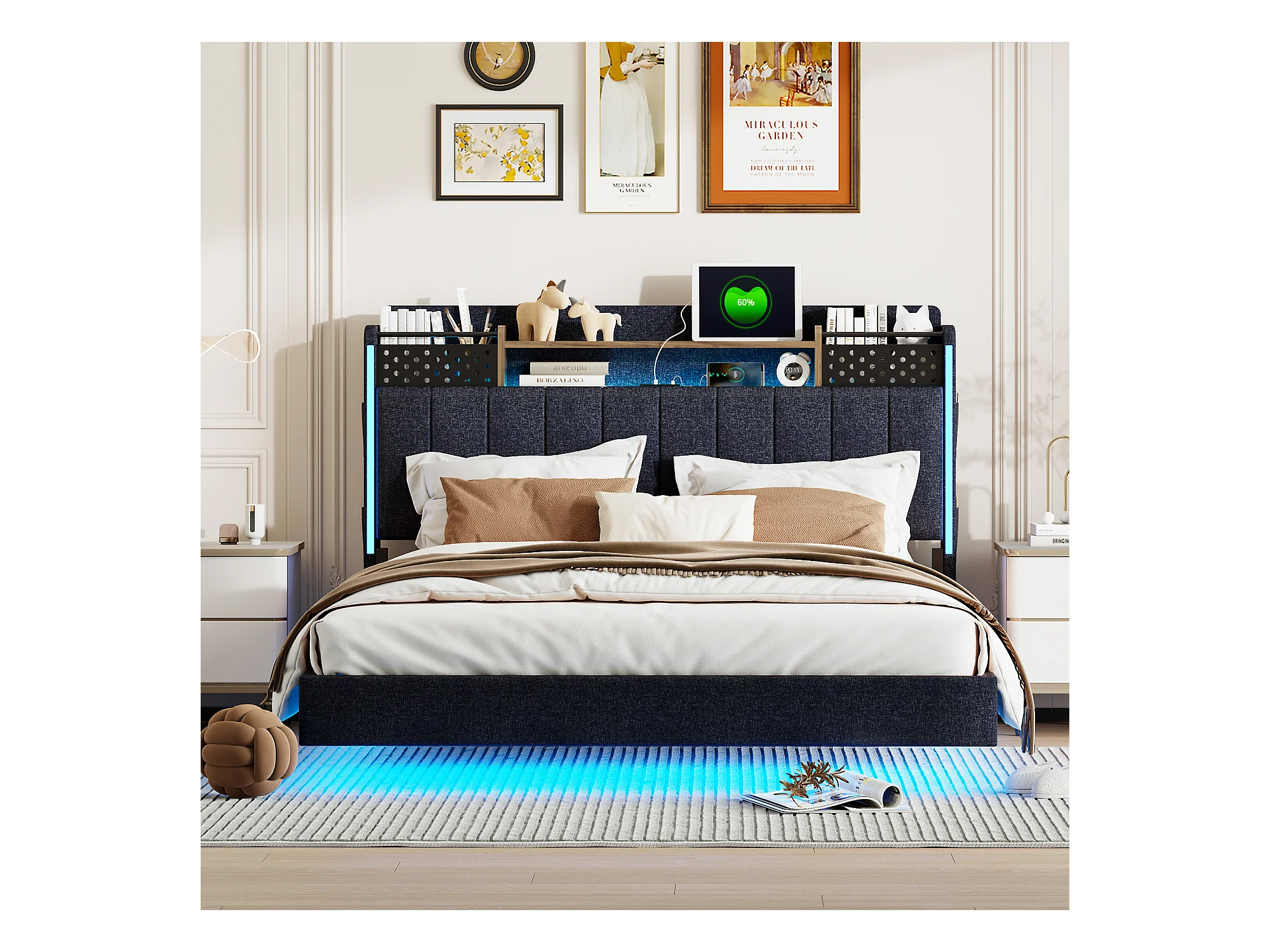 Polsterbett 140 x 200 cm mit Stauraum-Kopfteil – LED-Beleuchtung und USB-Buchse – Leinenstoff – Grau