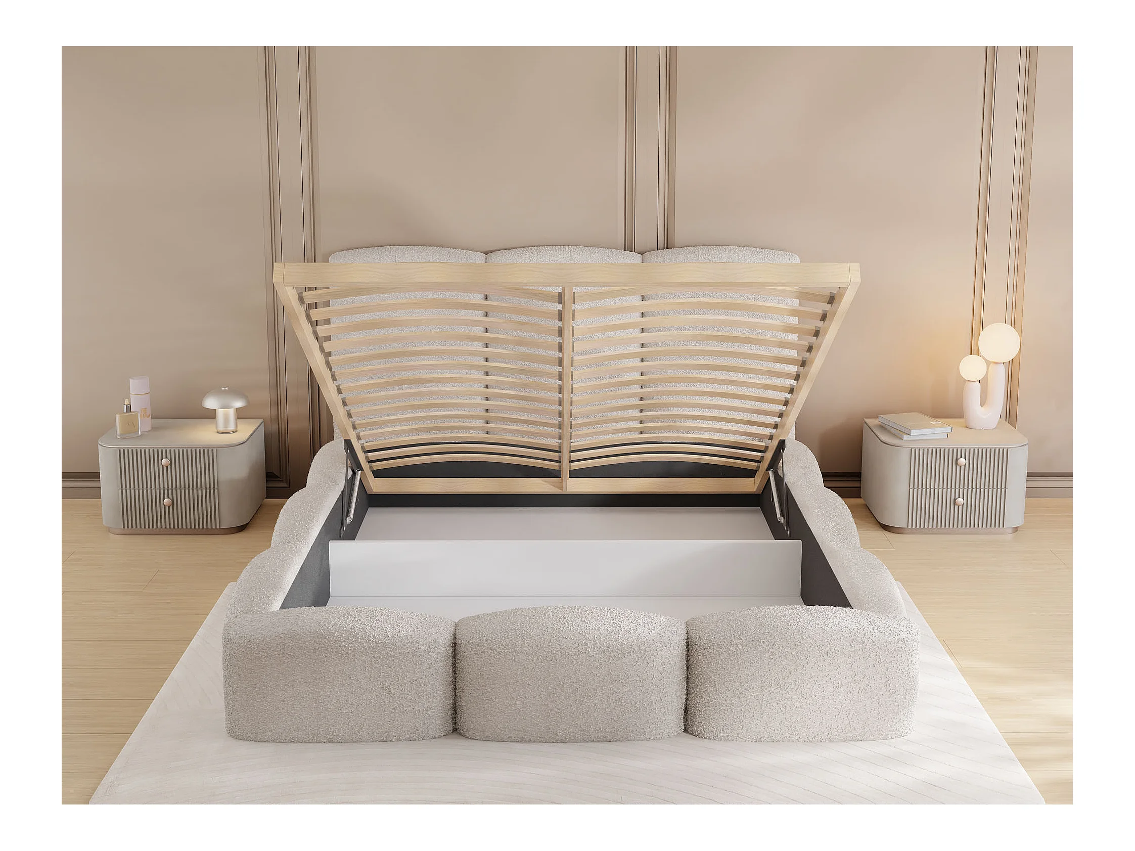 Polsterbett 140x200 – Bettkasten mit Lattenrost – Boucle oder Samt Beige – Hohes Kopfteil – Bettgestell ohne Matratze – Harmony – Modernes Doppelbett – Creme