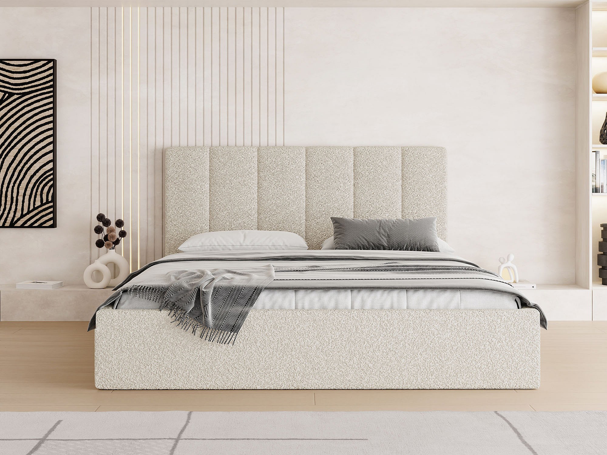 Polsterbett 140x200 mit Bettkasten, Lattenrost – hohe Kopfteil, Boucle Stoff – Modernes Doppelbett mit Stauraum – Bettgestell, ohne Matratze – Amira Slim – Creme