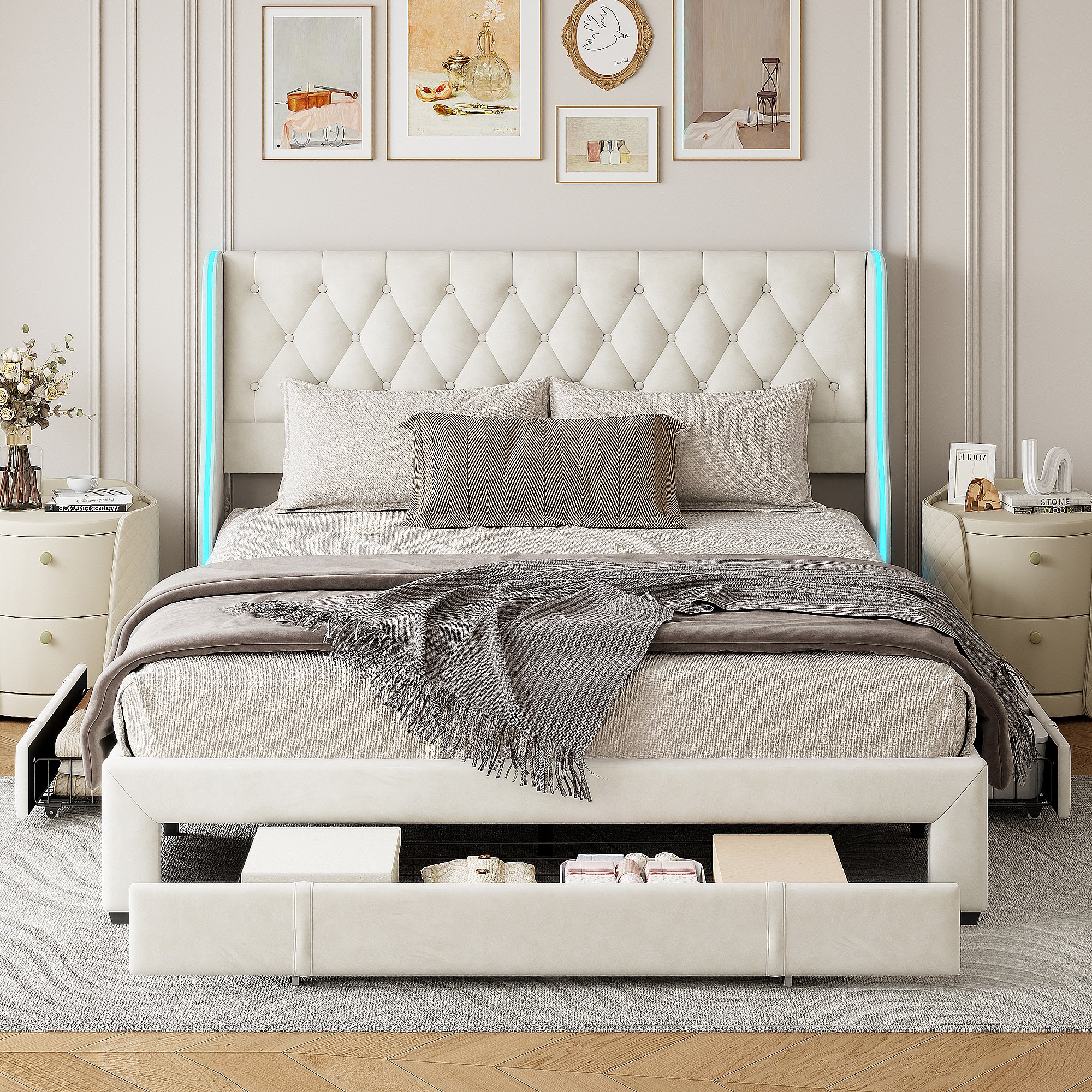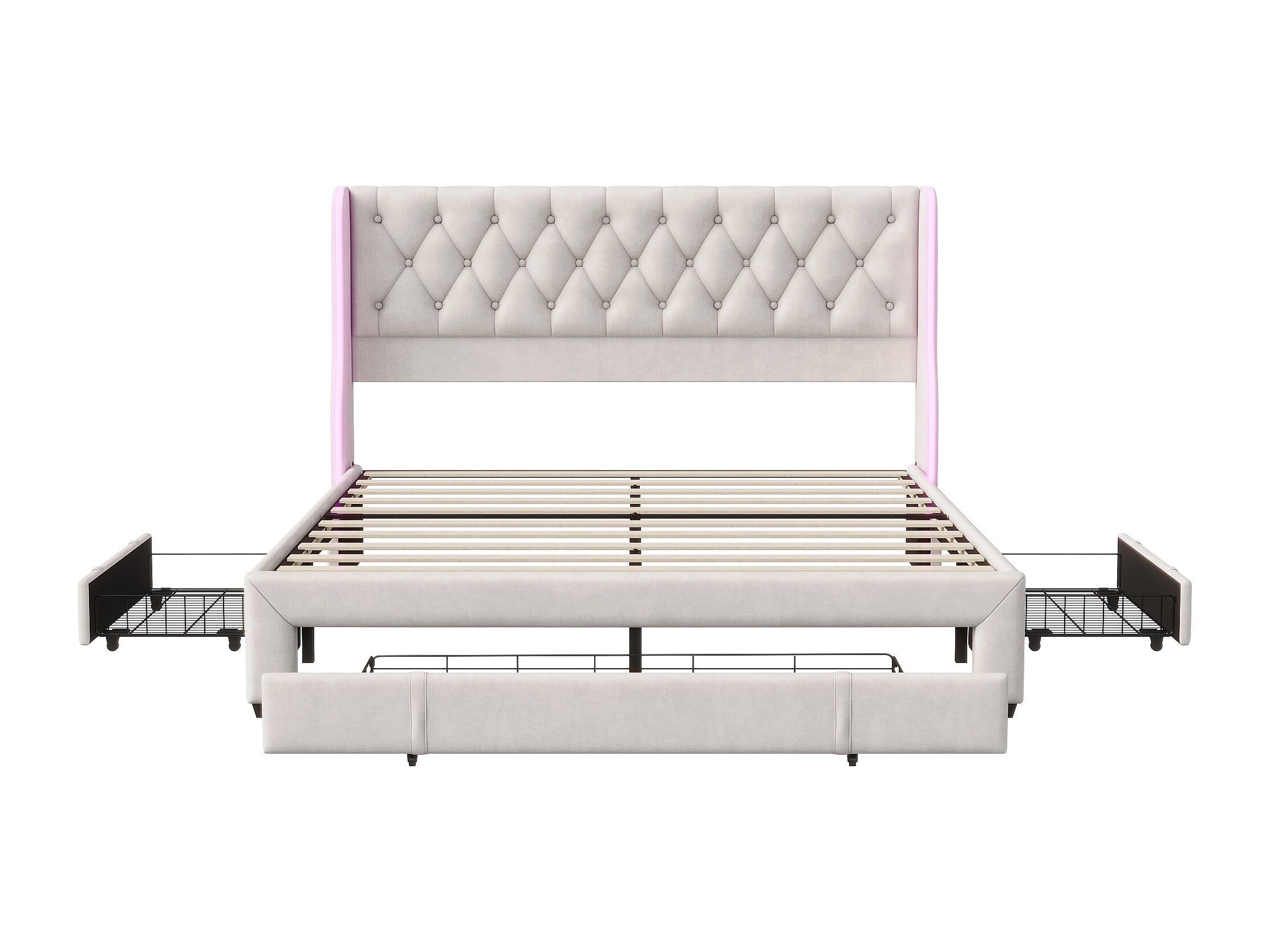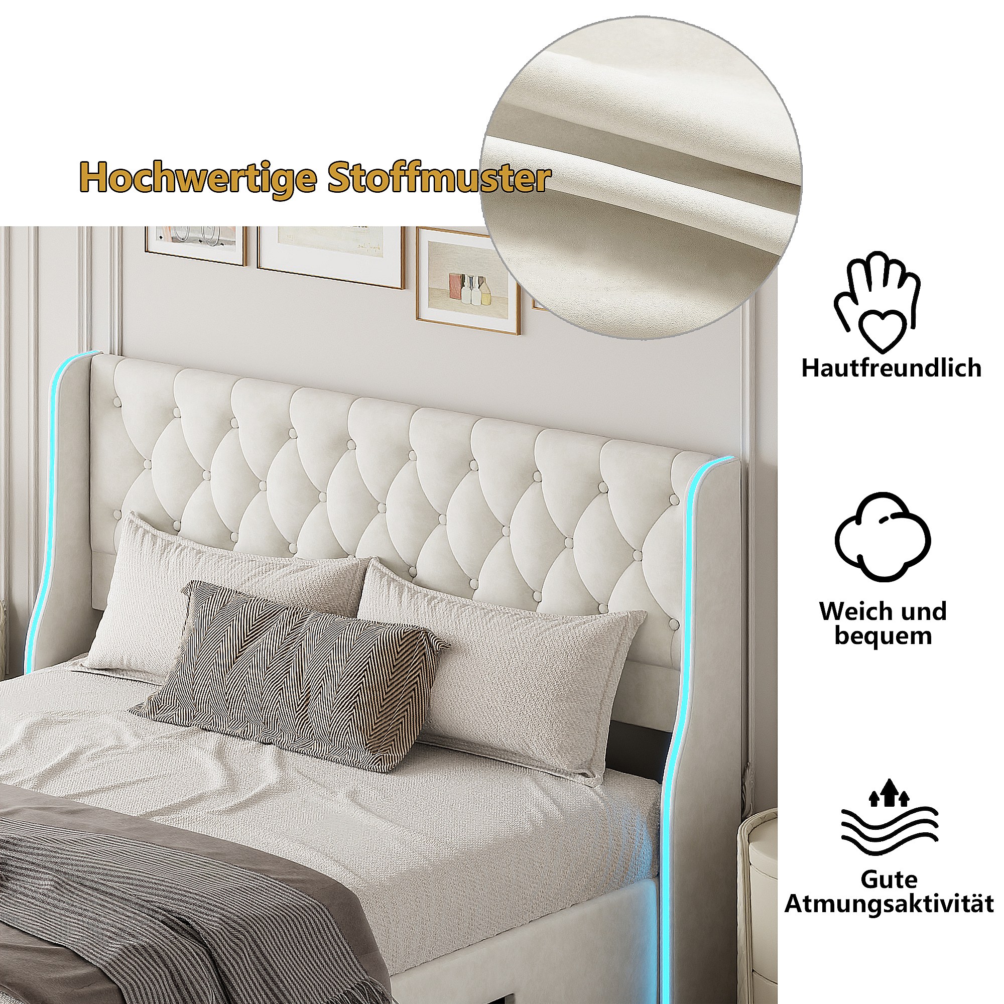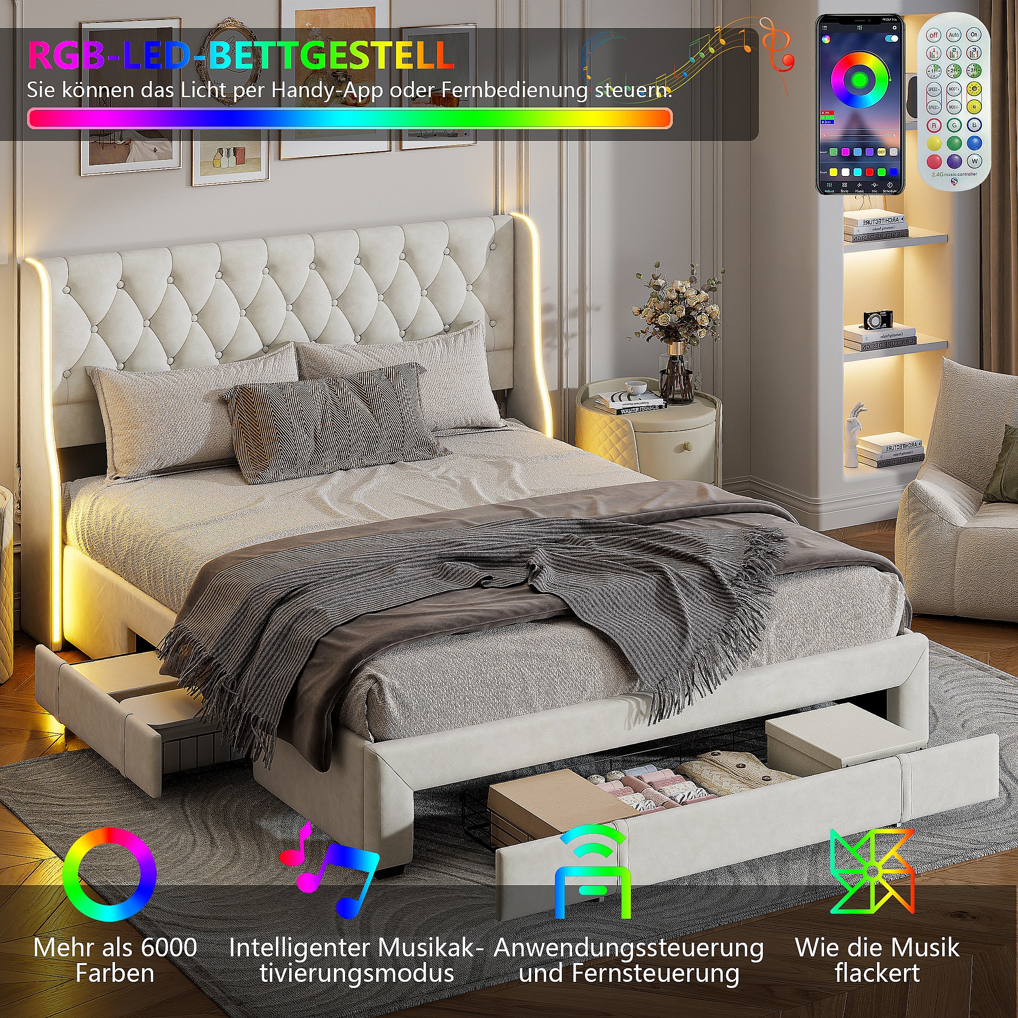 Polsterbett 140x200cm, Doppelbett mit 3 Schubladen, LED, Bettgestell, Samt, Beige