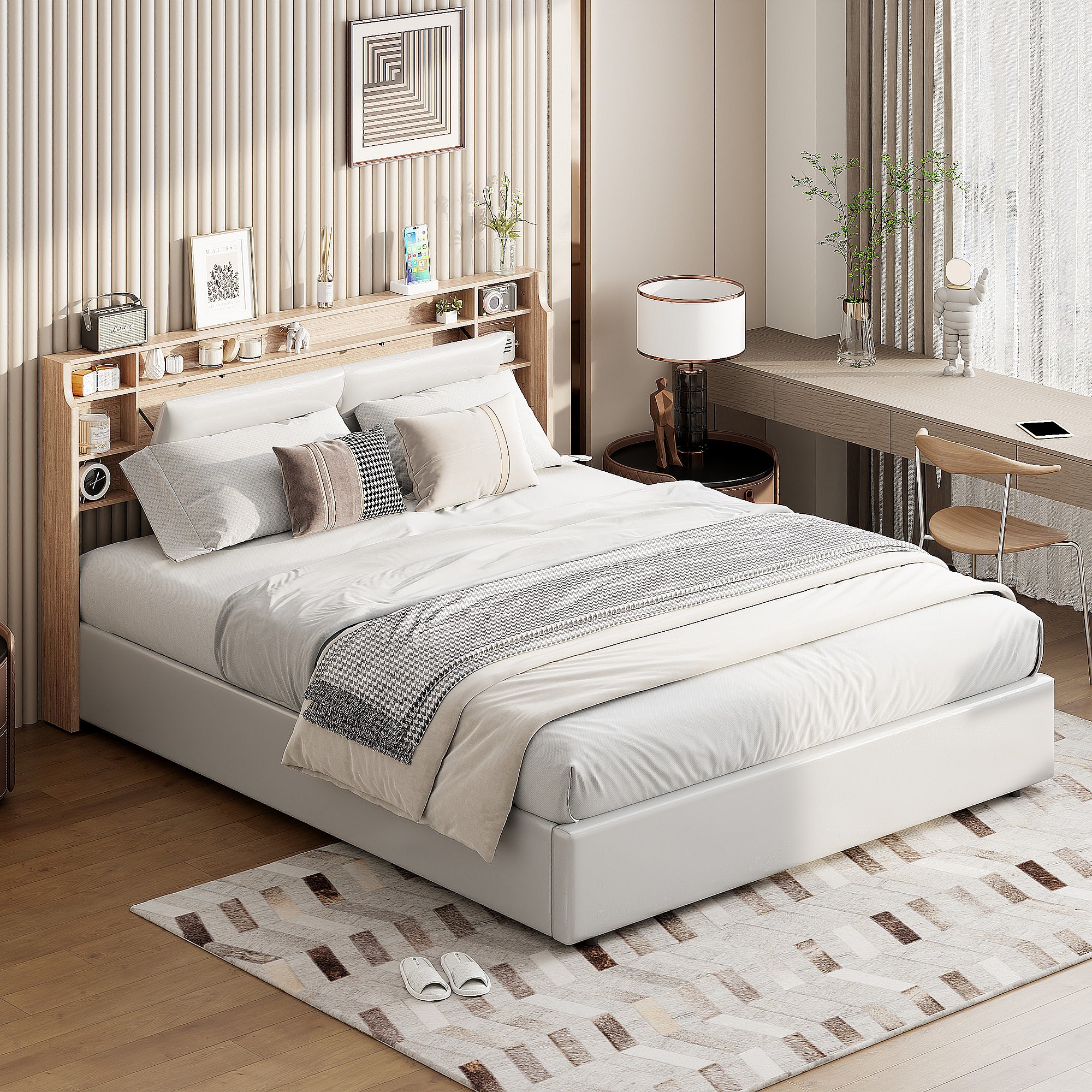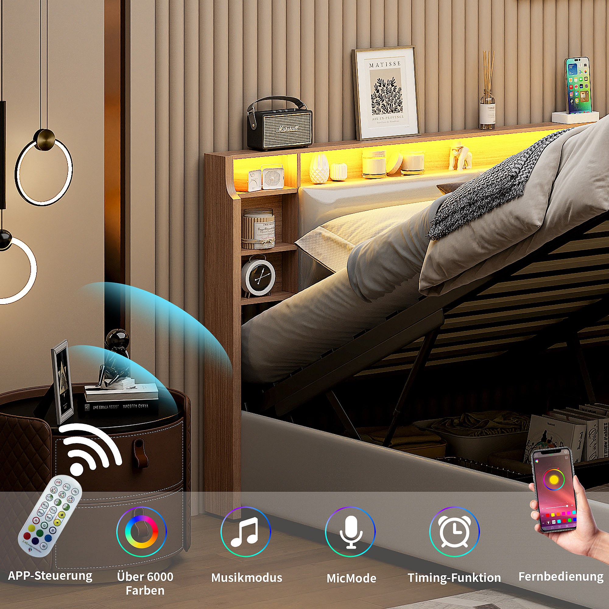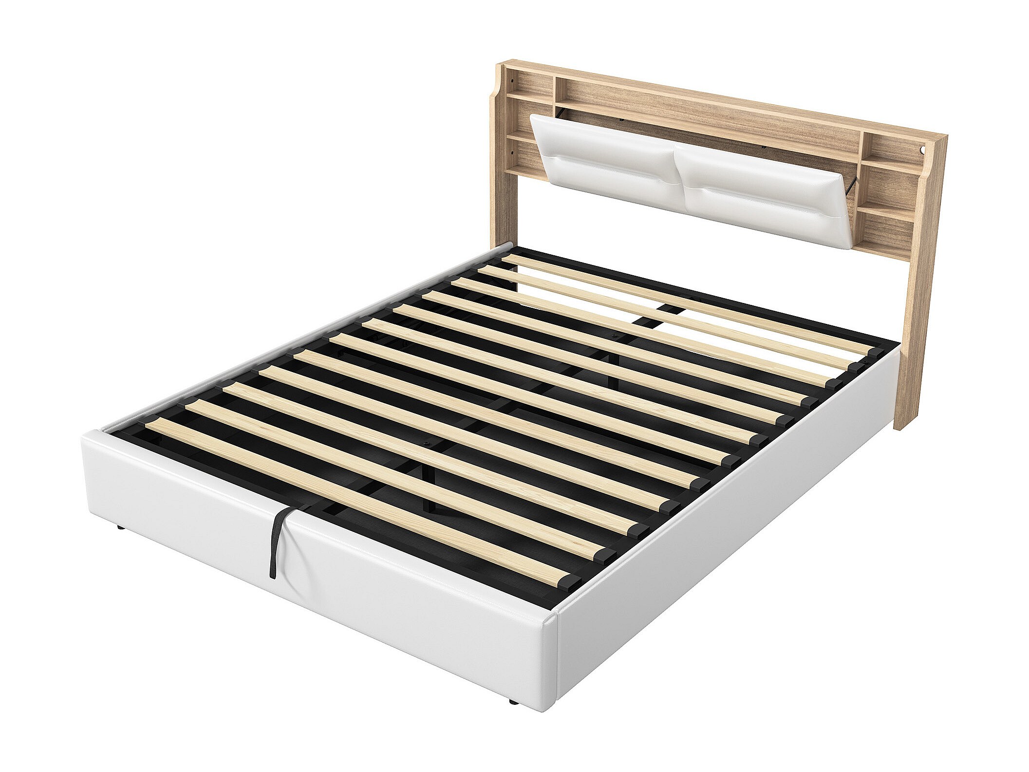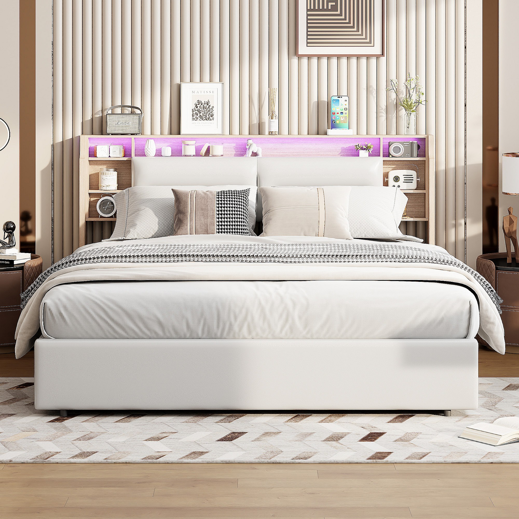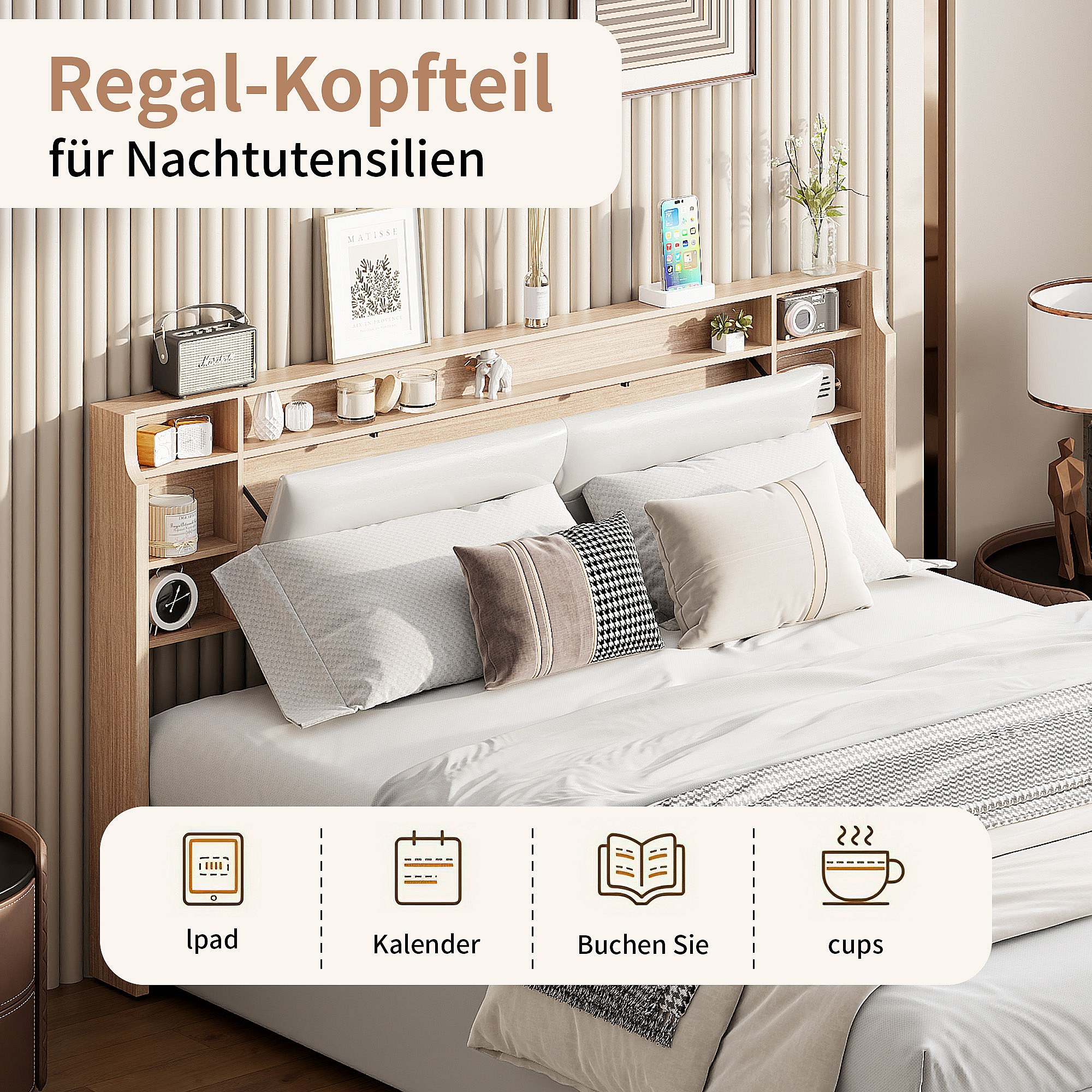 Polsterbett 140x200cm Doppelbett mit LED, Stauraumbett, Funktionsbett in Kunstleder, weiß