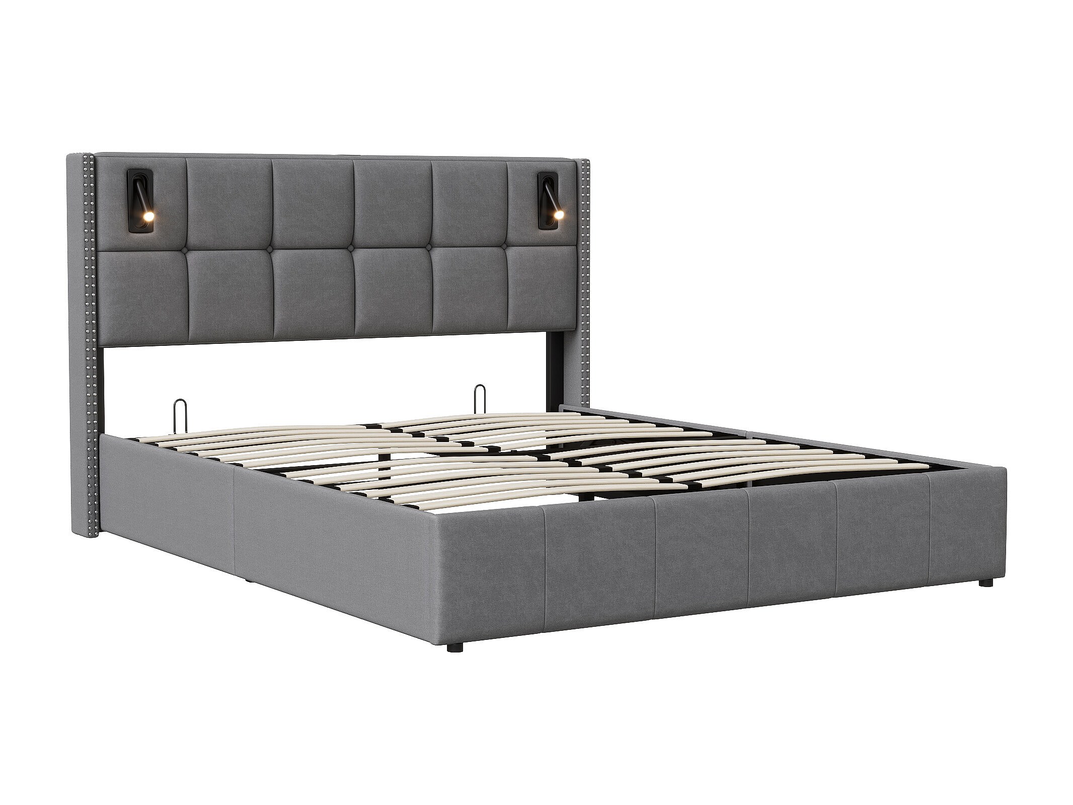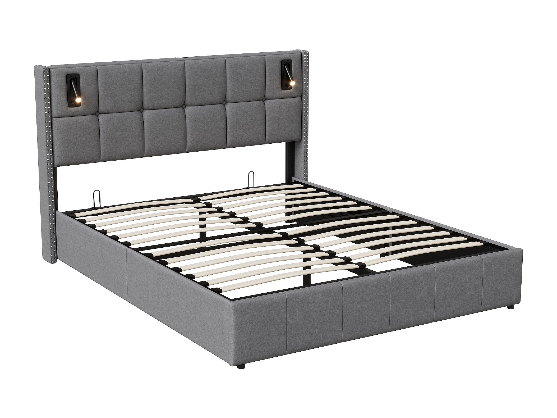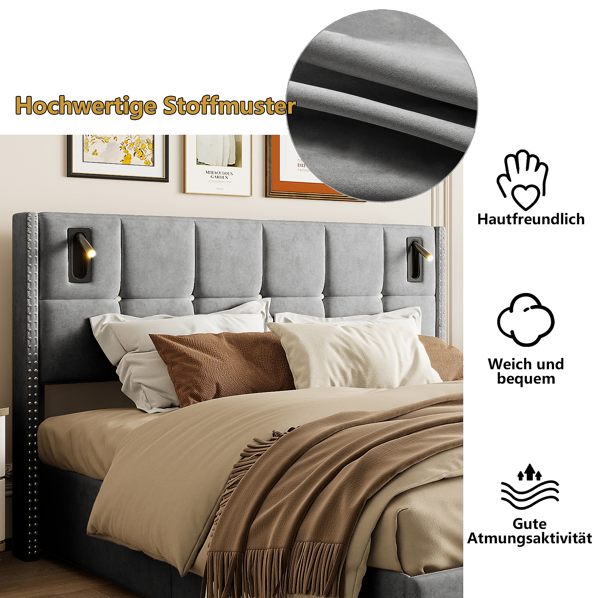 Polsterbett 140x200cm mit Lattenrost & Leseleuchten, Doppelbett Stauraumbett, Samt, grau