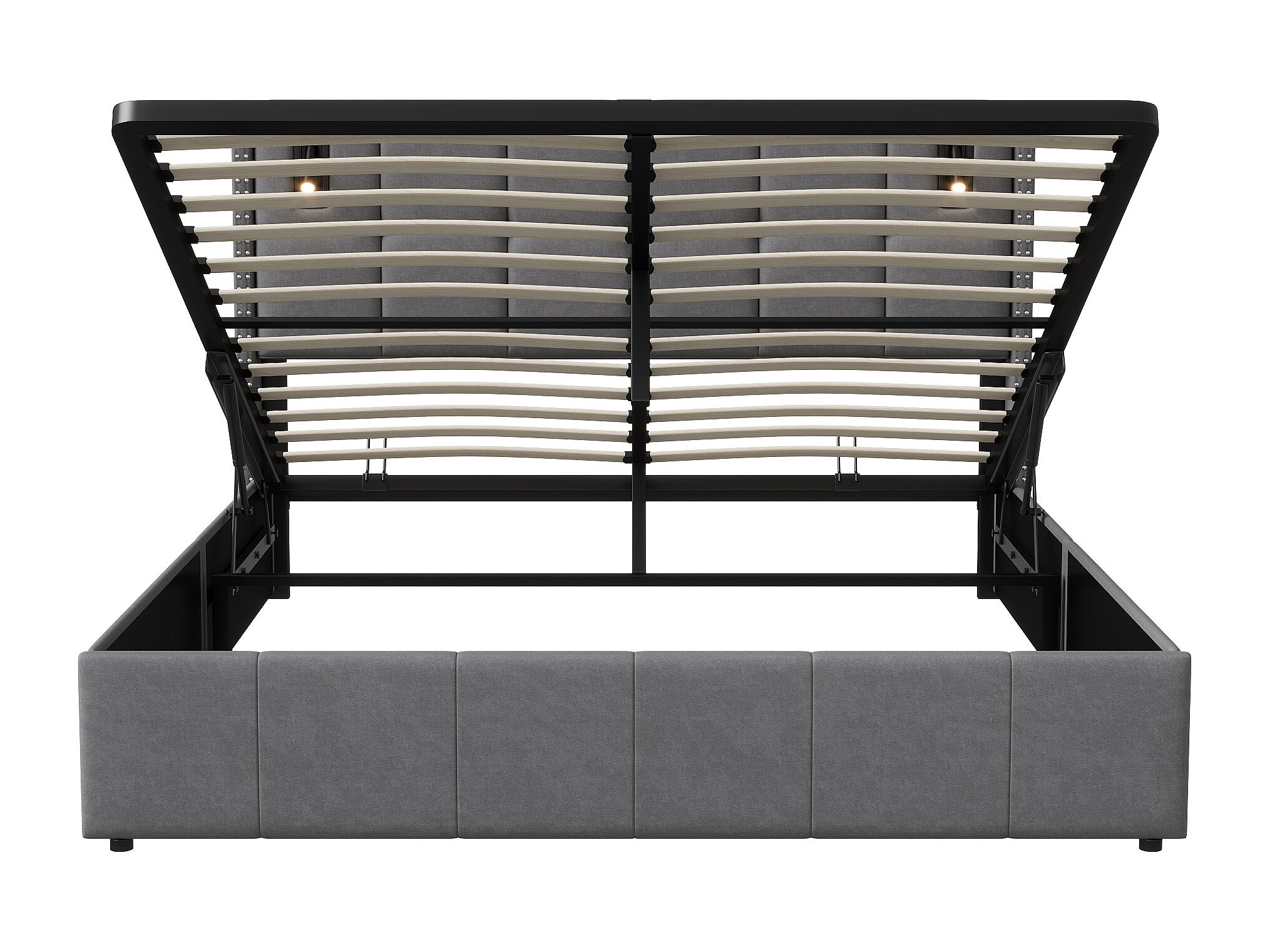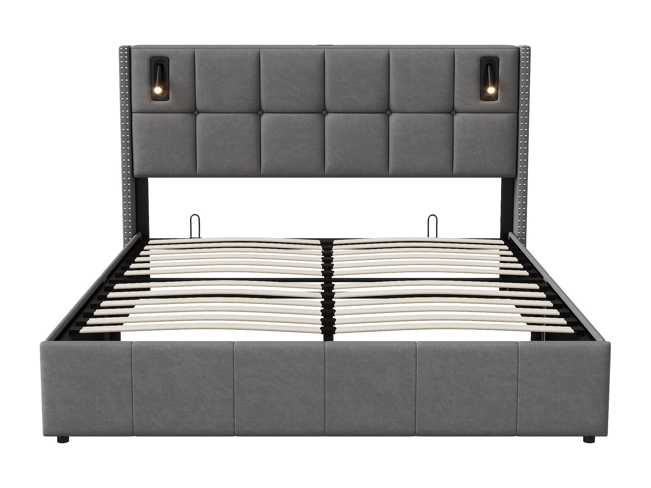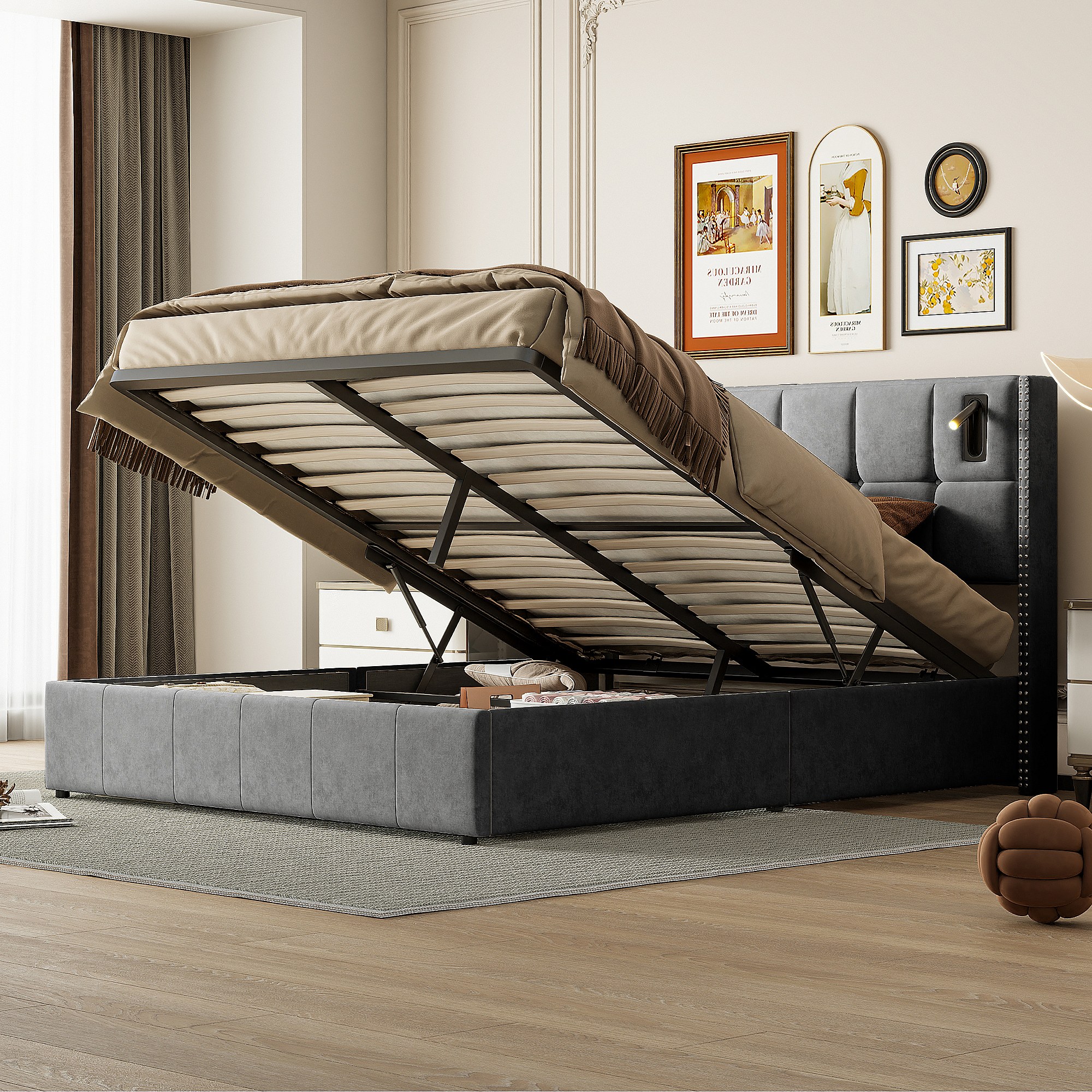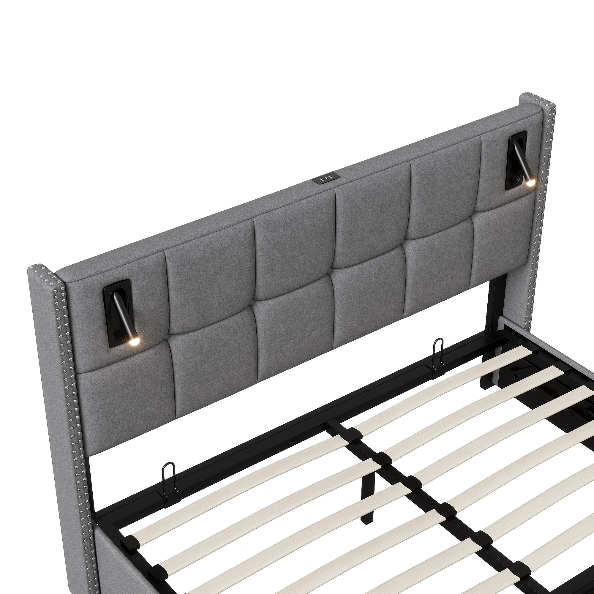 Polsterbett 140x200cm mit Lattenrost & Leseleuchten, Doppelbett Stauraumbett, Samt, grau