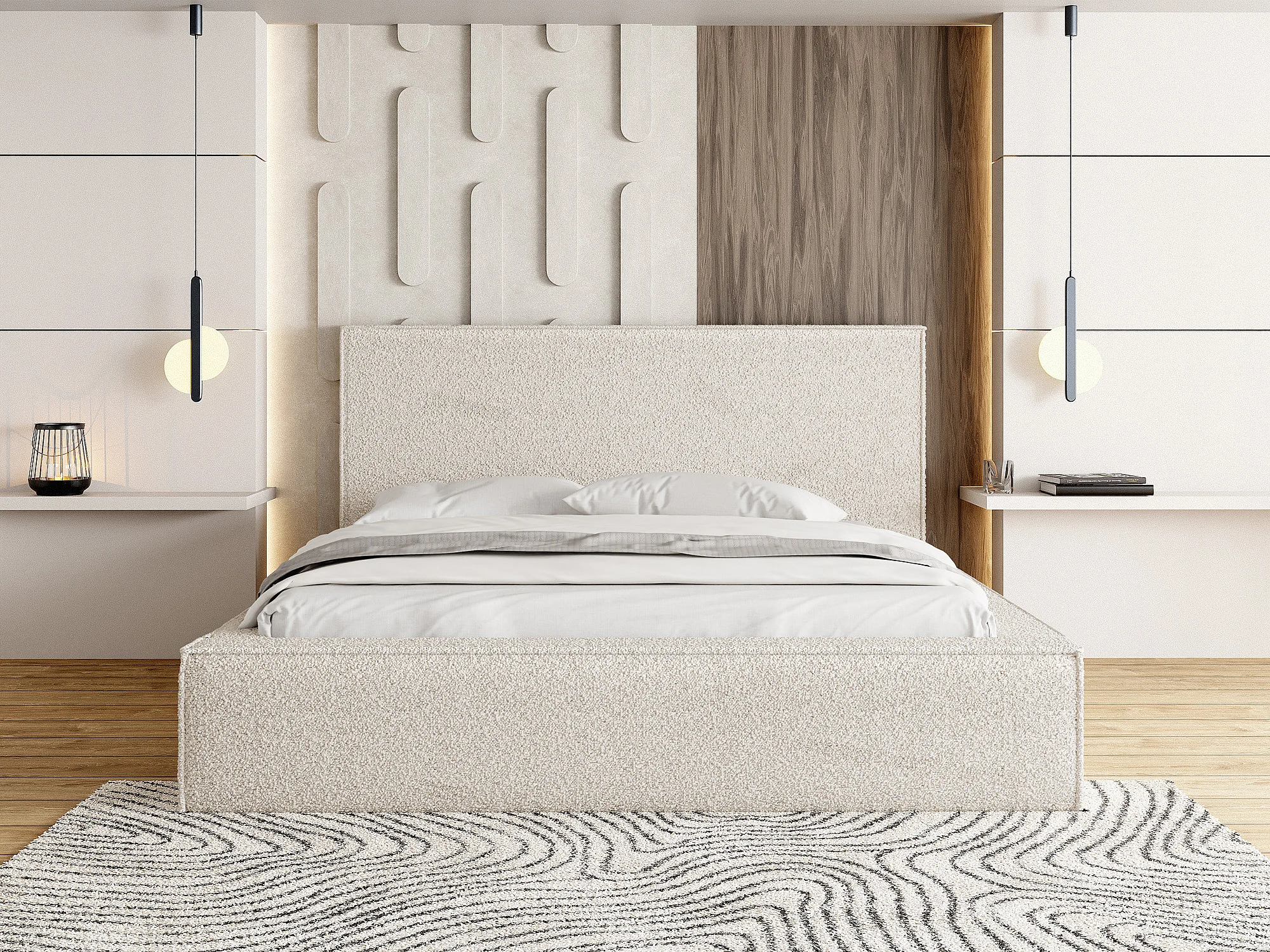 Polsterbett 160x200 – Bettkasten mit Lattenrost – Bouclé oder Samt Creme – Hohes Kopfteil – Bettgestell ohne Matratze – Terra – Modernes Doppelbett – Beige