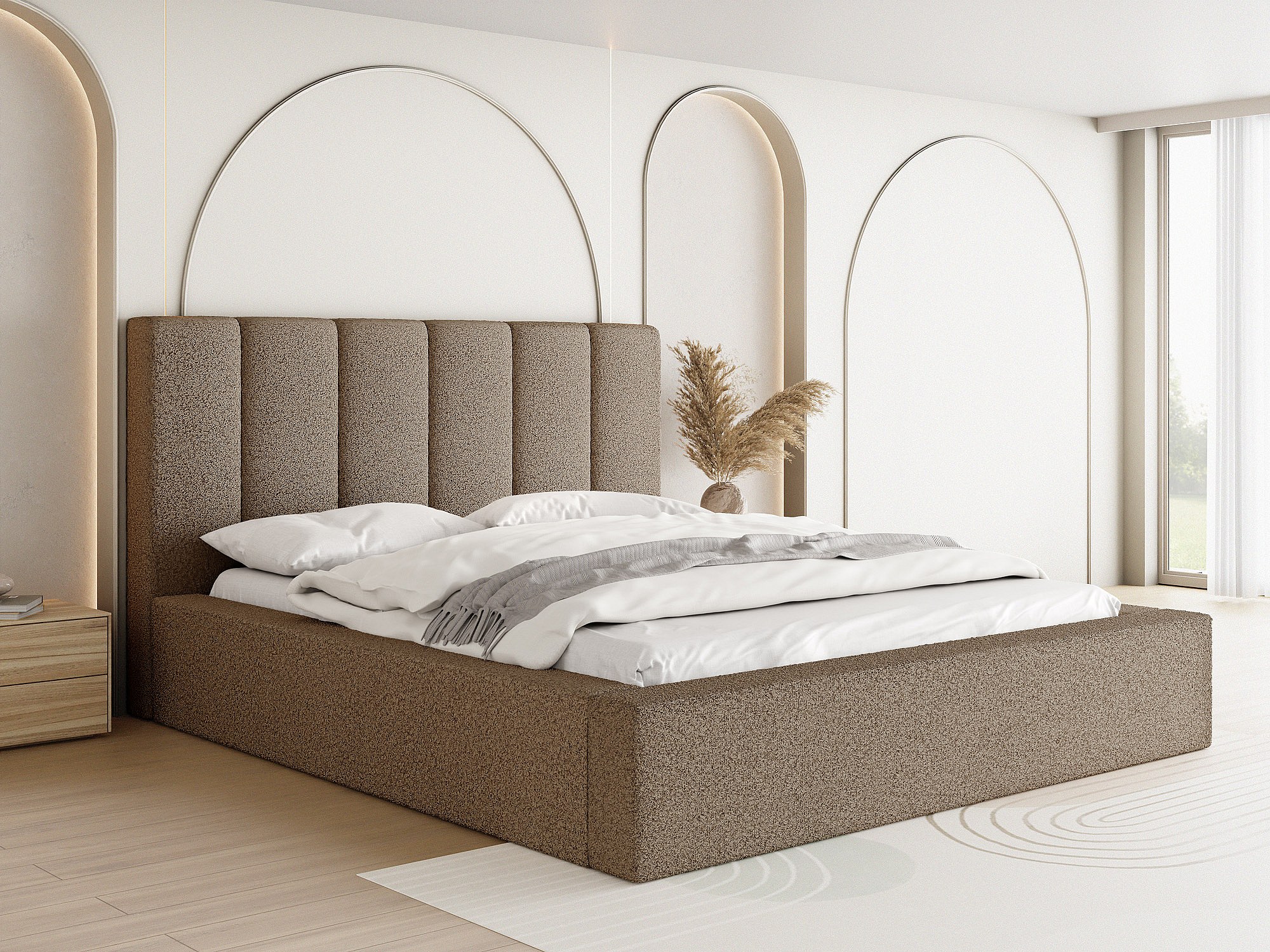Polsterbett 160x200 – Bettkasten mit Lattenrost – Boucle oder Samt – Hohes Kopfteil – Bettgestell ohne Matratze – Amira – Modernes Doppelbett – Braun
