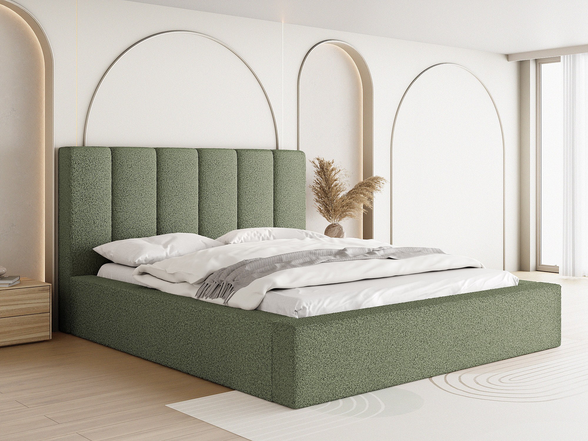 Polsterbett 180x200 – Bettkasten mit Lattenrost – Boucle oder Samt Grün – Hohes Kopfteil – Bettgestell ohne Matratze – Amira – Modernes Doppelbett – Olivgrün