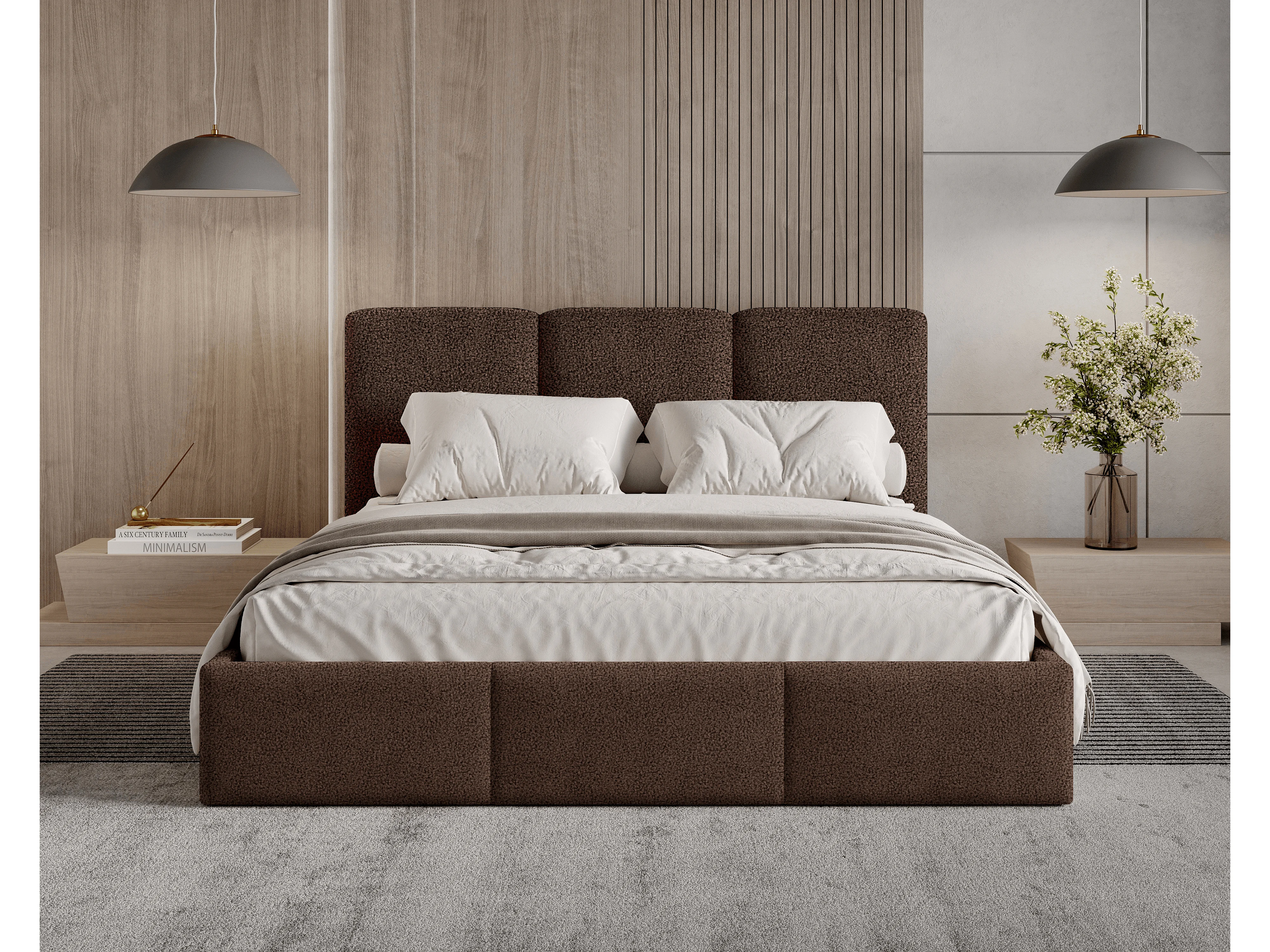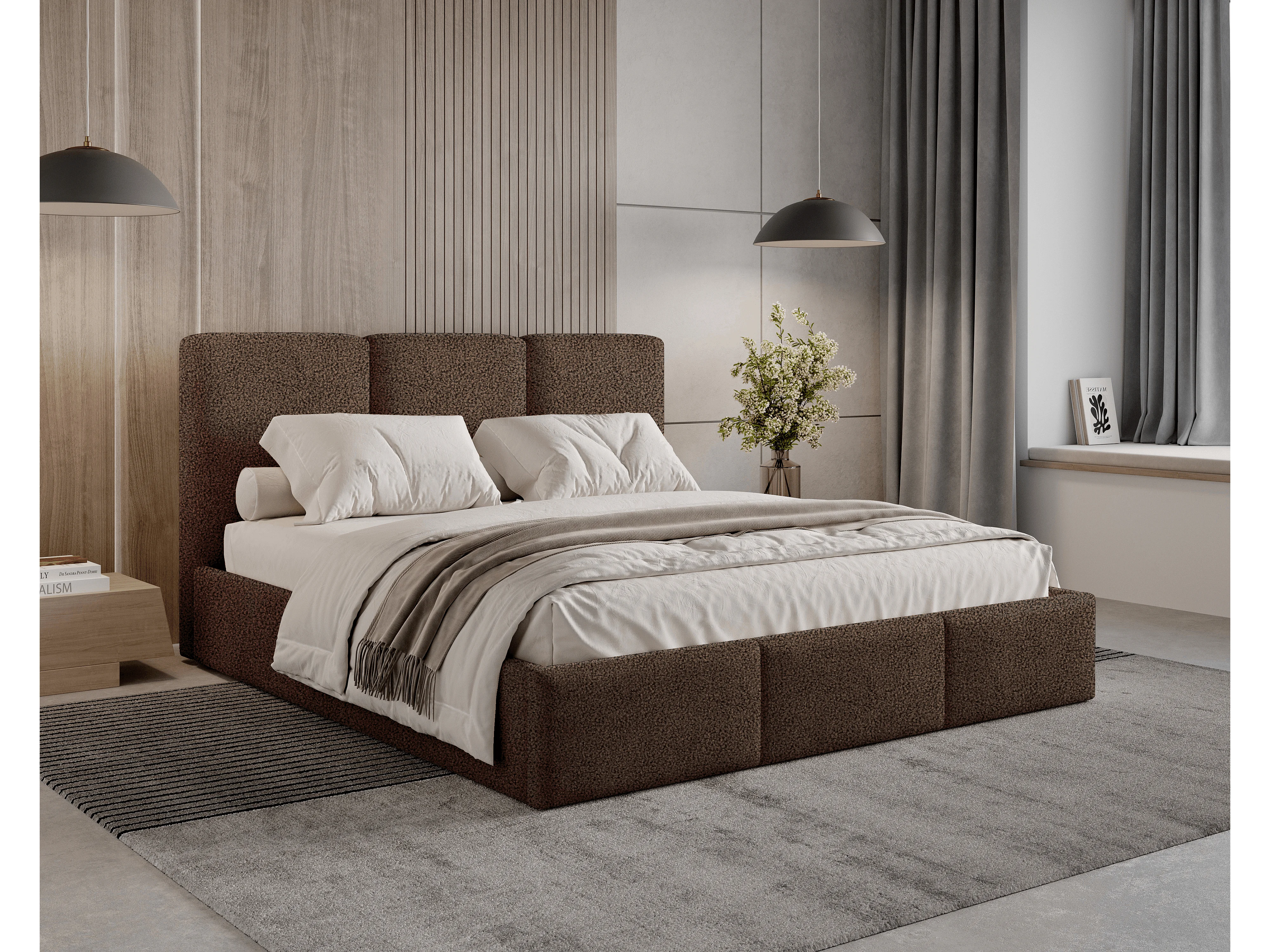 Polsterbett 180x200 Elora Bouclé – Bett mit Bettkasten und Lattenrost, modernes Stauraumbett, Schlafzimmerbett, trendiger Bouclé Stoff – Braun