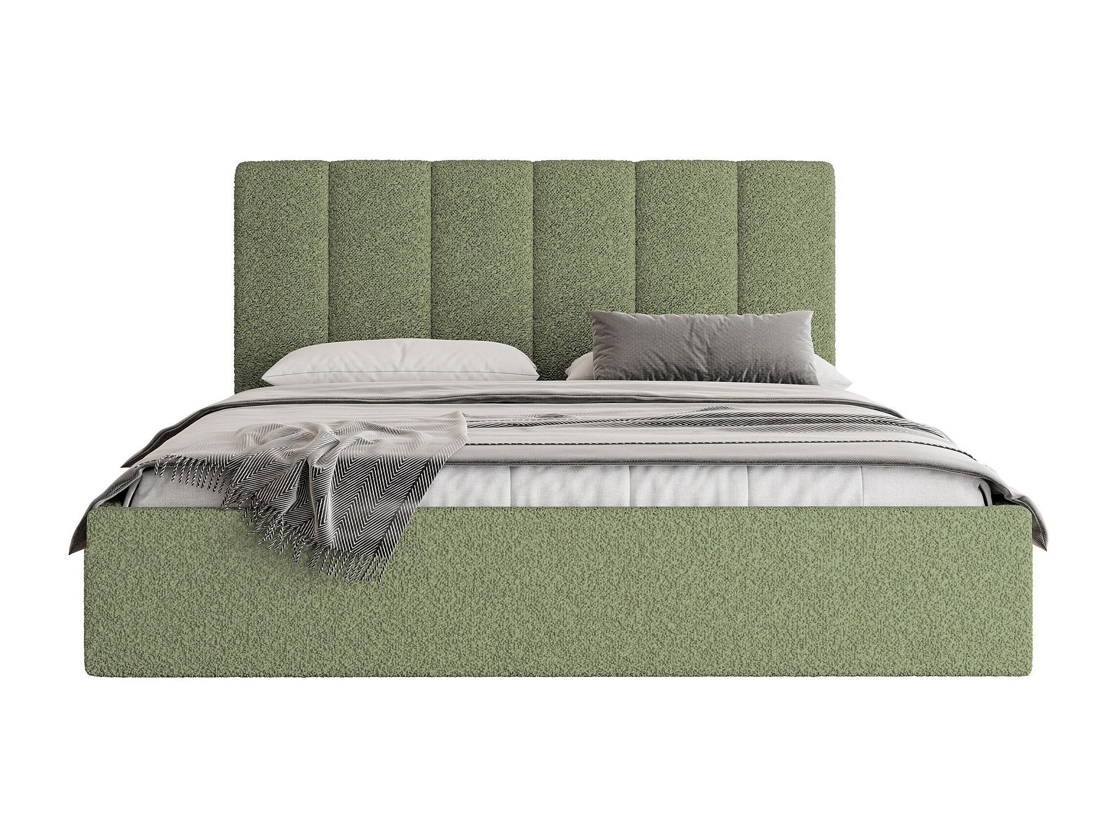 Polsterbett 180x200 mit Bettkasten, Lattenrost – hohe Kopfteil, Boucle Stoff – Modernes Doppelbett mit Stauraum – Bettgestell, ohne Matratze – Amira Slim – Grün