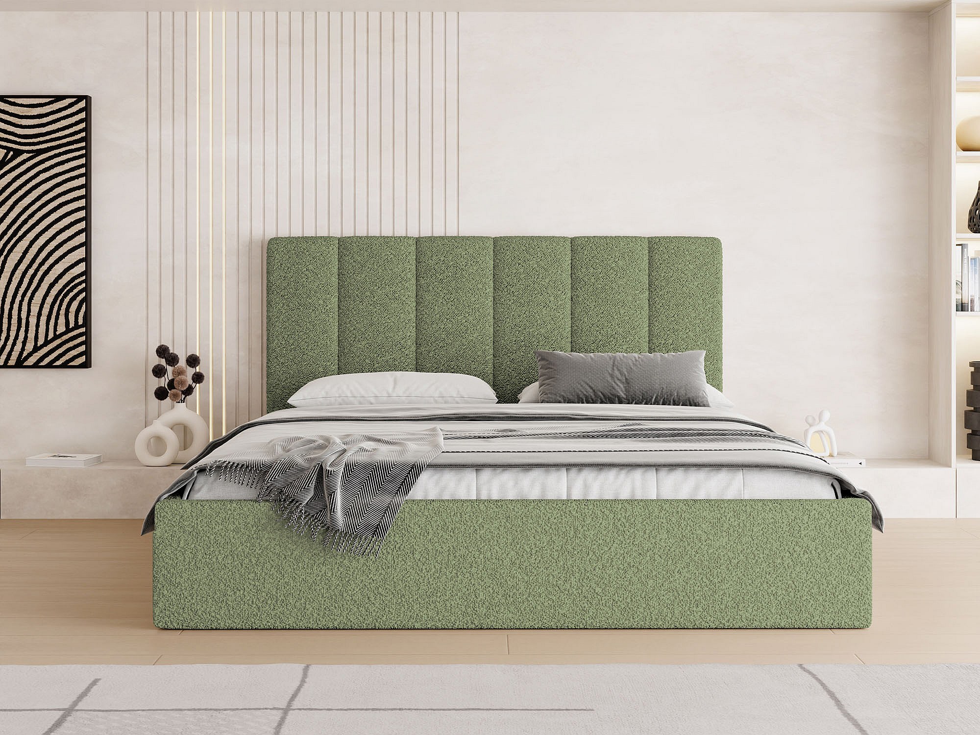Polsterbett 200x200 mit Bettkasten, Lattenrost – hohe Kopfteil, Boucle Stoff – Modernes Doppelbett mit Stauraum – Bettgestell, ohne Matratze – Amira Slim – Grün