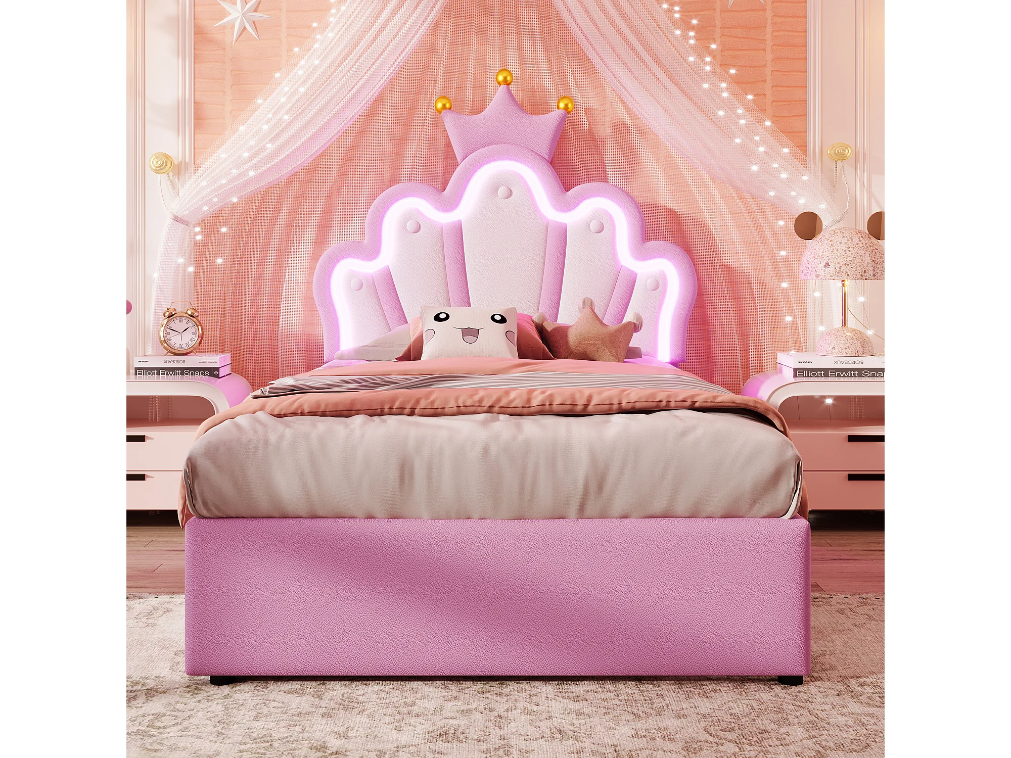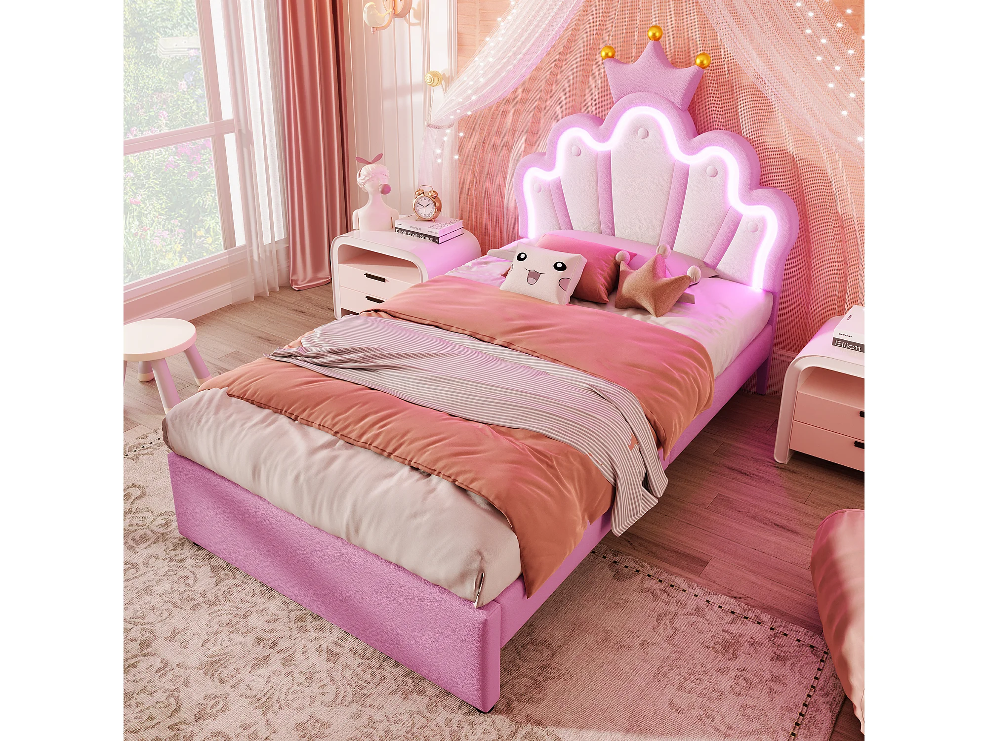 Kinderbett 90 x 200 cm, Stimmungslicht, mit 2 Schubladen, Kronenform, verstellbares Kopfteil, PU, rosa