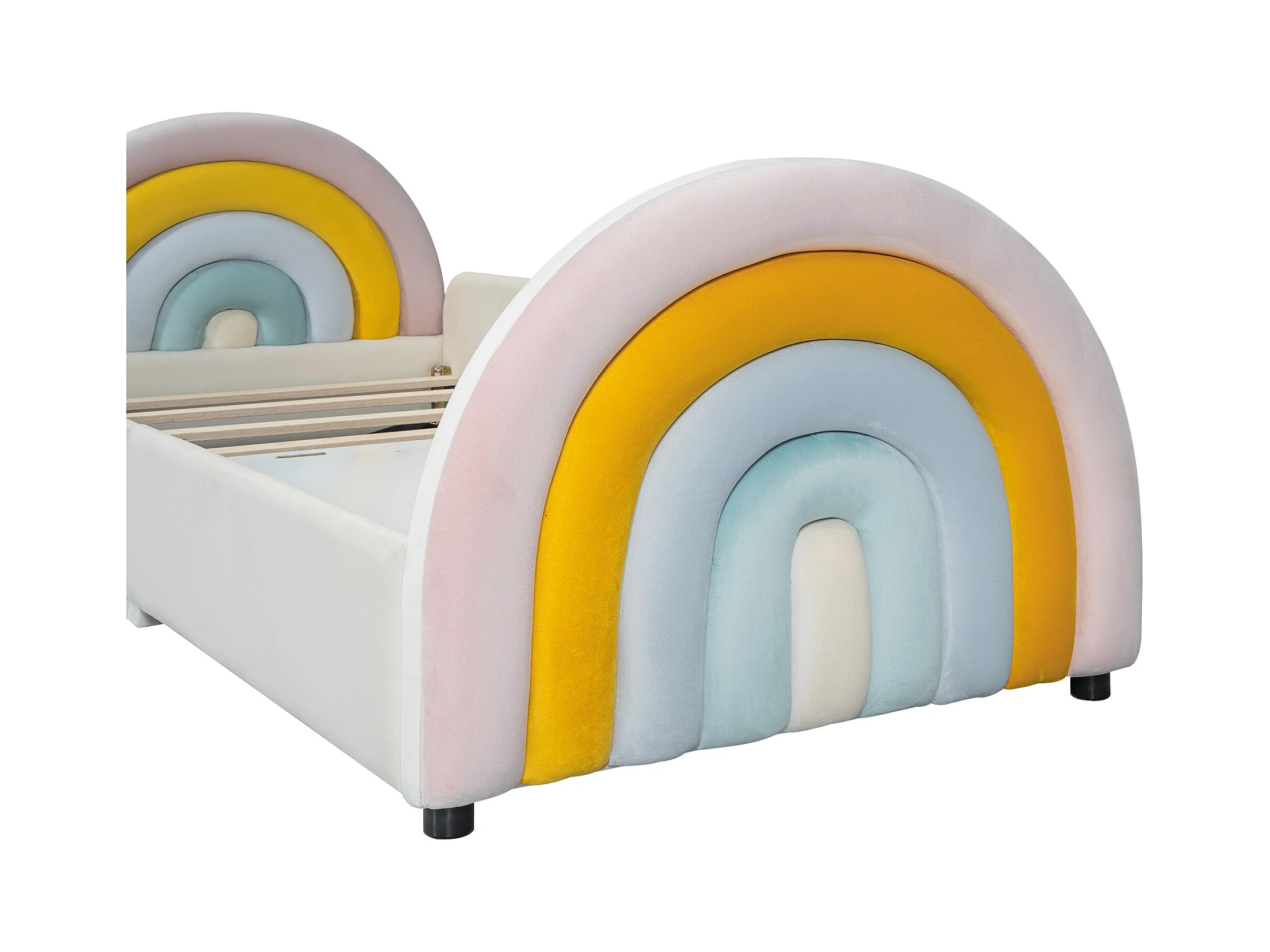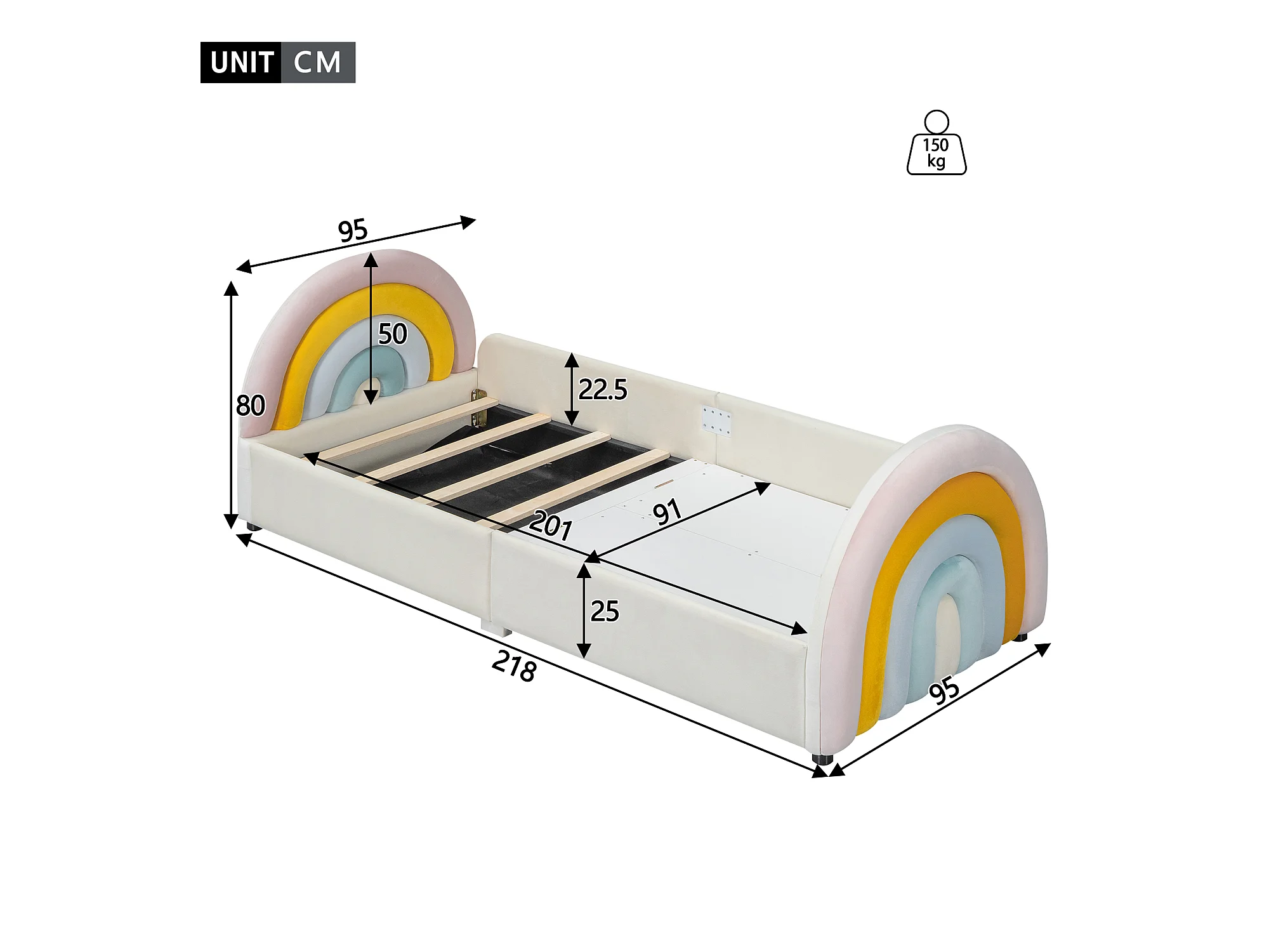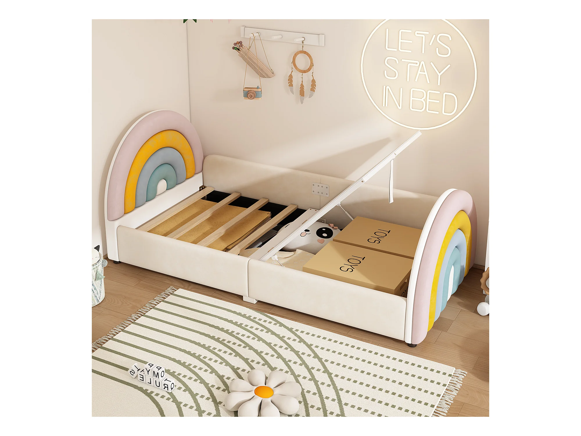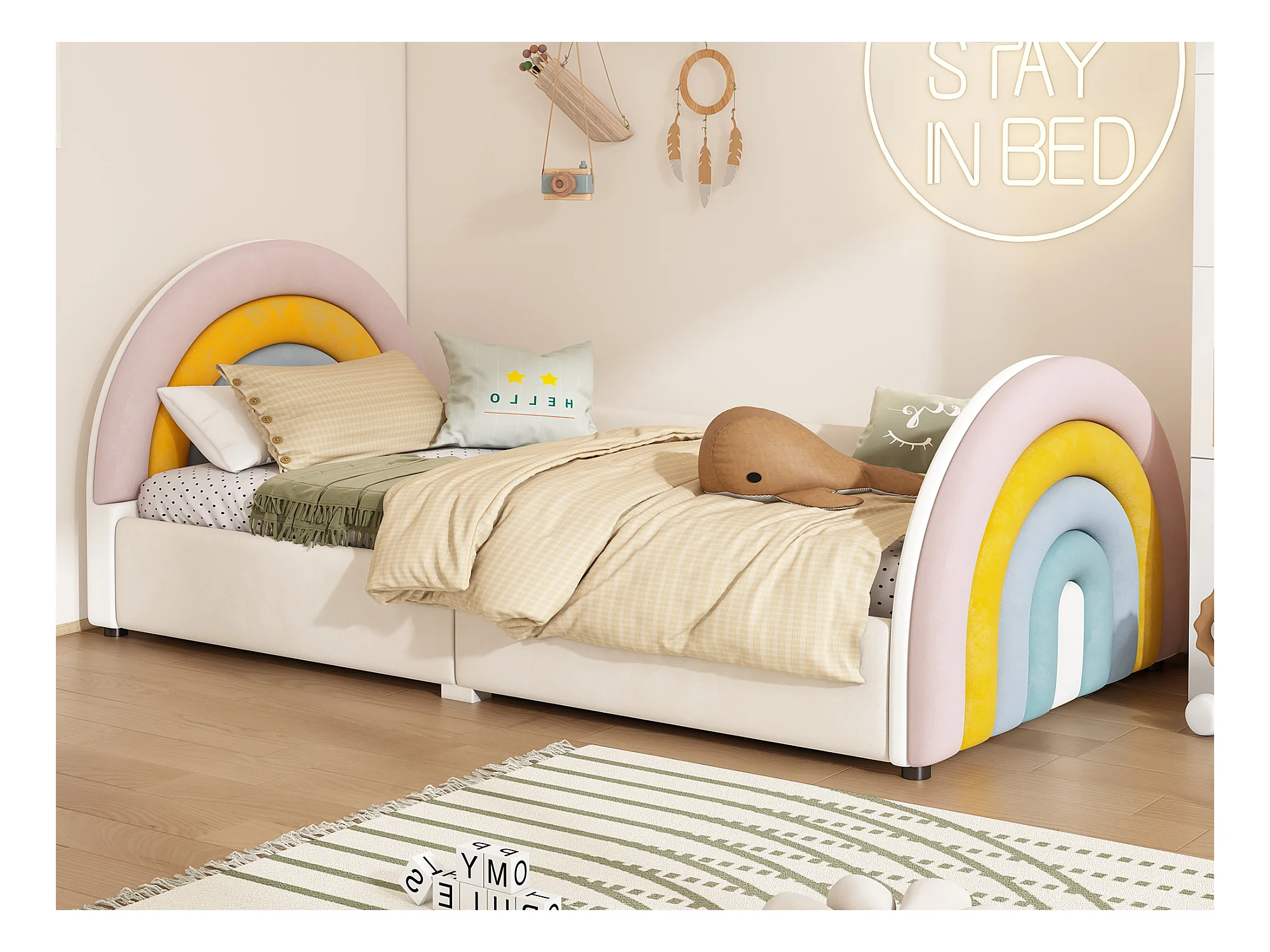 Polsterbett 90 x 200 cm mit Aufbewahrungsbox – Samt und Holz – Regenbogen-Kopfteil – Beige