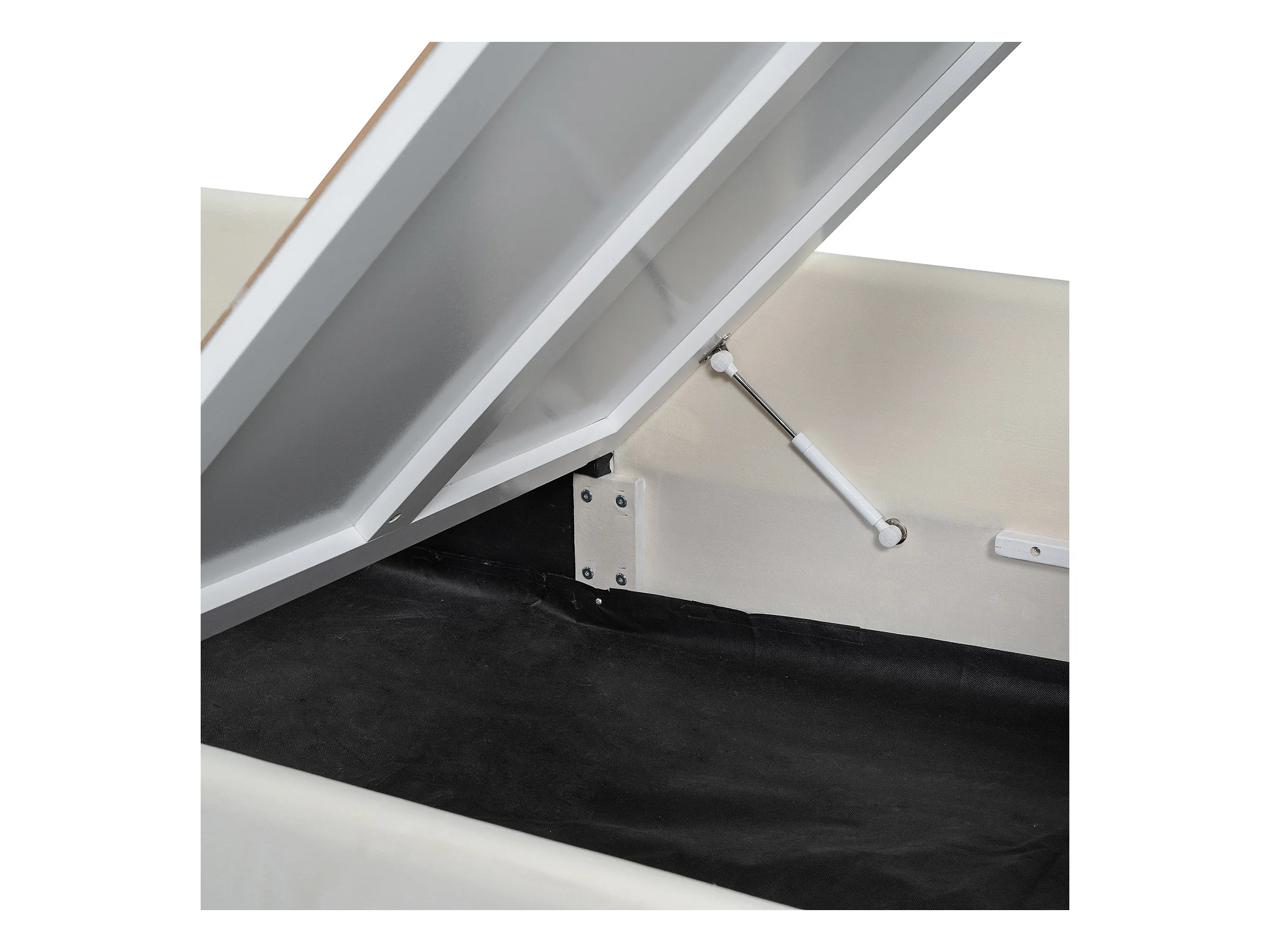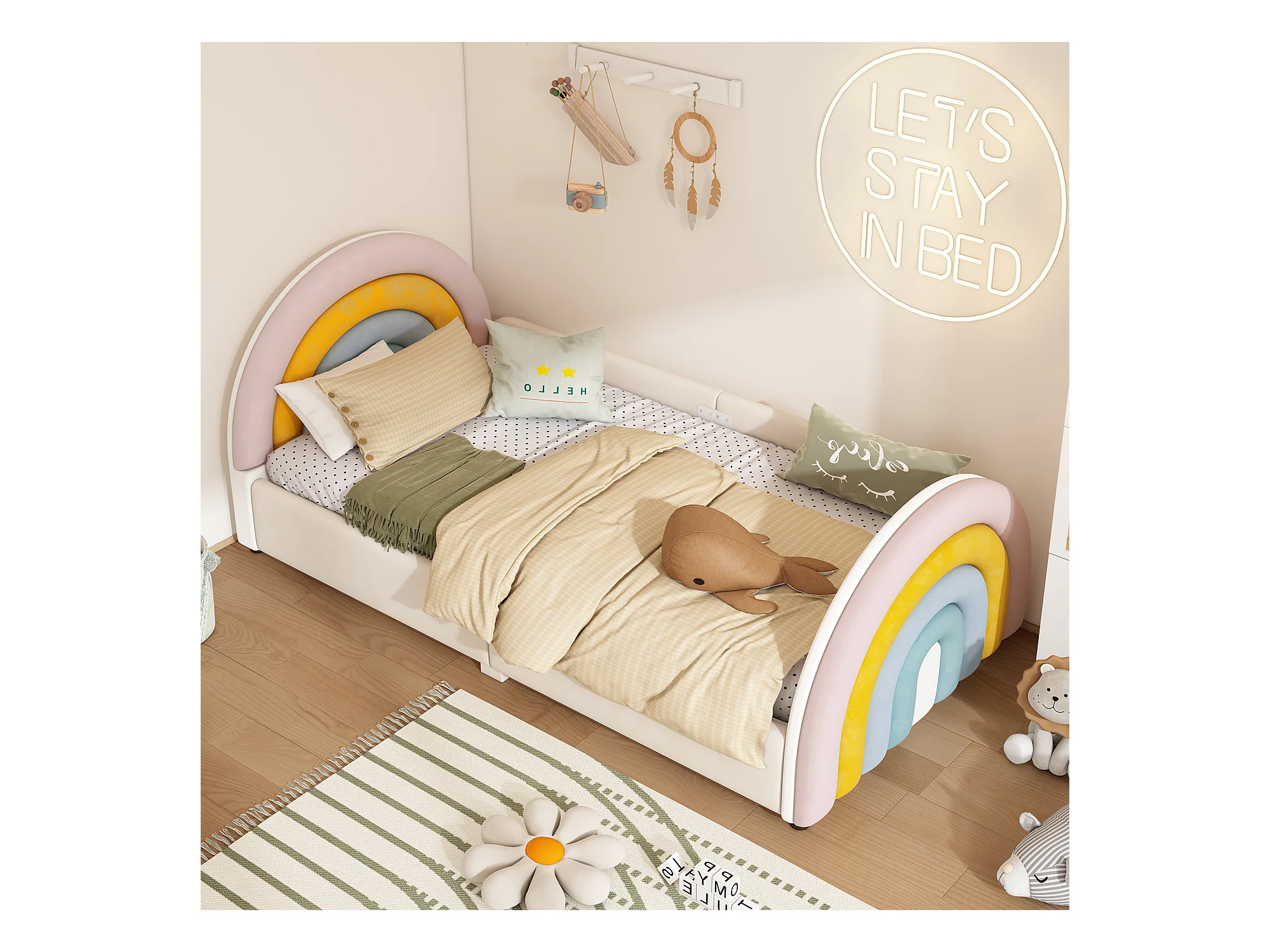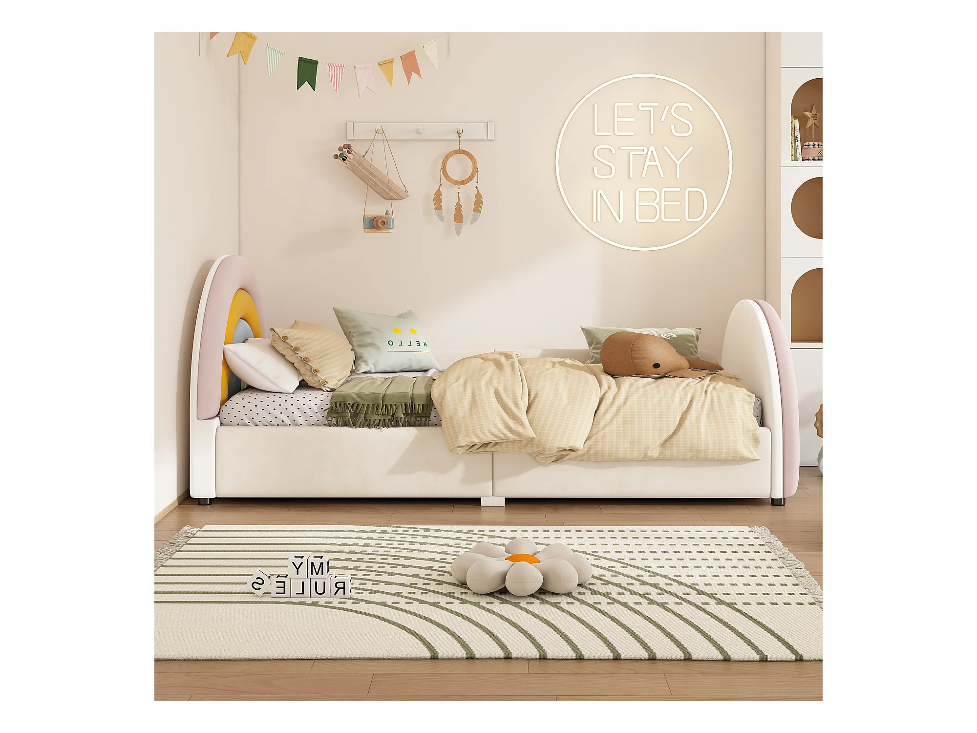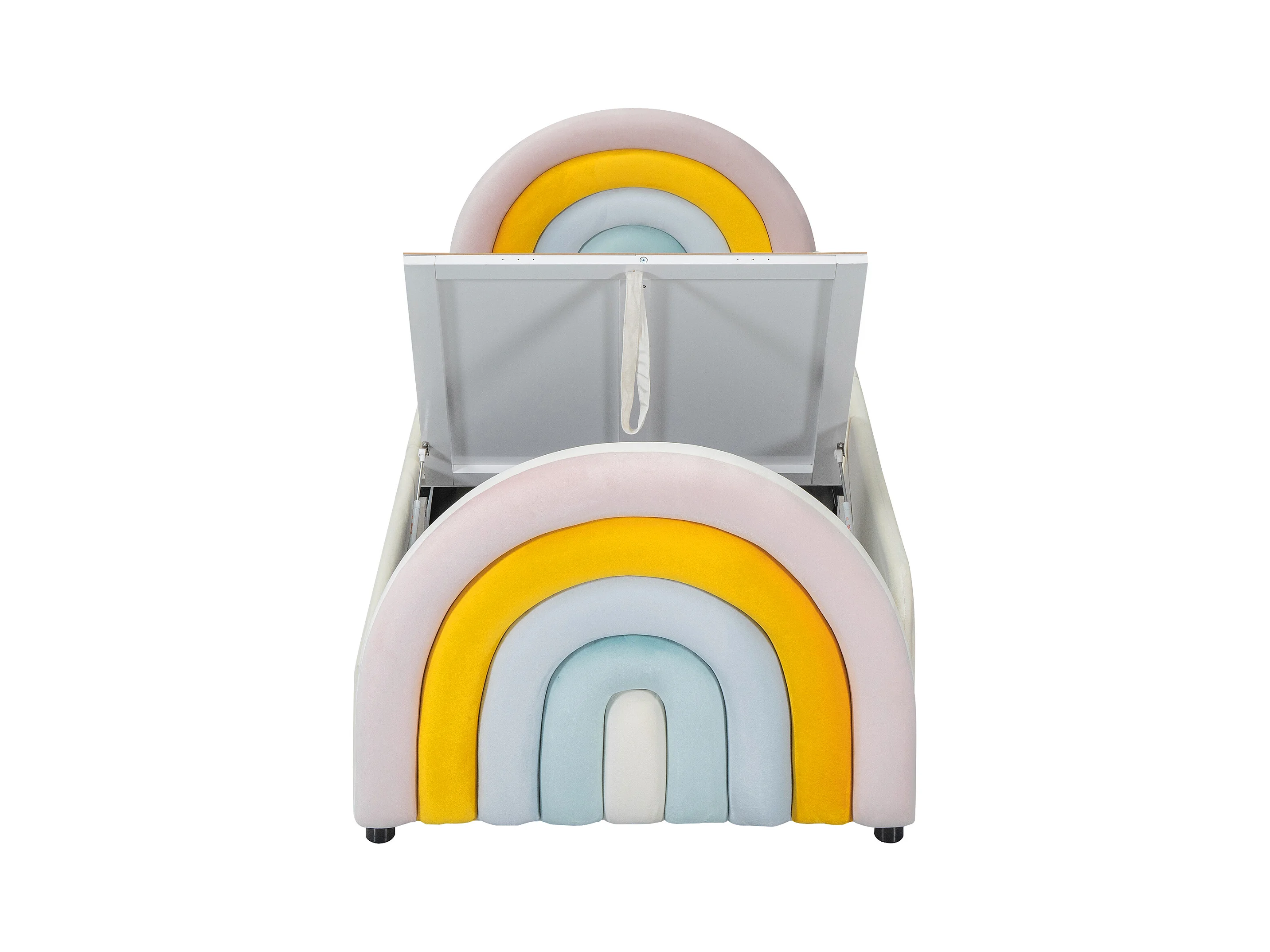 Polsterbett 90 x 200 cm mit Aufbewahrungsbox – Samt und Holz – Regenbogen-Kopfteil – Beige