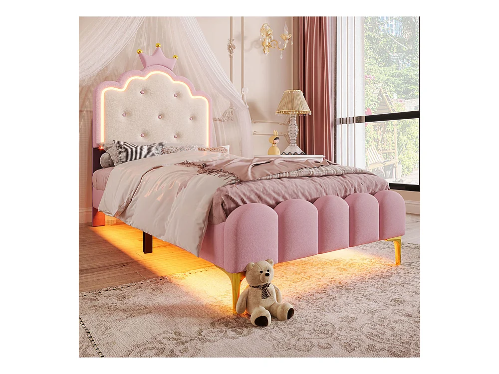 Polsterbett 90 x 200 cm, Stimmungslicht mit Fernbedienung, Krone in Form einer Prinzessin, PU, pink.
