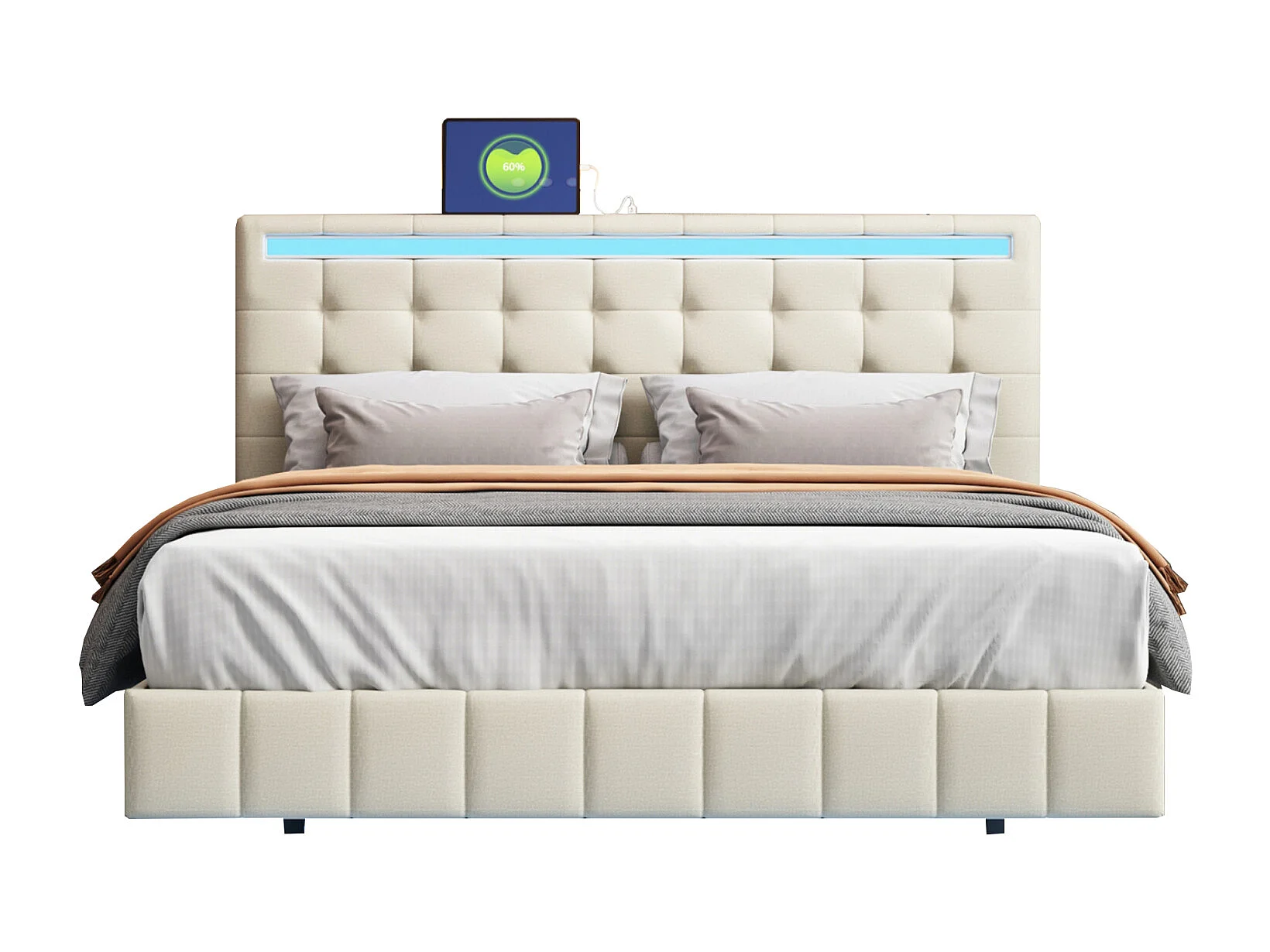 Polsterbett Doppelbett 140 x 200 cm, Schwebebettgestell, Gepolstert, Mit LED, Leinen, Beige