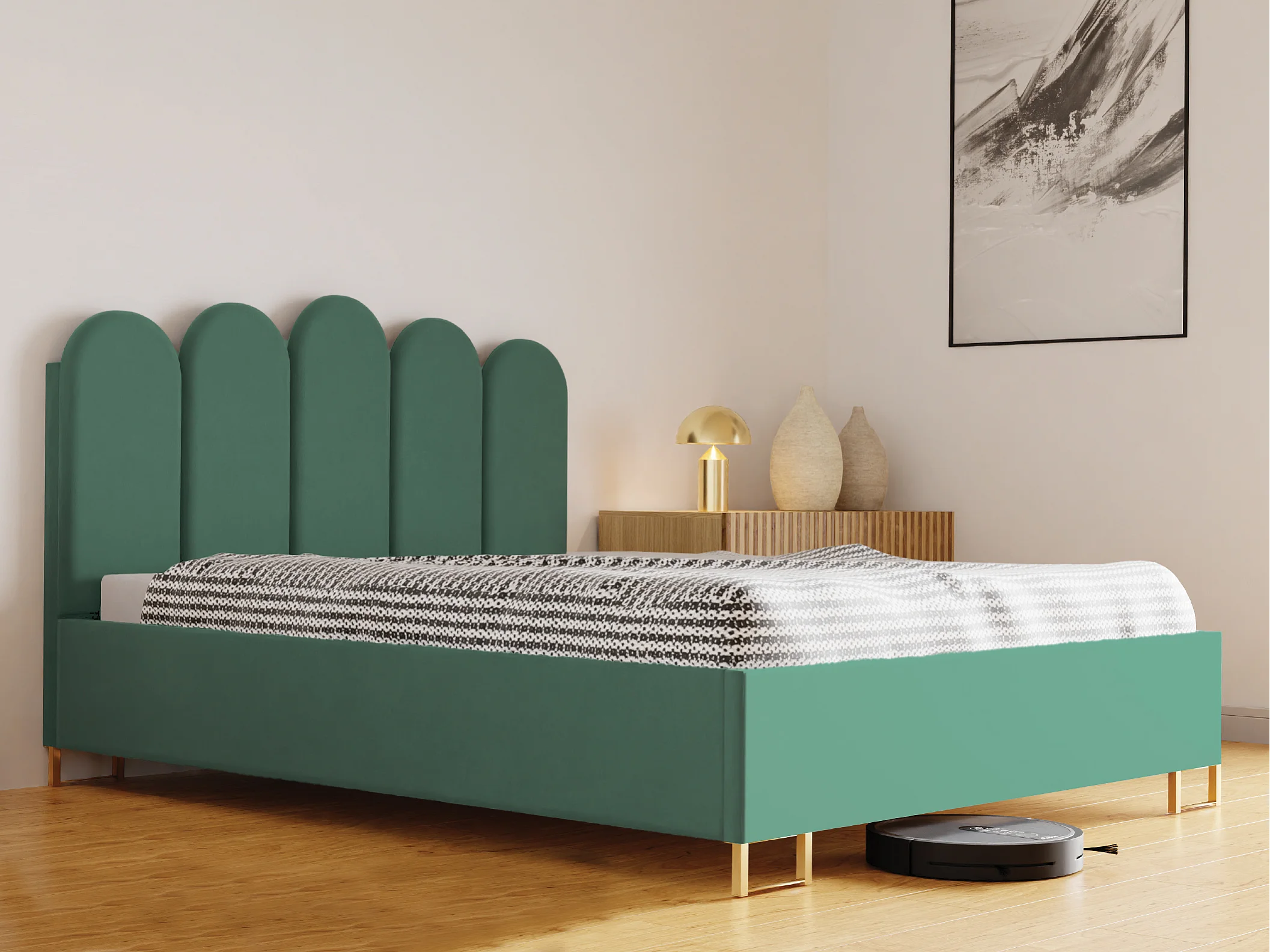 Polsterbett MALAGA mit gepolstertem Kopfteil, ELEMENT-Stoff, Bettkasten mit Gasdruckfeder, Betthöhe 39 cm, 120×200 cm, Seledyn