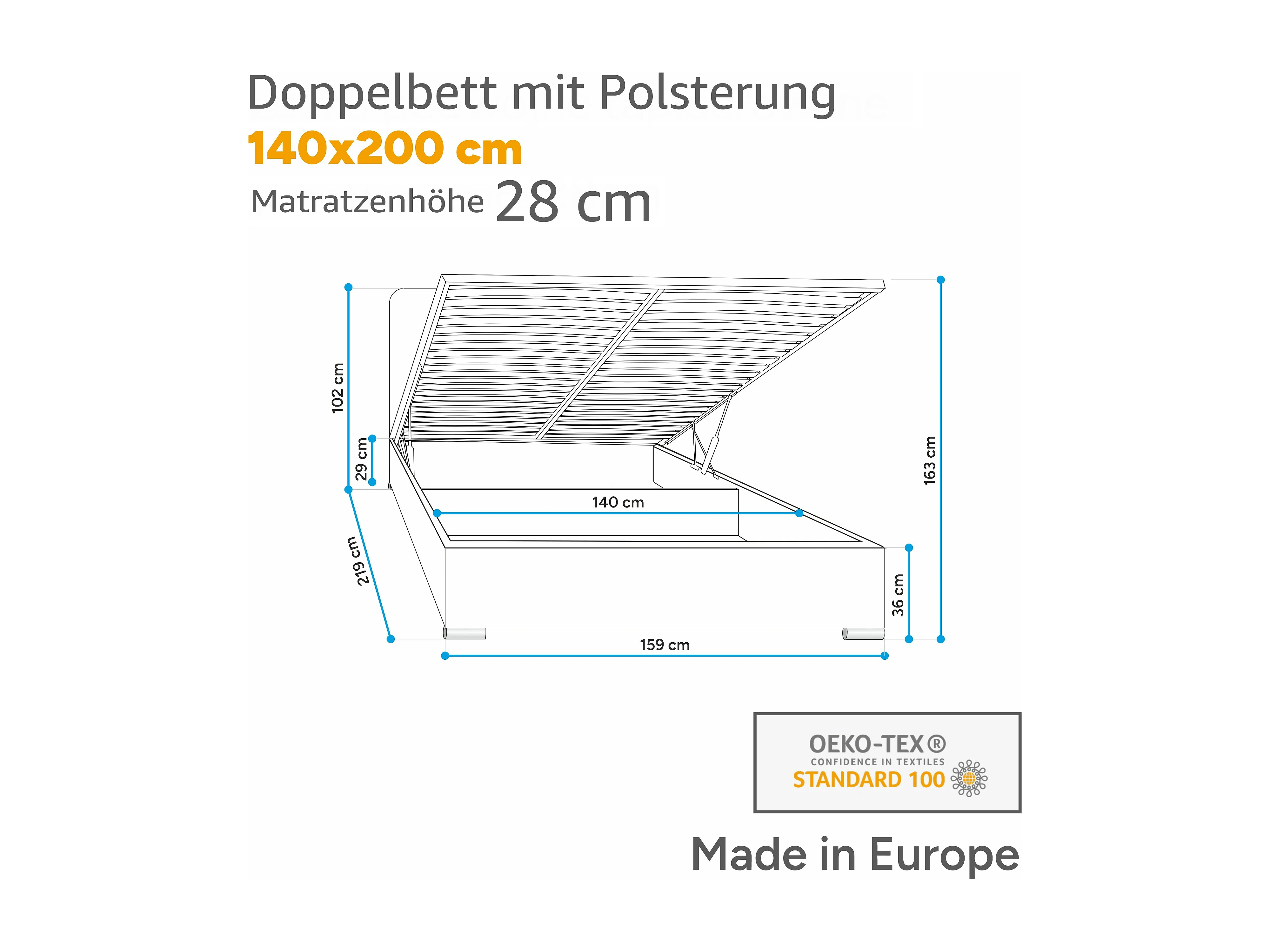 Polsterbett MALAGA mit gepolstertem Kopfteil, ELEMENT-Stoff, Bettkasten mit Gasdruckfeder, Betthöhe 39 cm, 140×200 cm, Blau