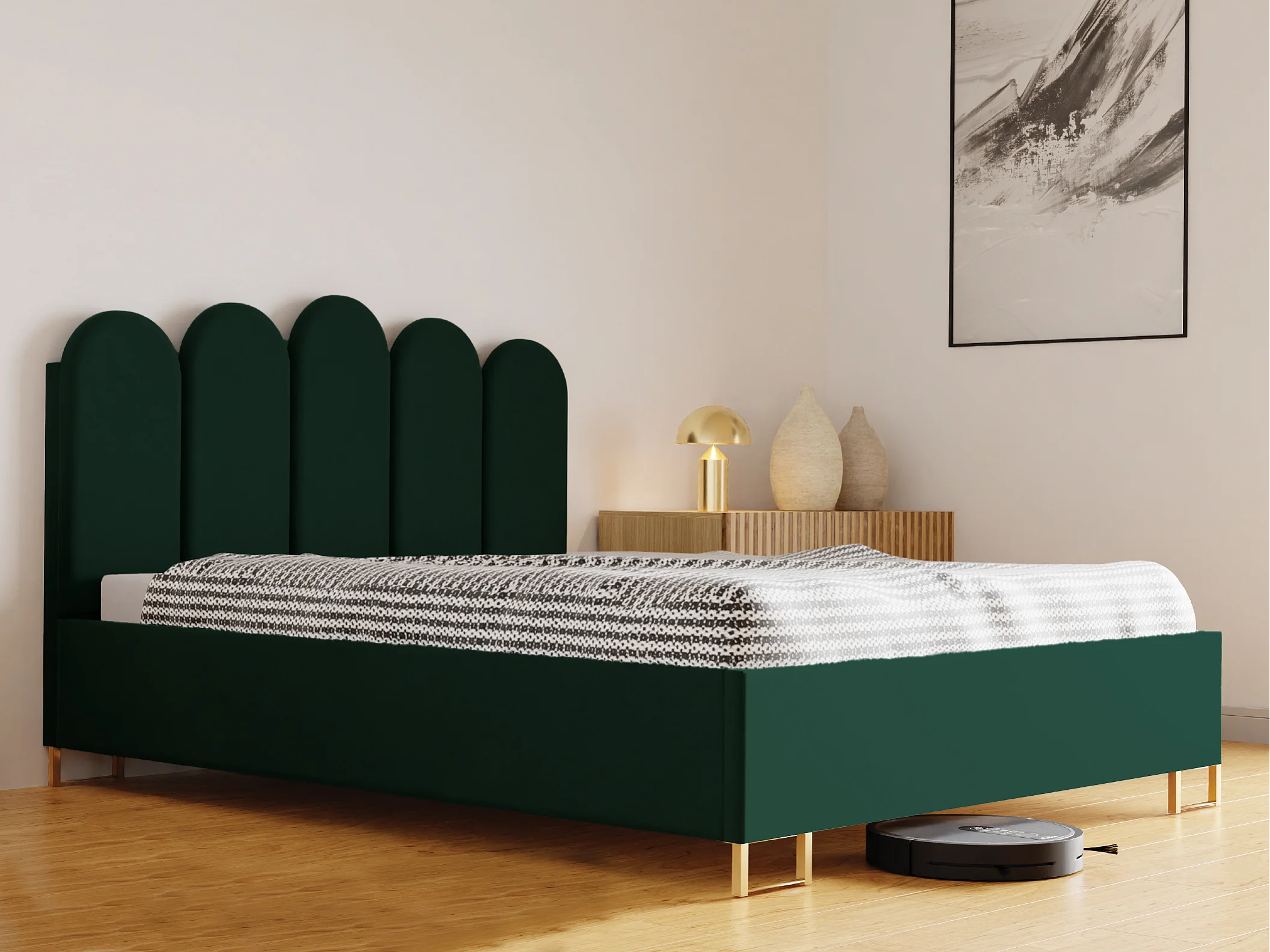 Polsterbett MALAGA mit gepolstertem Kopfteil, ELEMENT-Stoff, Bettkasten mit Gasdruckfeder, Betthöhe 39 cm, 140×200 cm, Grün