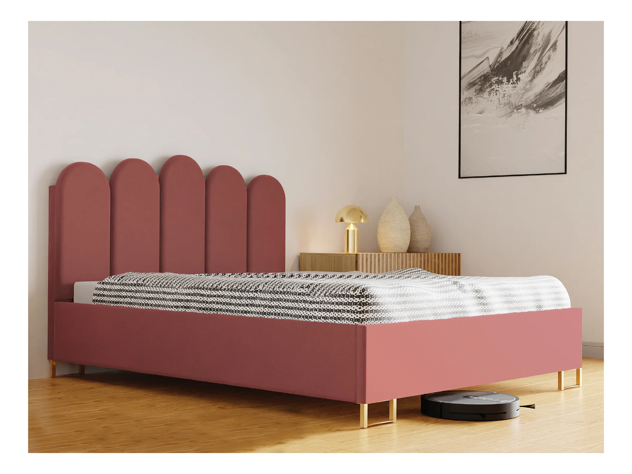 Polsterbett MALAGA mit gepolstertem Kopfteil, ELEMENT-Stoff, Bettkasten mit Gasdruckfeder, Betthöhe 39 cm, 140×200 cm, Rosa