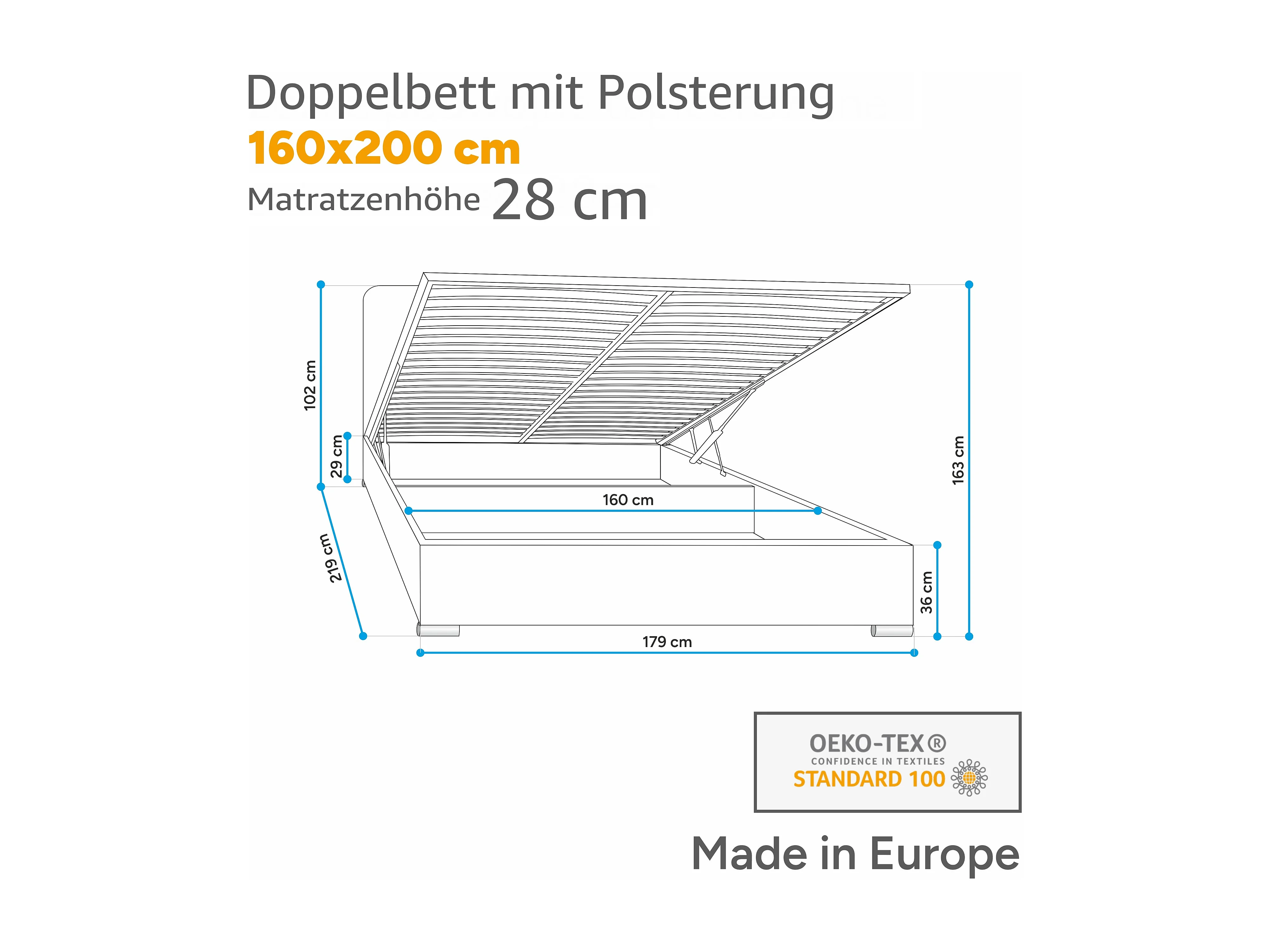 Polsterbett MALAGA mit gepolstertem Kopfteil, ELEMENT-Stoff, Bettkasten mit Gasdruckfeder, Betthöhe 39 cm, 160×200 cm, Seledyn