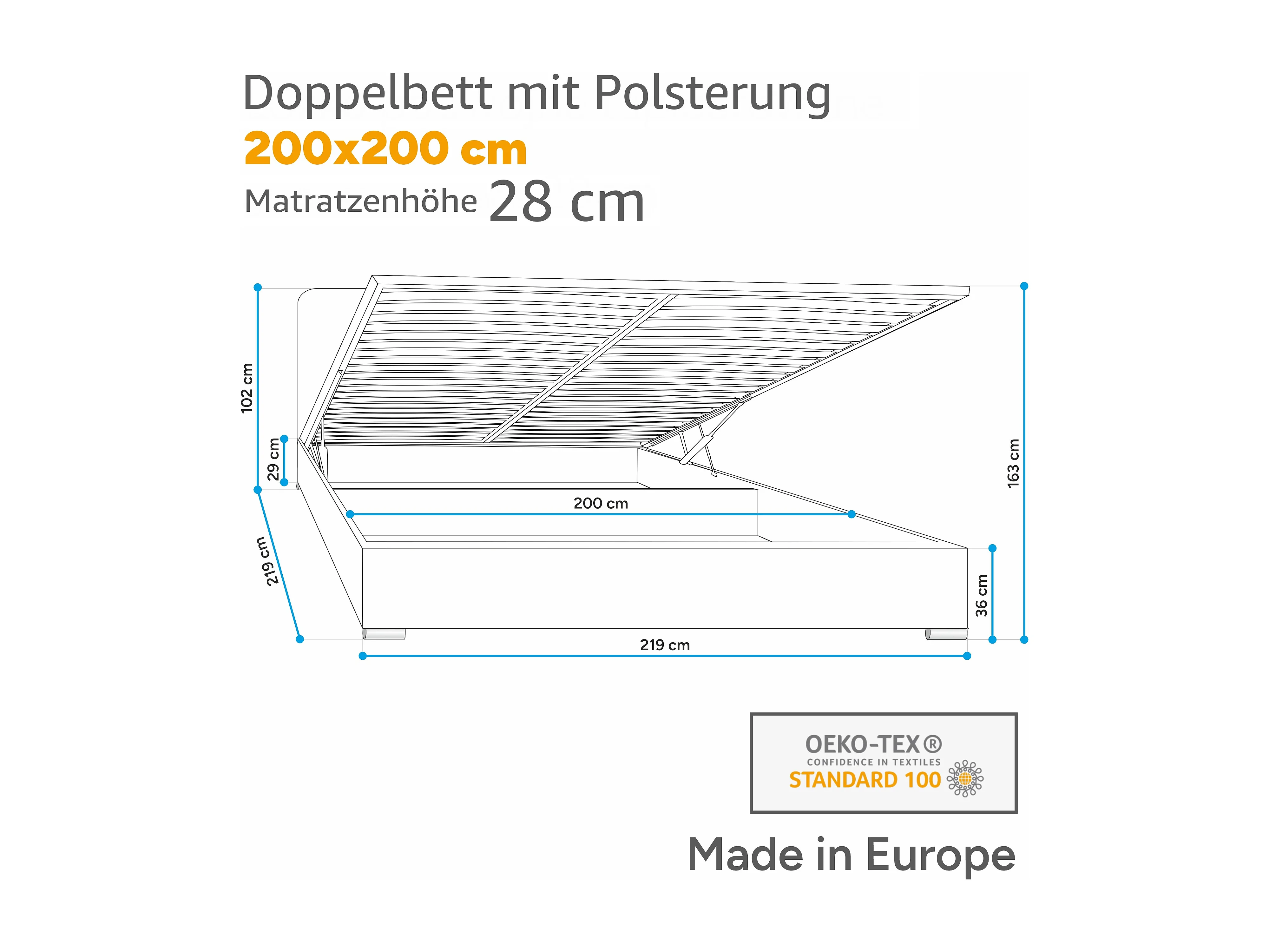 Polsterbett MALAGA mit gepolstertem Kopfteil, ELEMENT-Stoff, Bettkasten mit Gasdruckfeder, Betthöhe 39 cm, 200×200 cm, Anthrazit